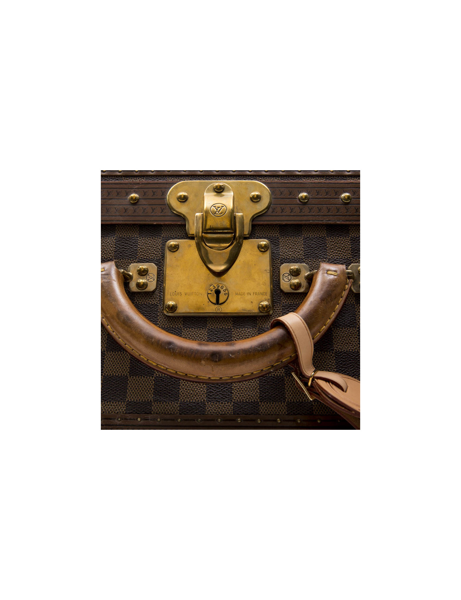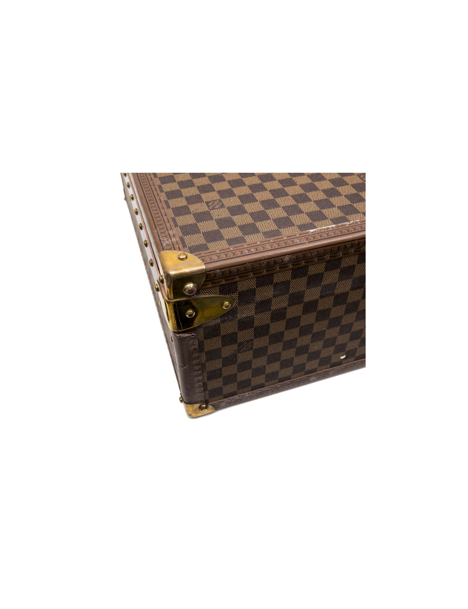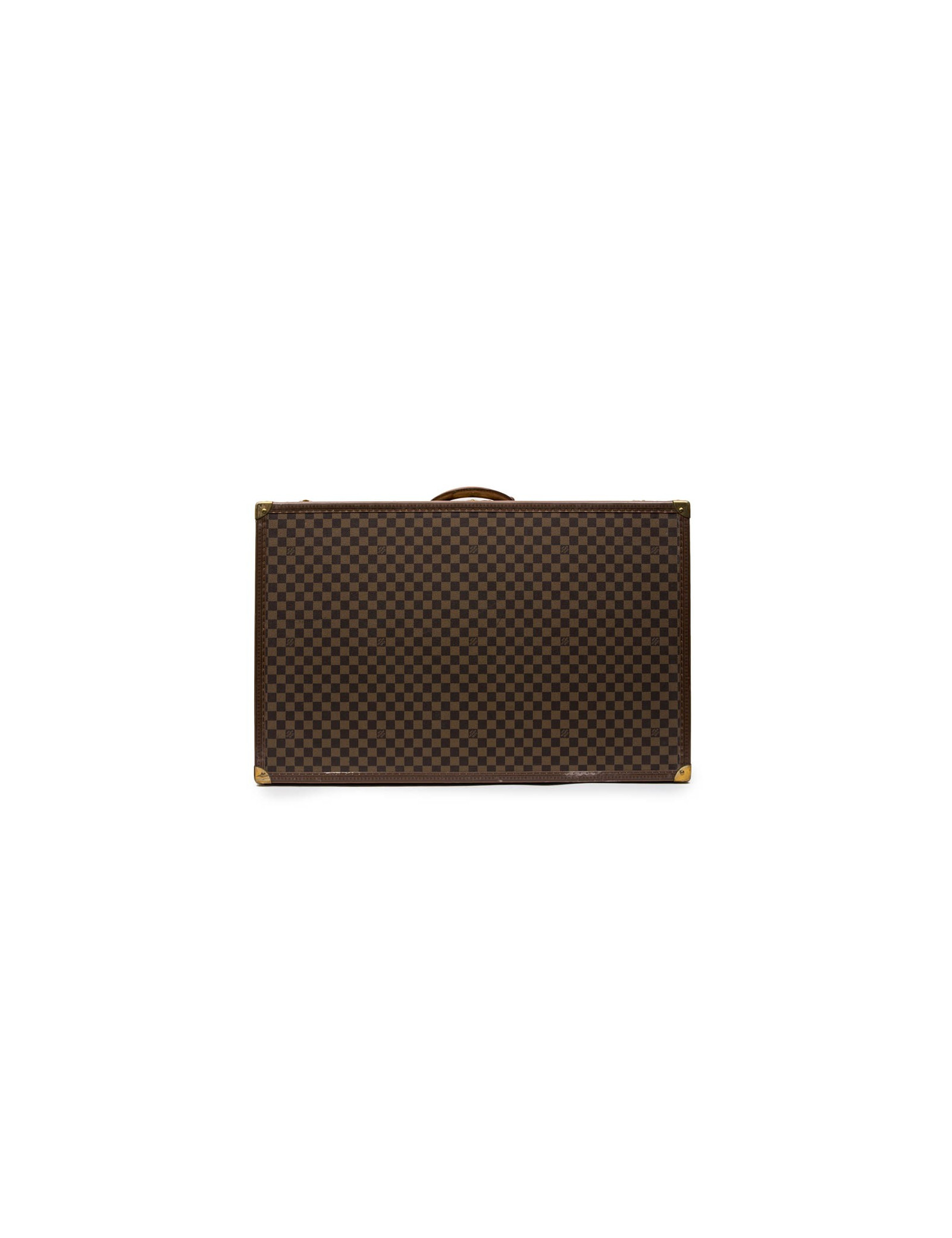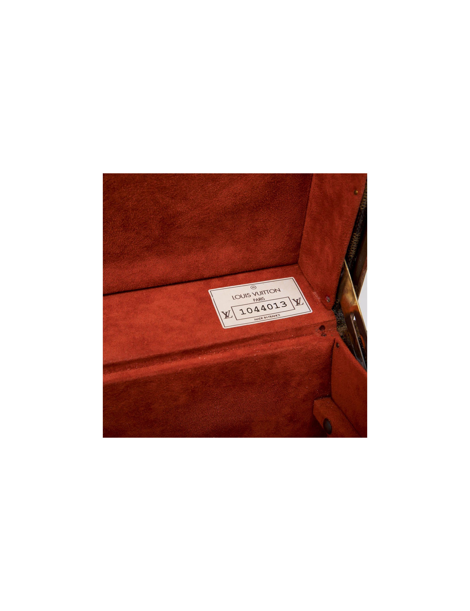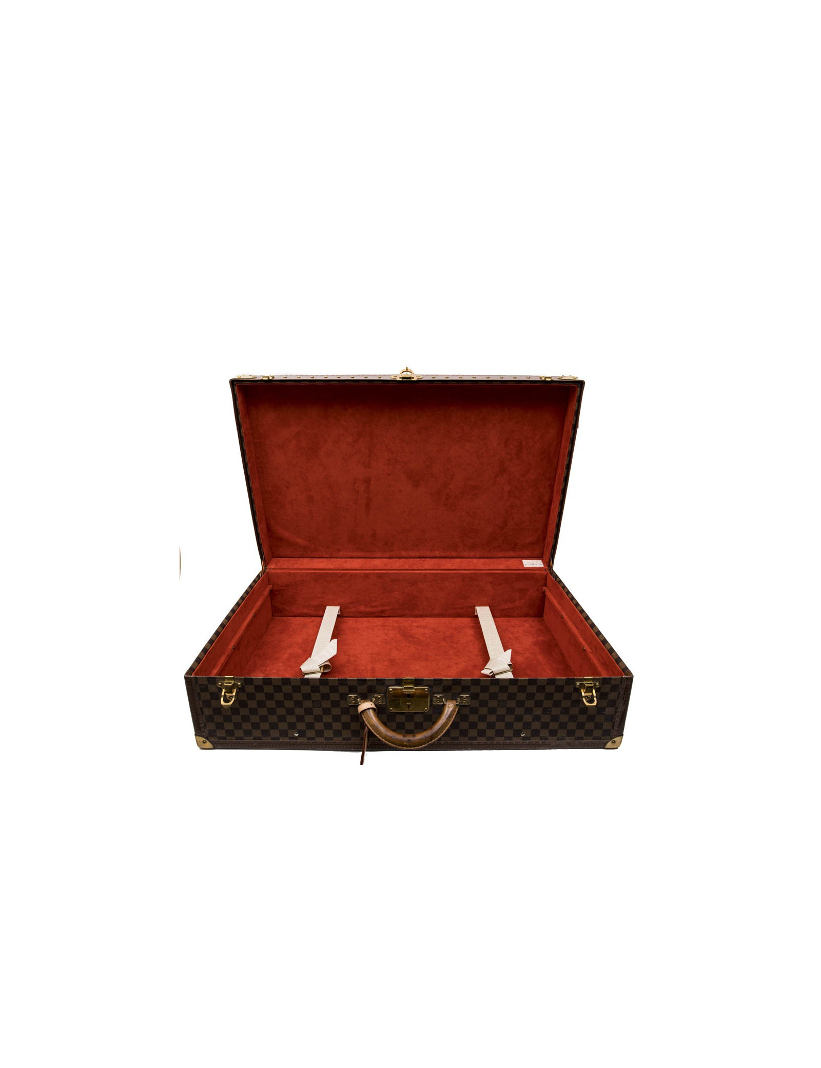 Louis Vuitton suitcase in Damier Ebène canvas with red microfiber fiber lining. The handles are rounded in natural cowhide leather.