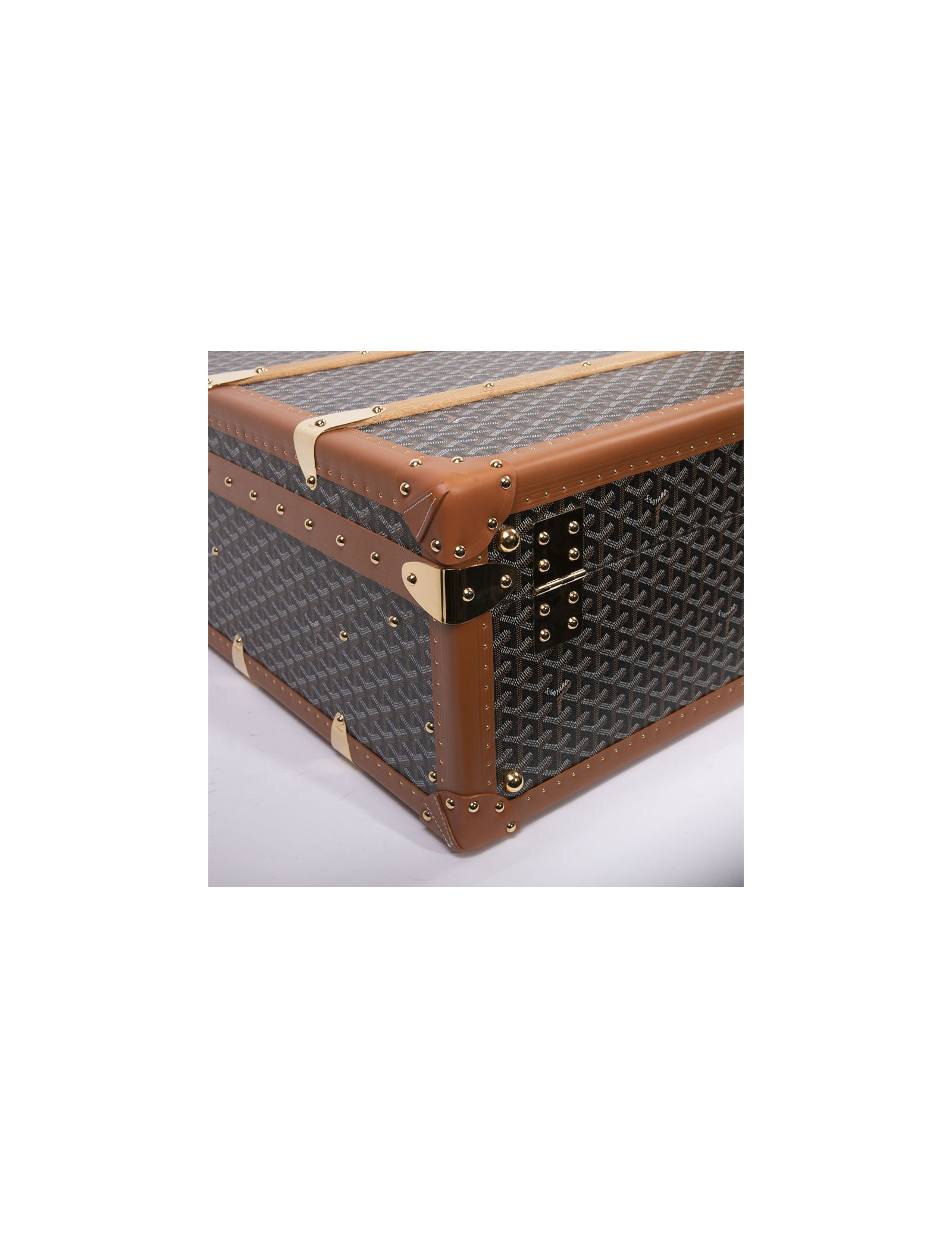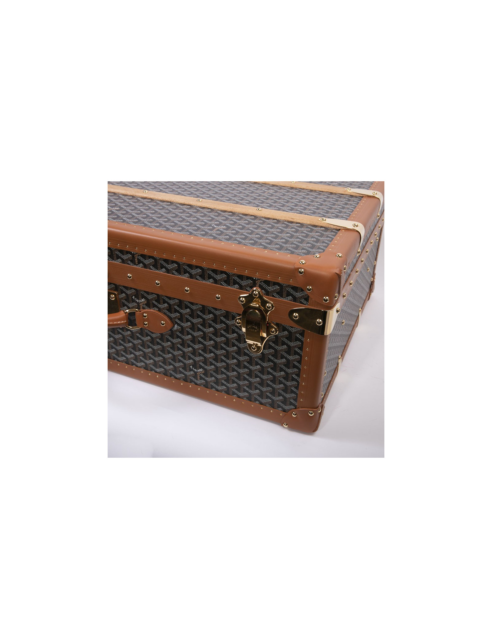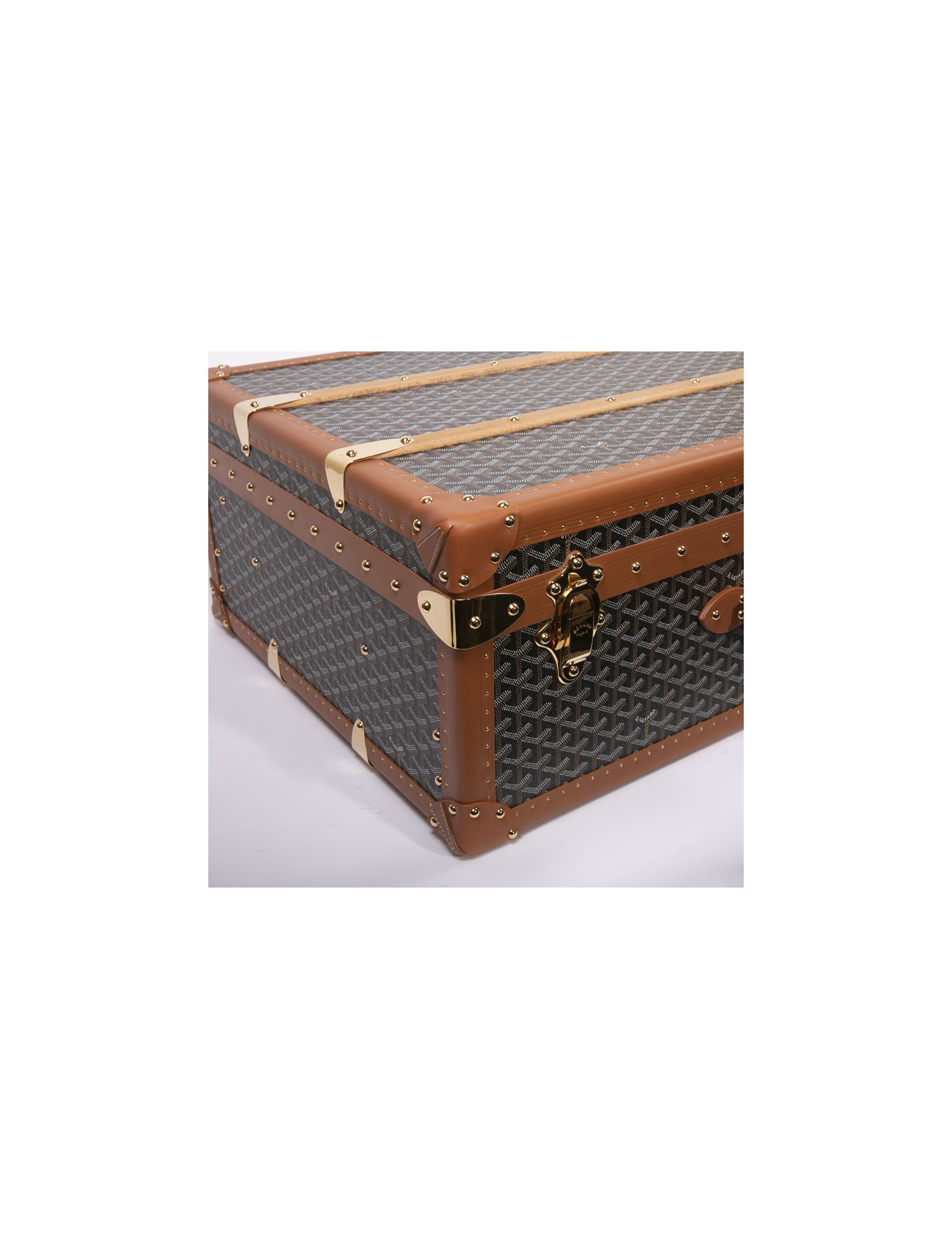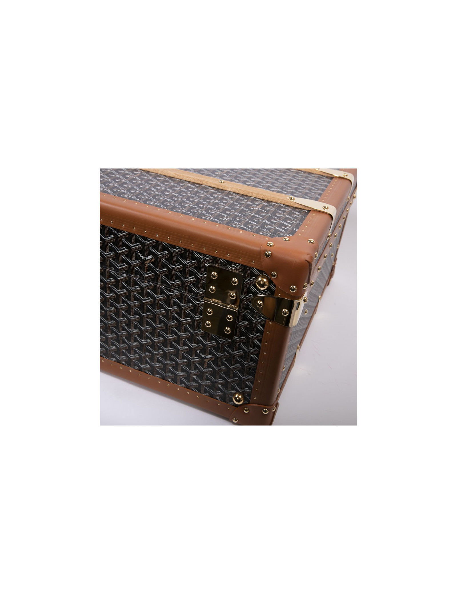 Goyard large travel trunk (hard suitcase) in brown monogrammed canvas with brown and black herringbone and light brown cowhide trim with gold metal rivet.