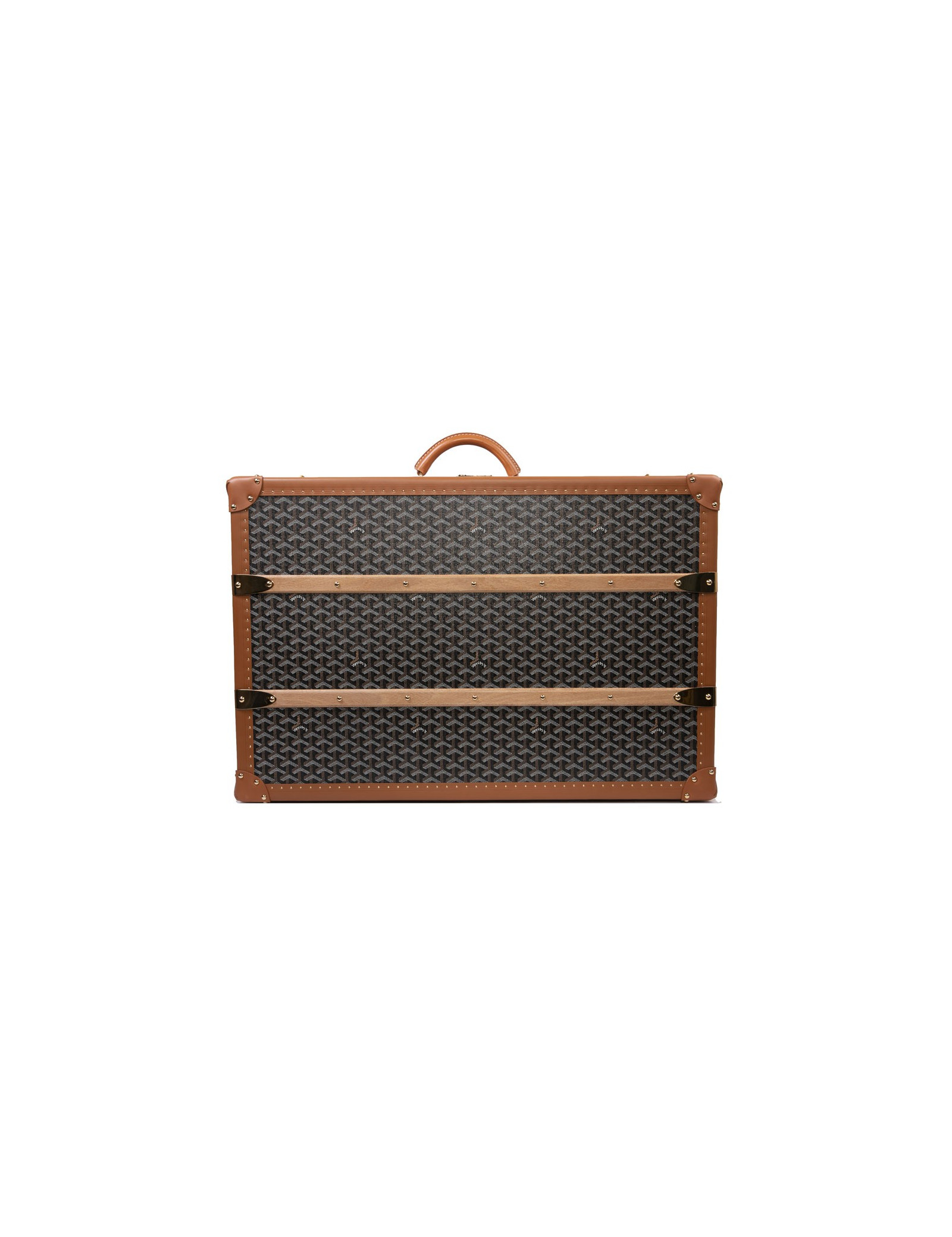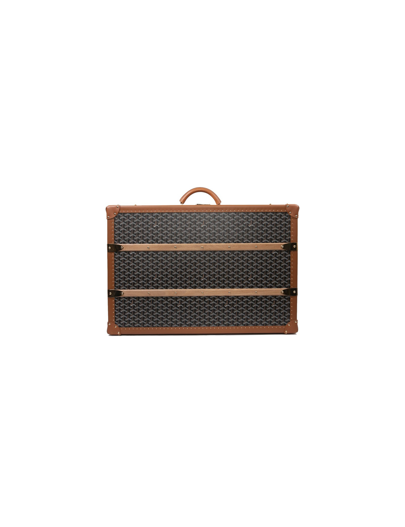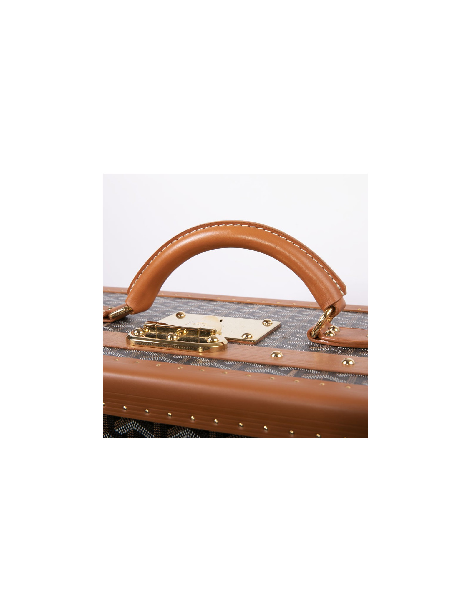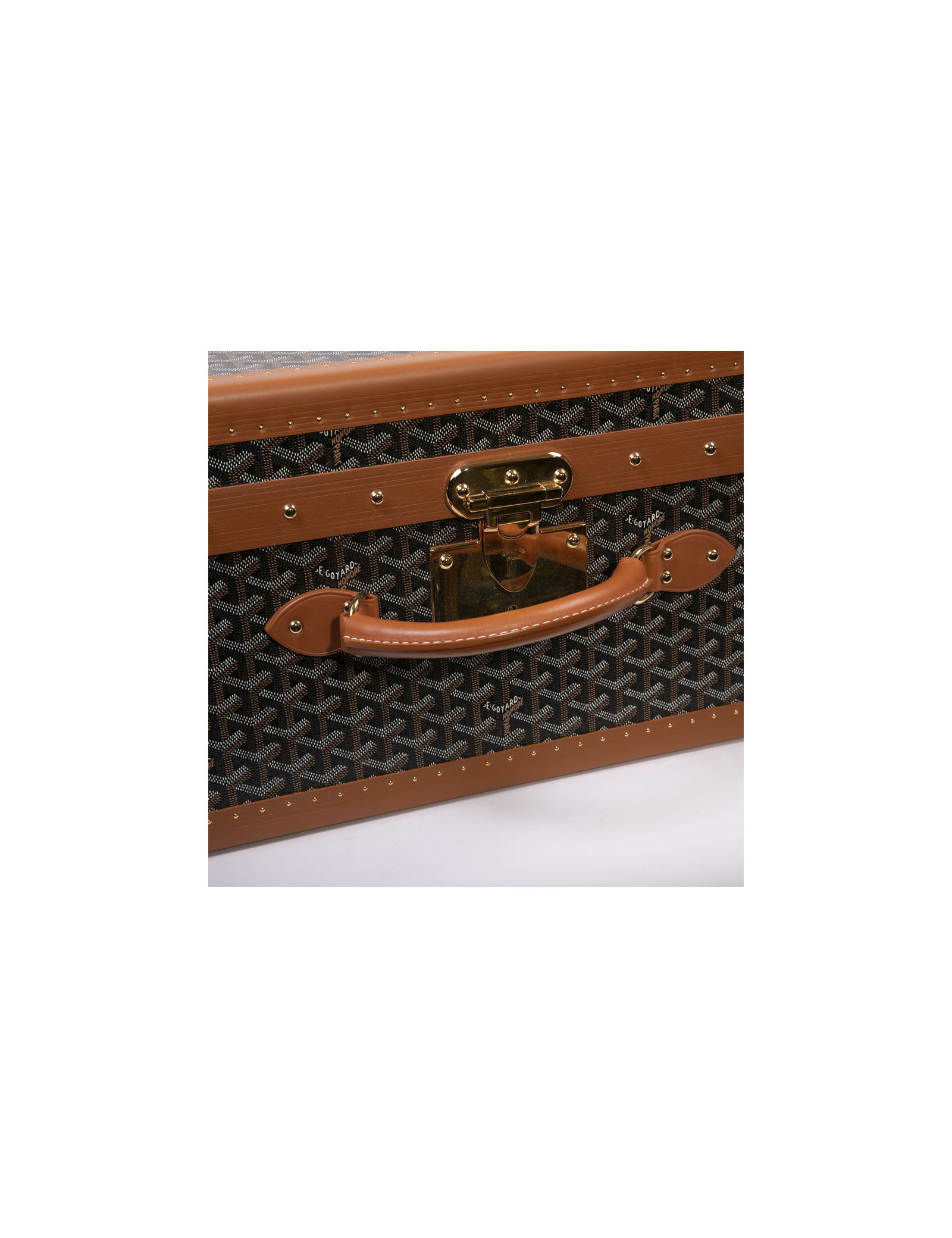 Goyard large travel trunk (hard suitcase) in brown monogrammed canvas with brown and black herringbone and light brown cowhide trim with gold metal rivet.