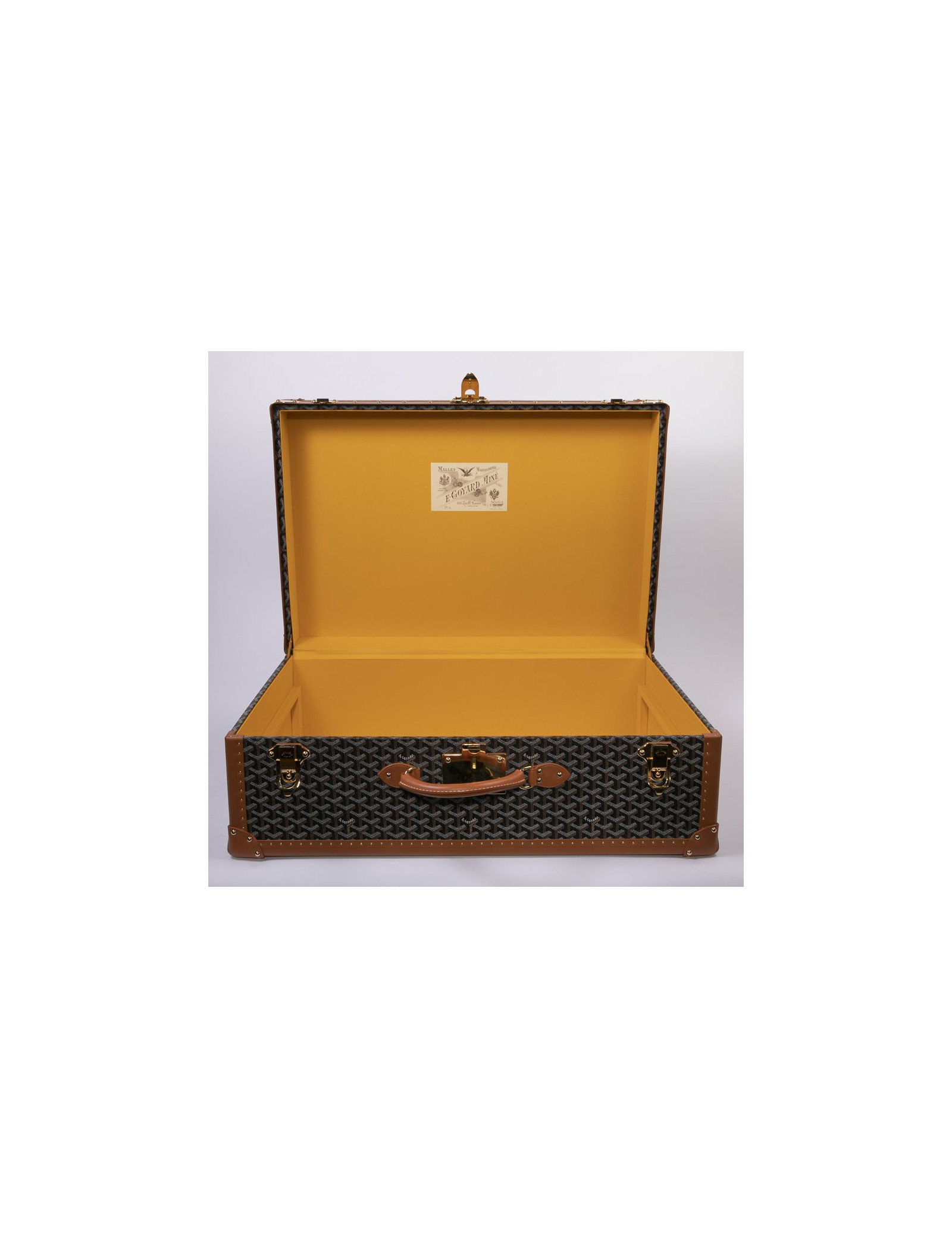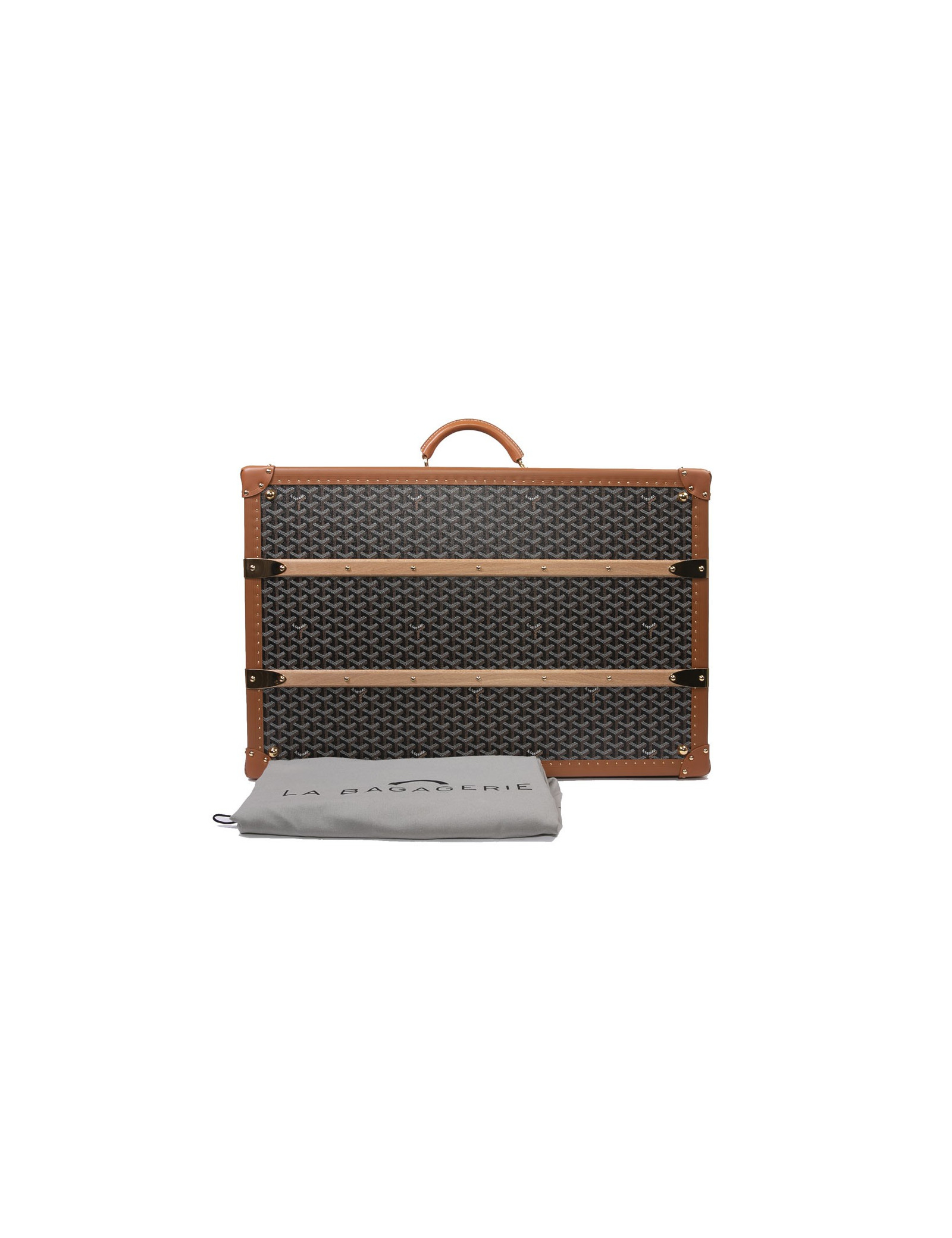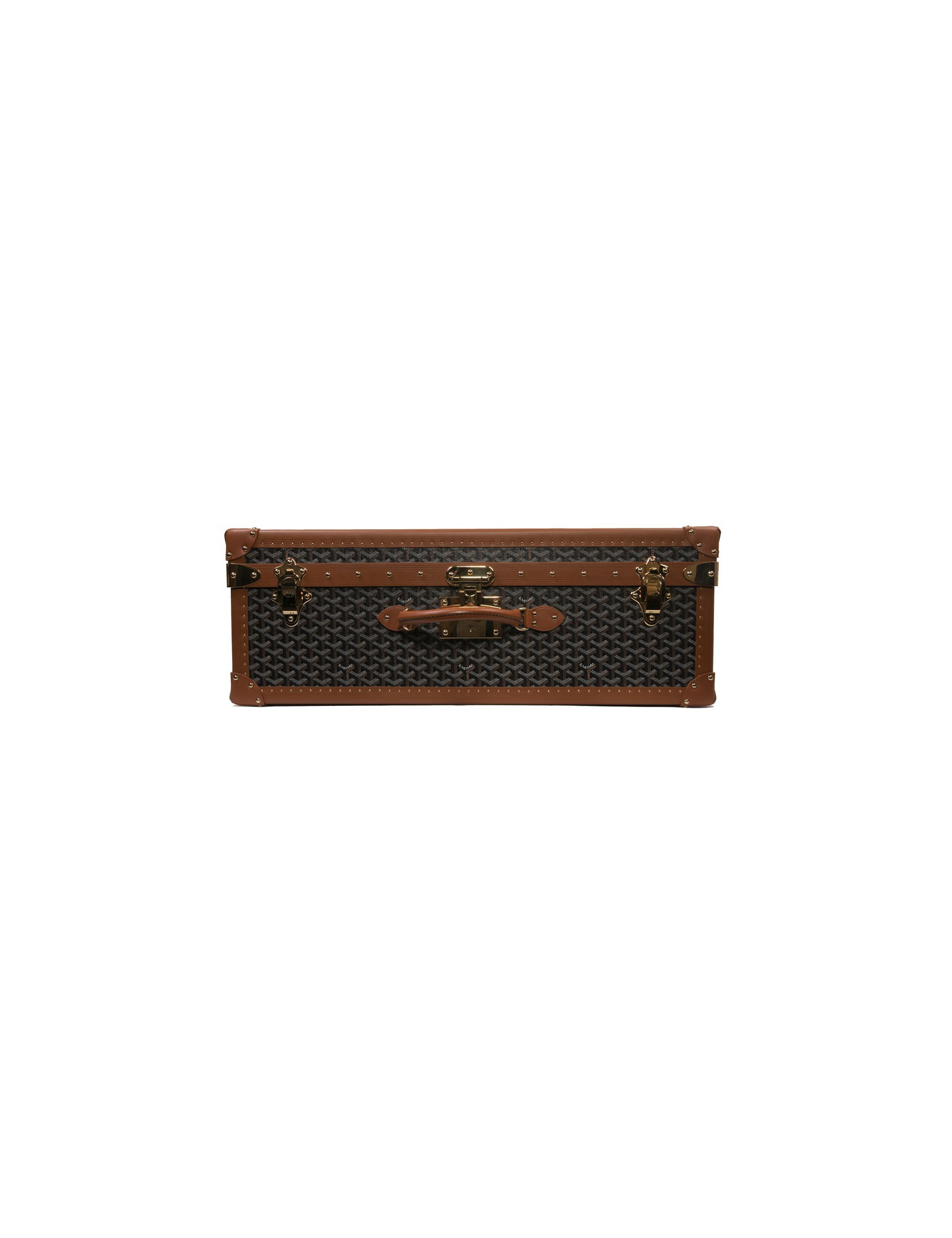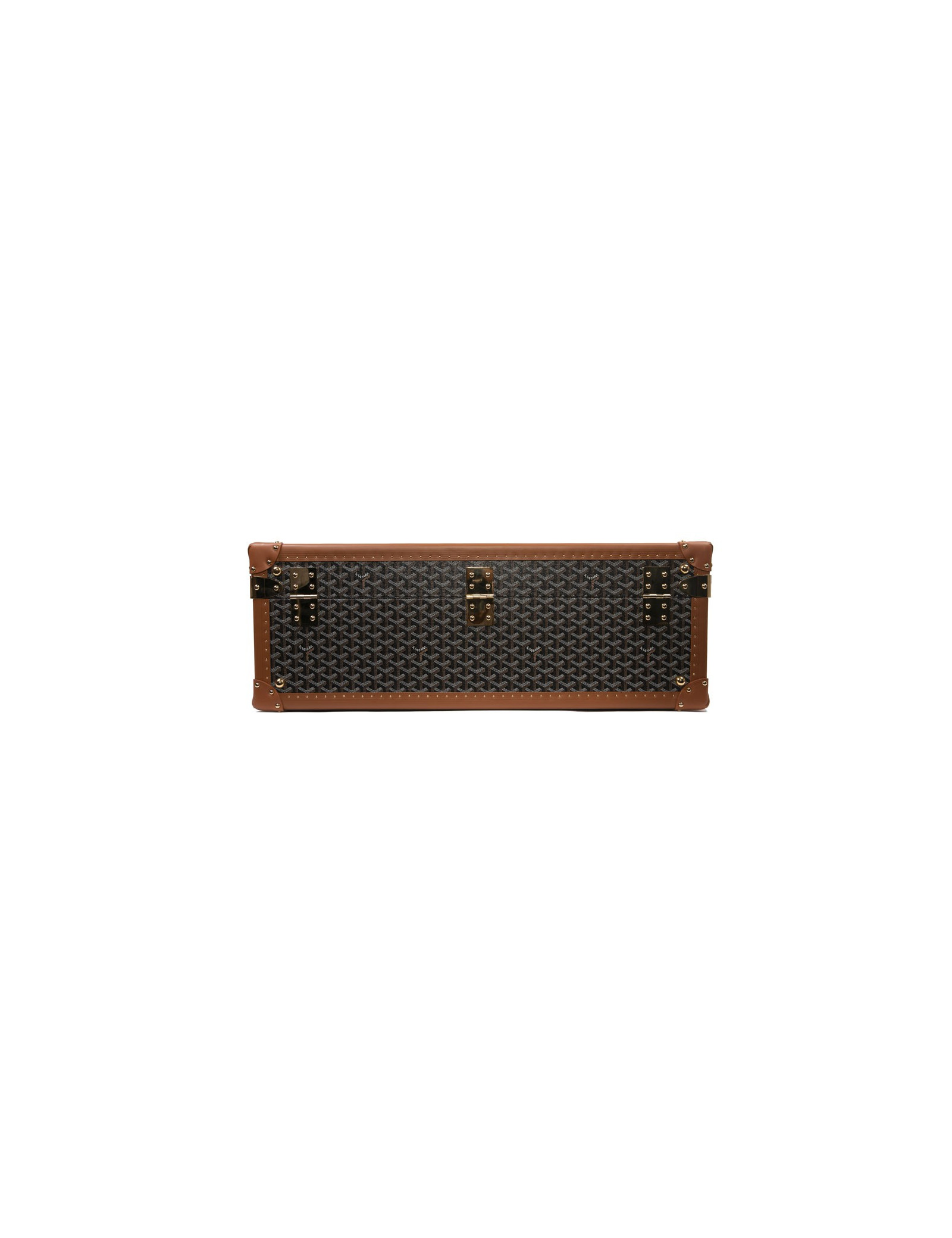 Goyard large travel trunk (hard suitcase) in brown monogrammed canvas with brown and black herringbone and light brown cowhide trim with gold metal rivet.