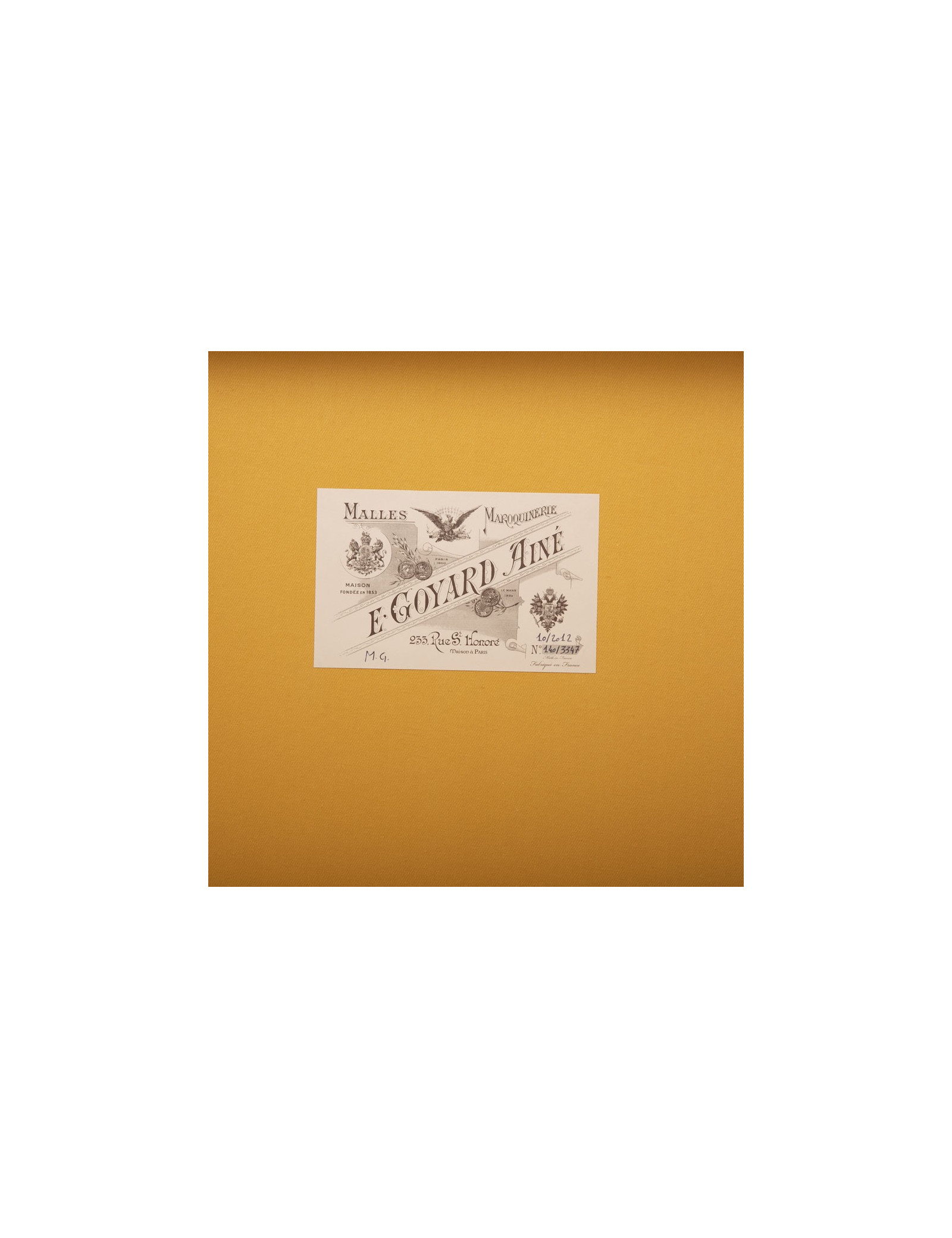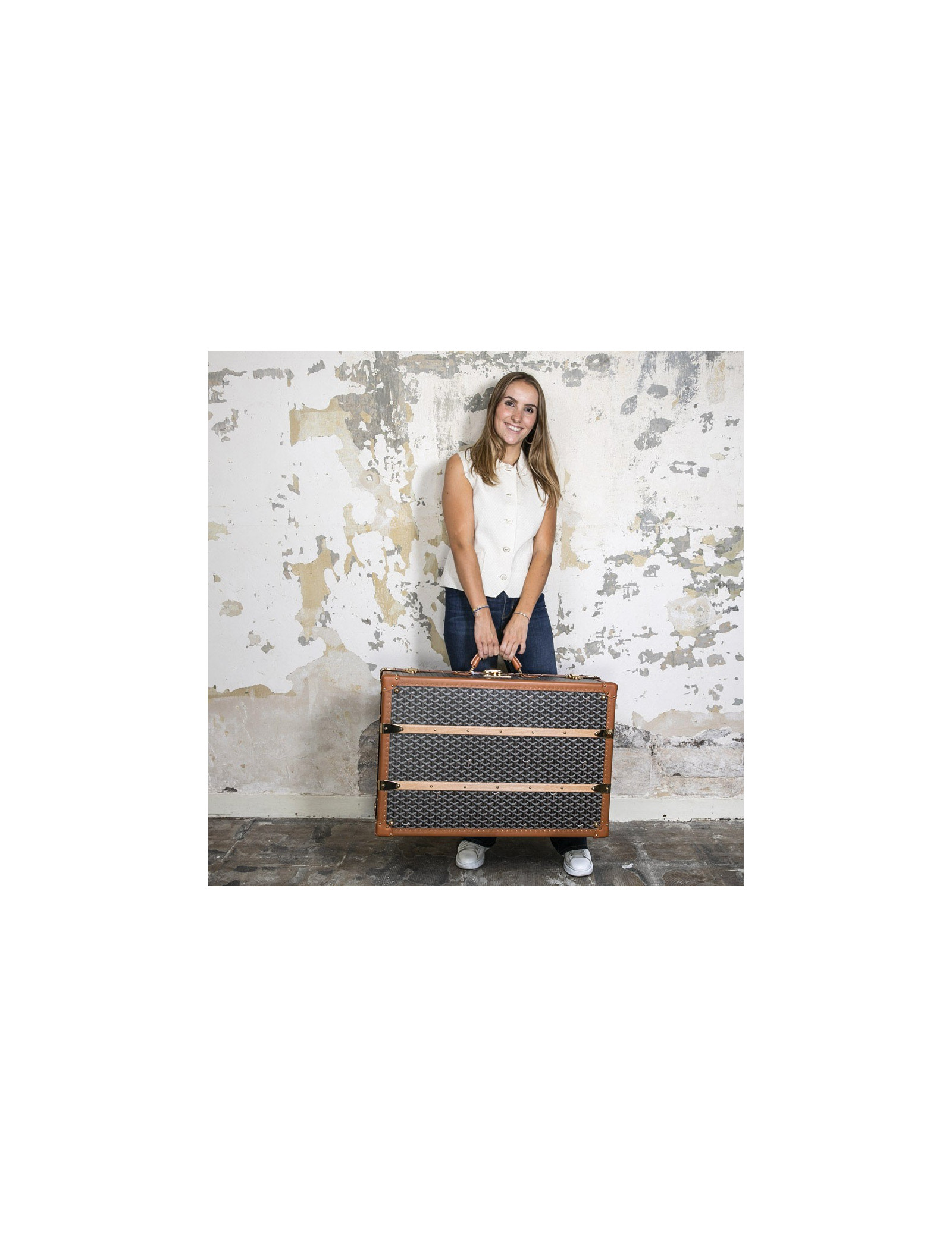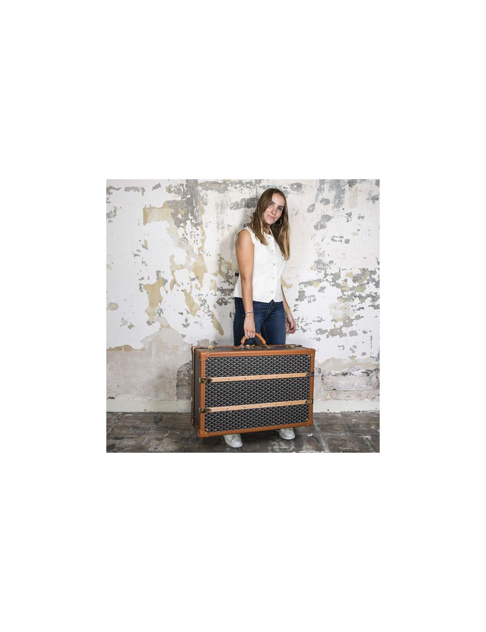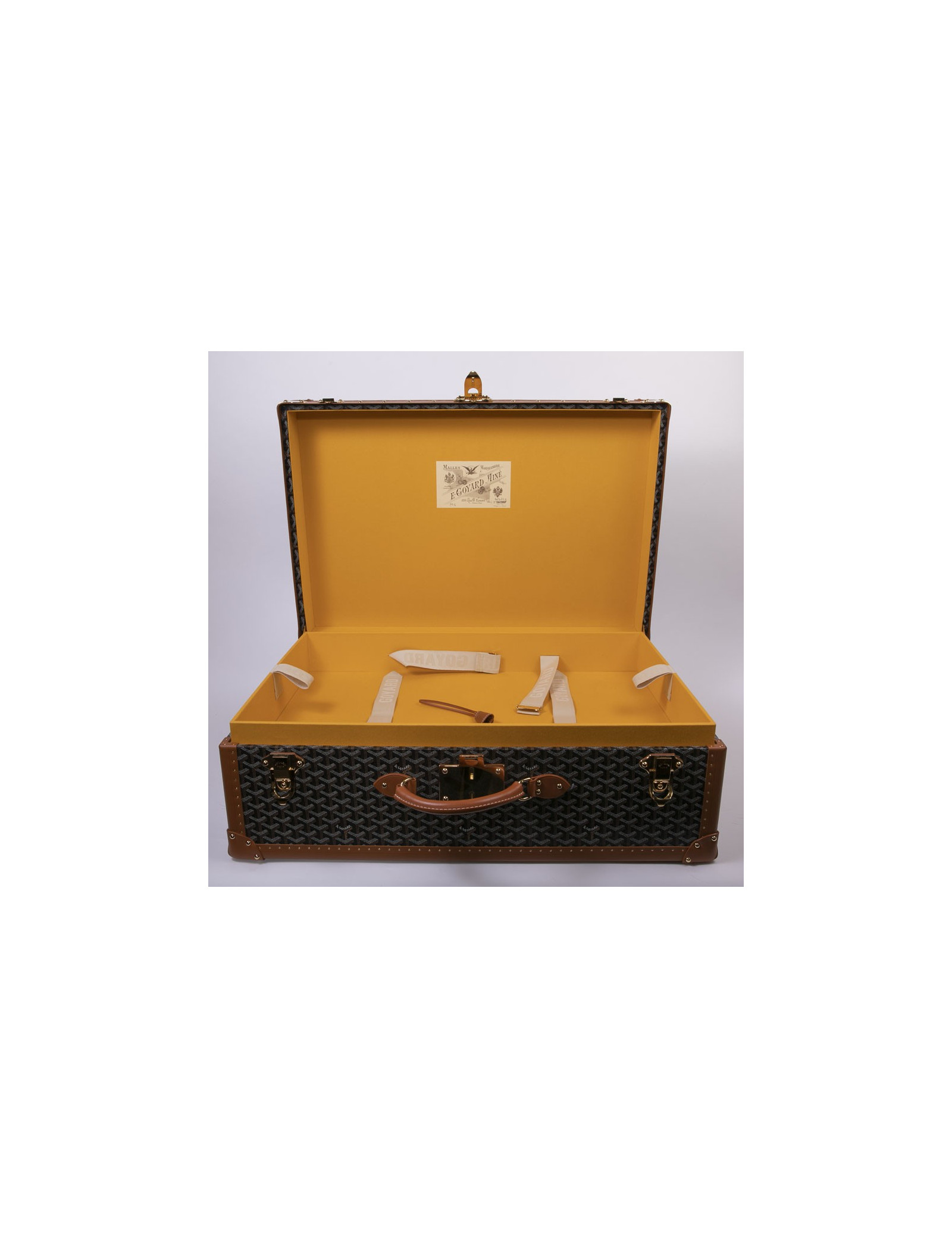 Goyard large travel trunk (hard suitcase) in brown monogrammed canvas with brown and black herringbone and light brown cowhide trim with gold metal rivet.