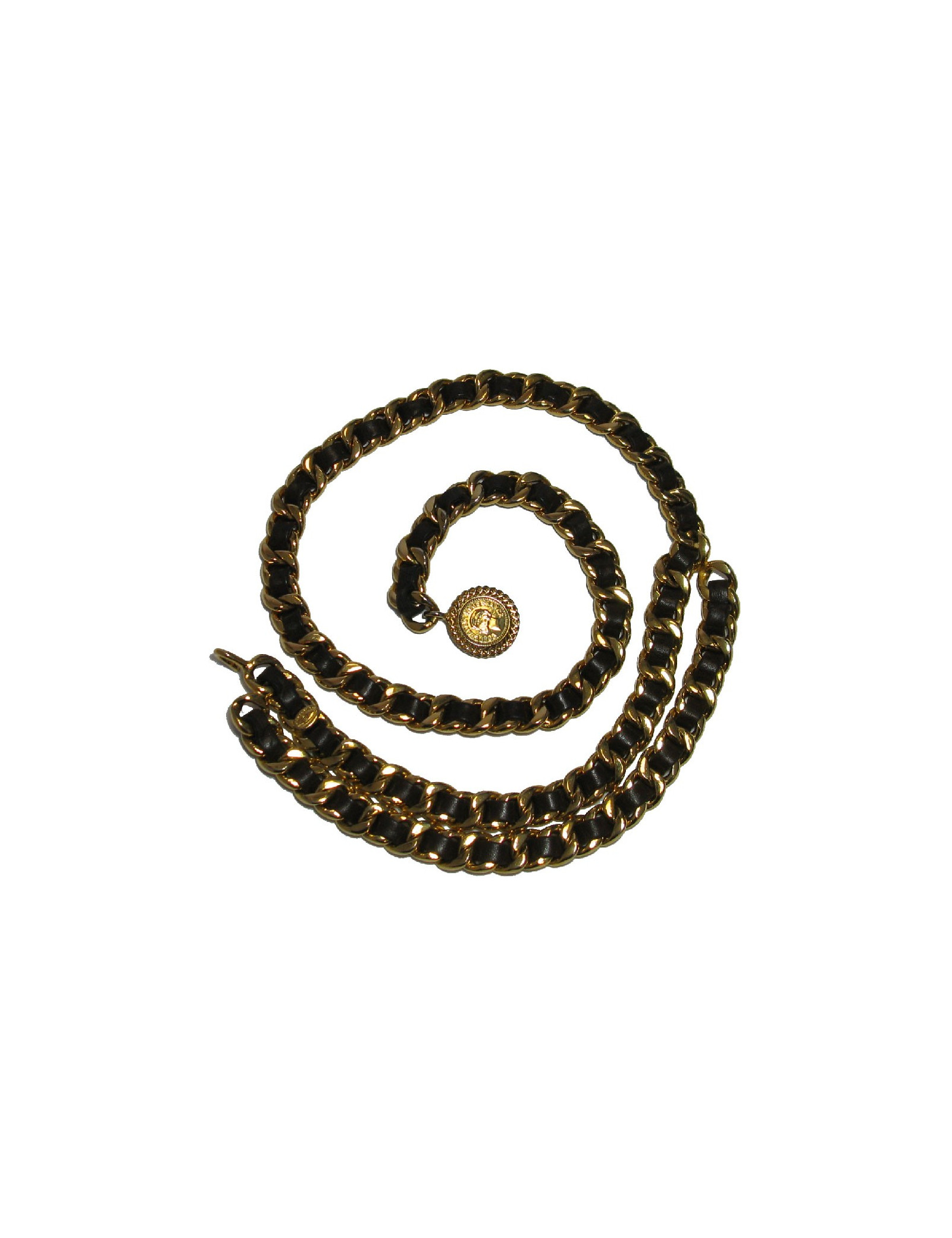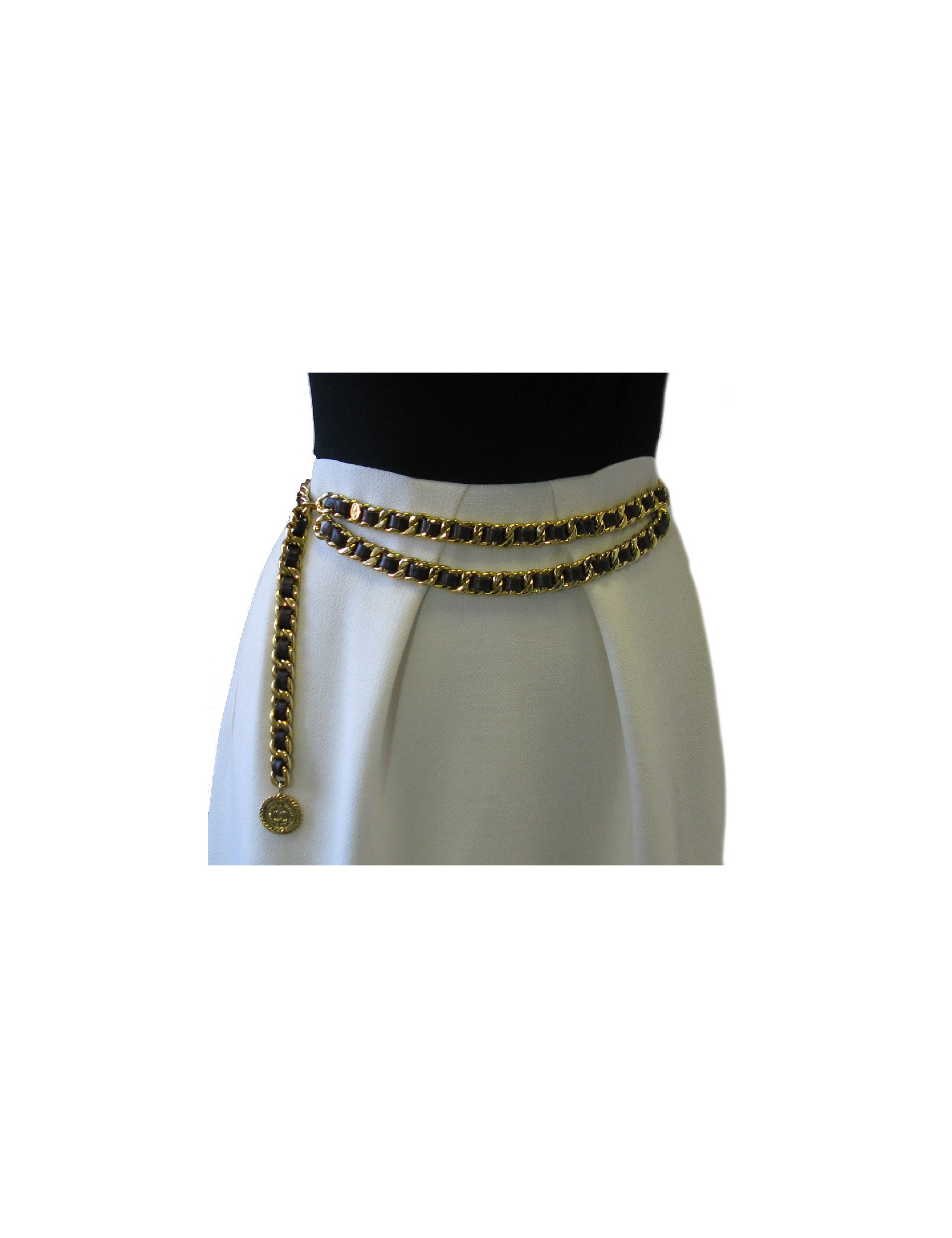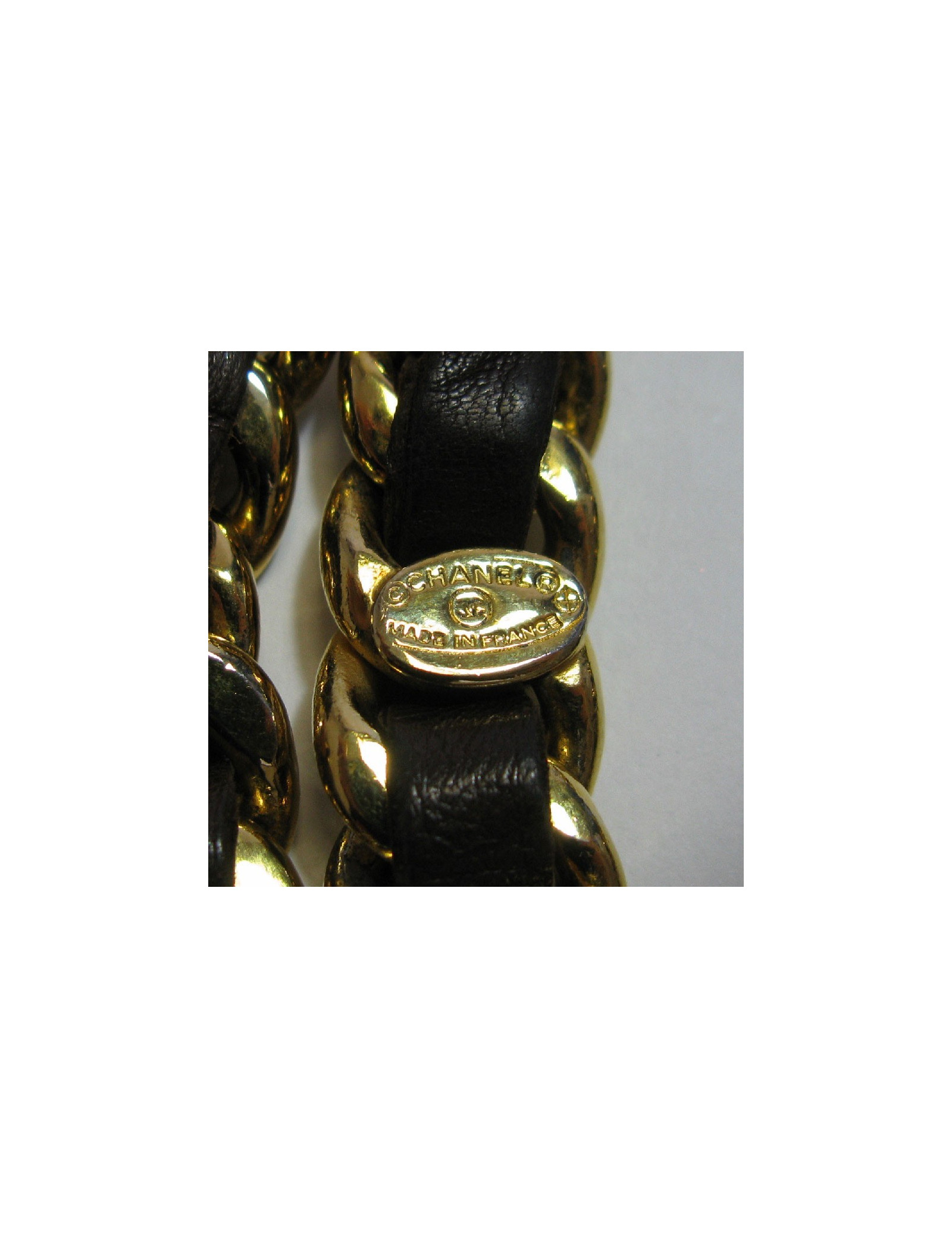 CHANEL vintage gold chain belt interlaced with brown leather.