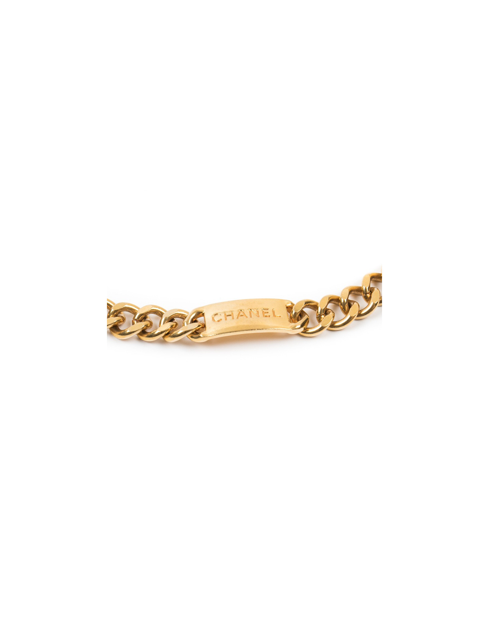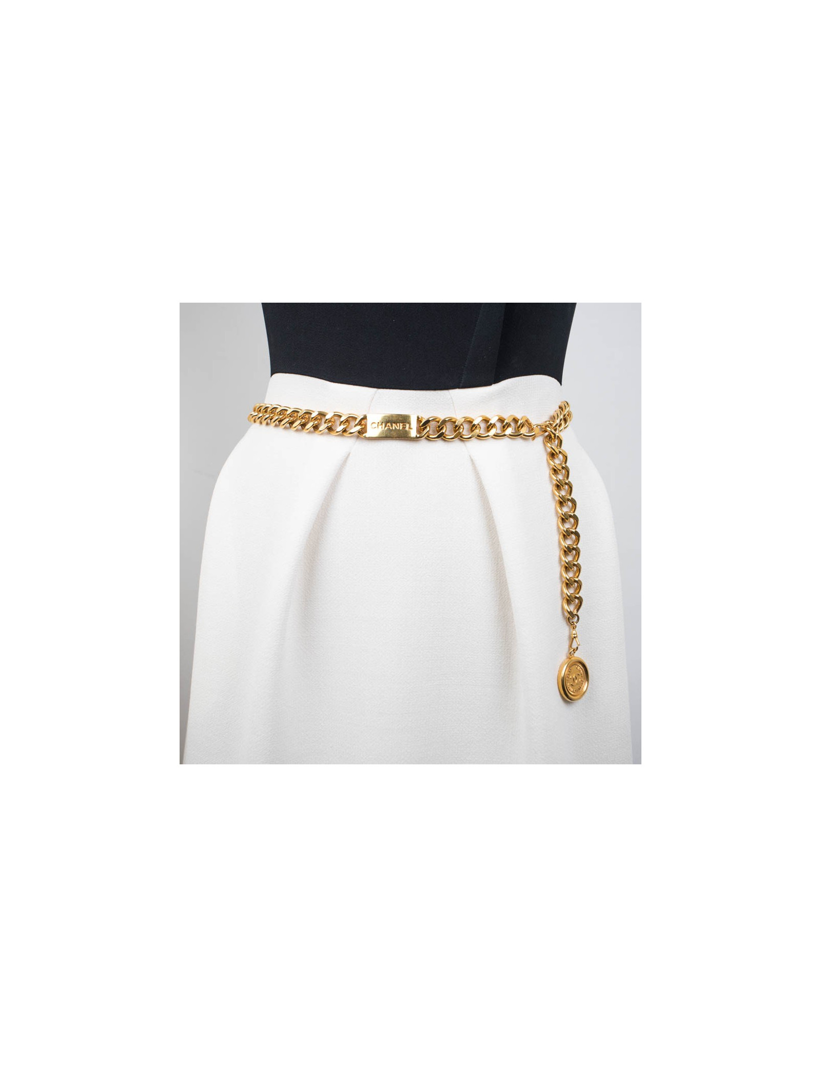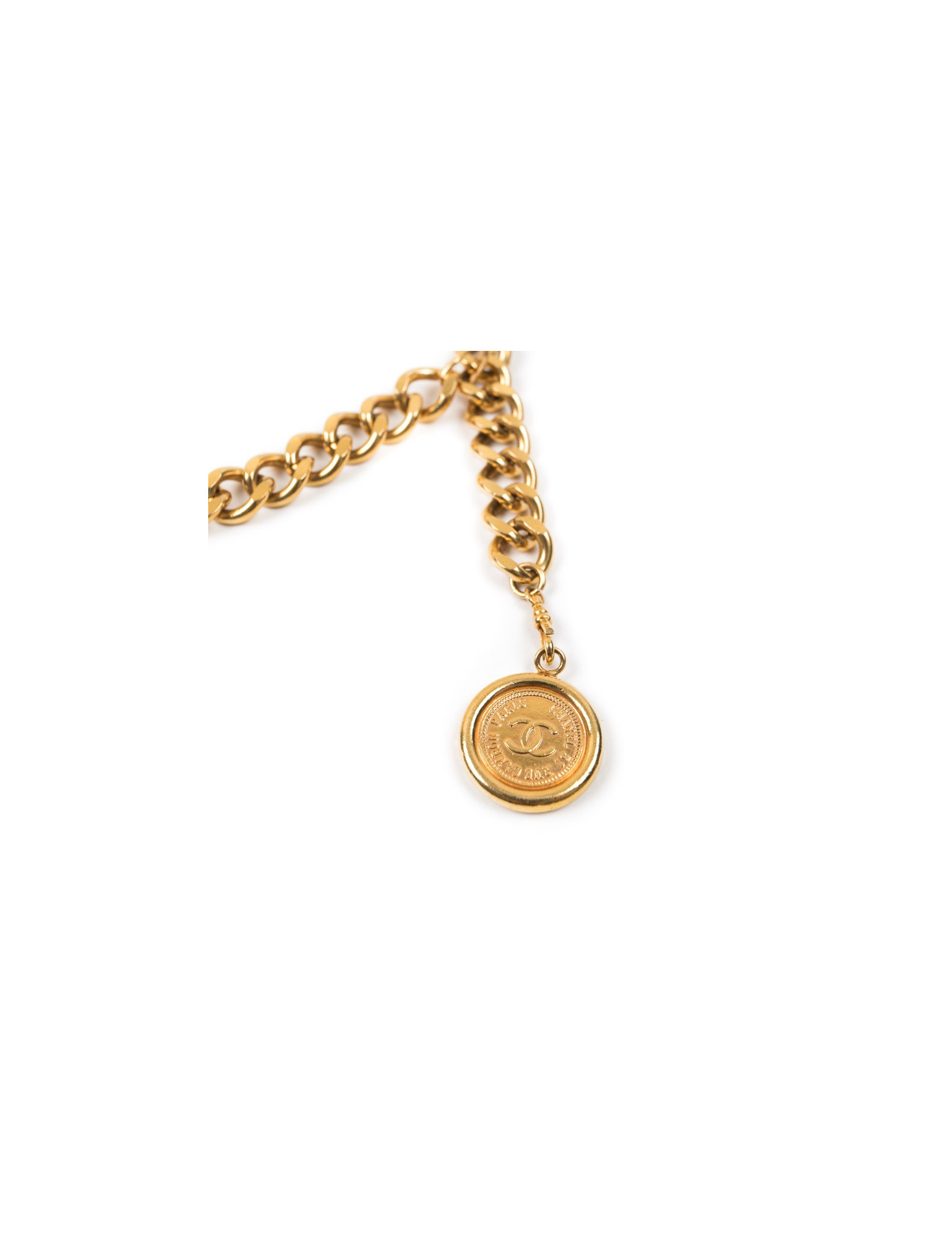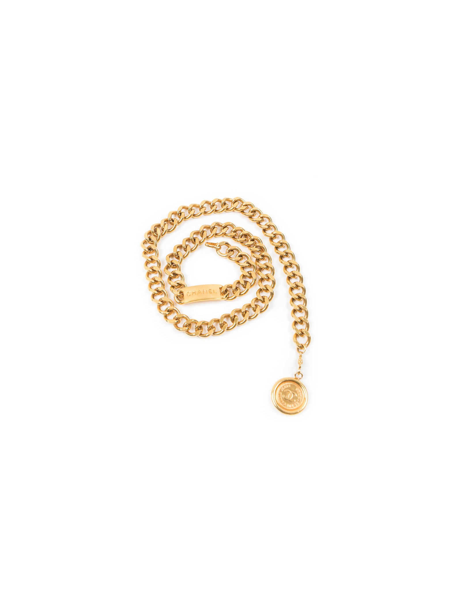 Vintage Chanel belt in gilt metal chain, plaque with Chanel inscription and medal.
