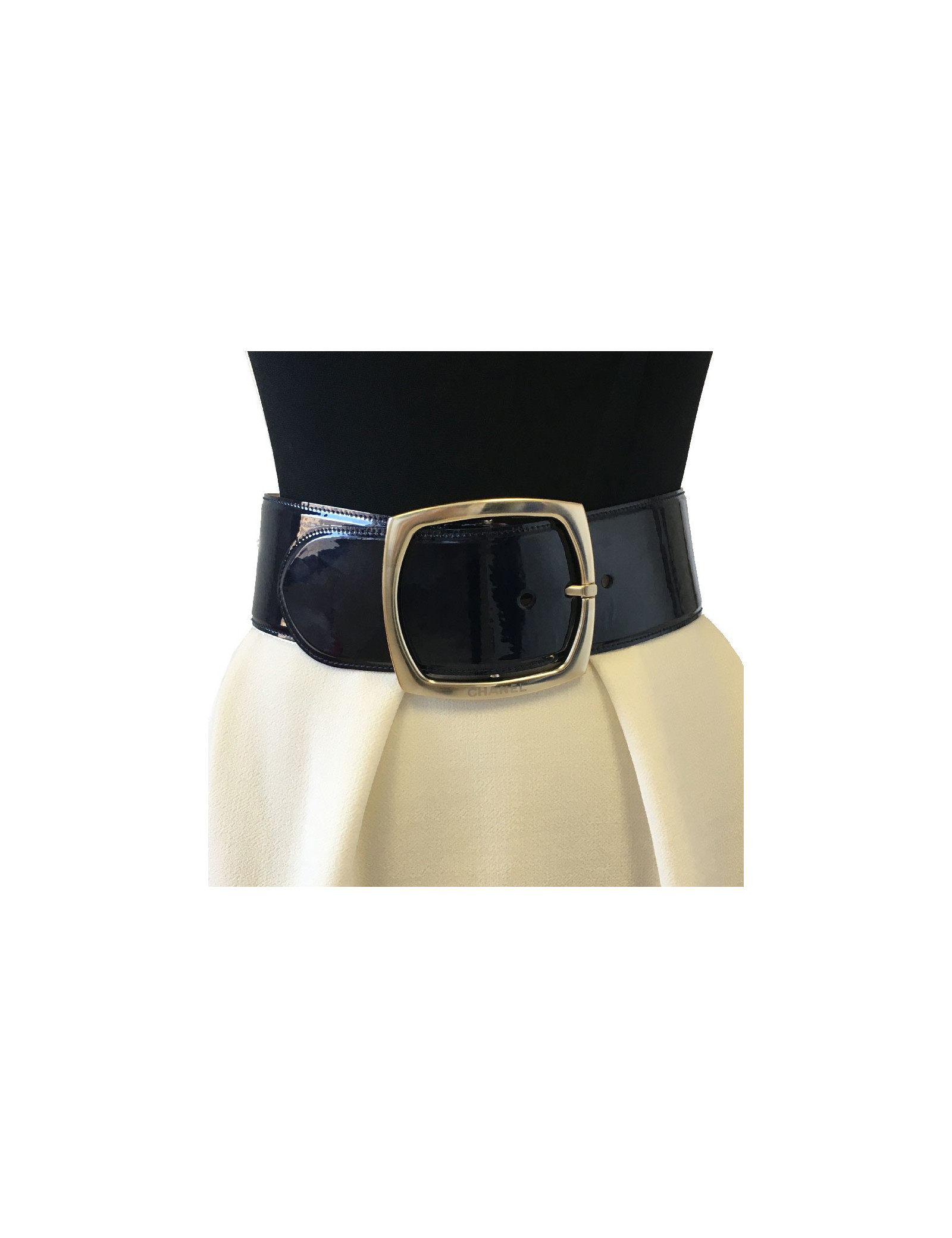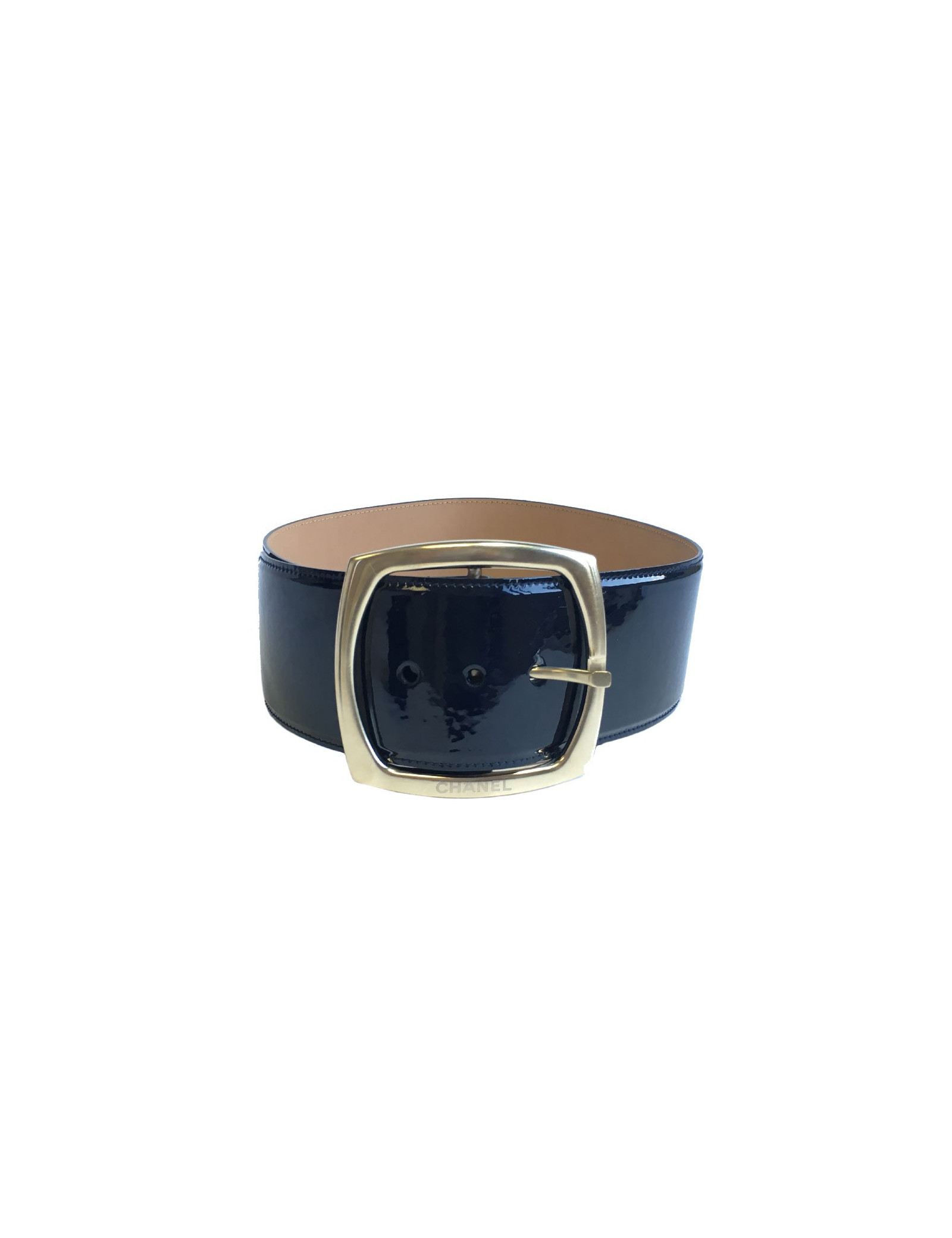 Beautiful wide Chanel belt in navy blue patent leather, pale gold metal buckle. Chanel inscription on the buckle.