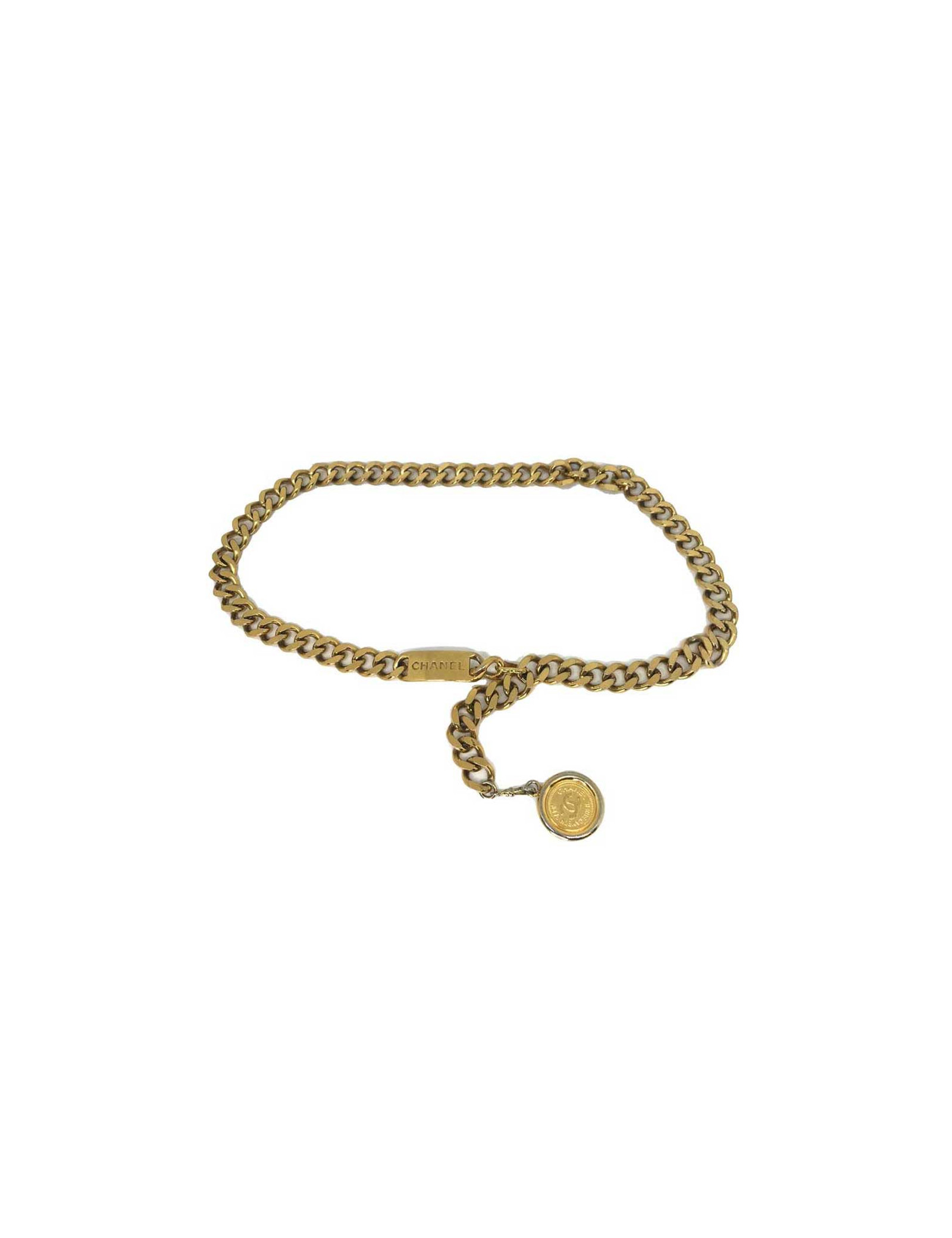 Last items in stock BELTS CHANEL Vintage couture belt CHANEL 32692 1,250.00 € CHANEL Vintage couture belt Condition : goodMade in FranceGender : womanMaterials : metal, resinColors : gold, light pinkMeasurements : length 69 cm, width 1,5 cm, chain 9 cm, pendant diameter 2,5 cmStamp : noyear : 80'sDetail : Couture collection, small round pendant in pink resin with lion's head, metal clasp slightly oxidized Add to cart