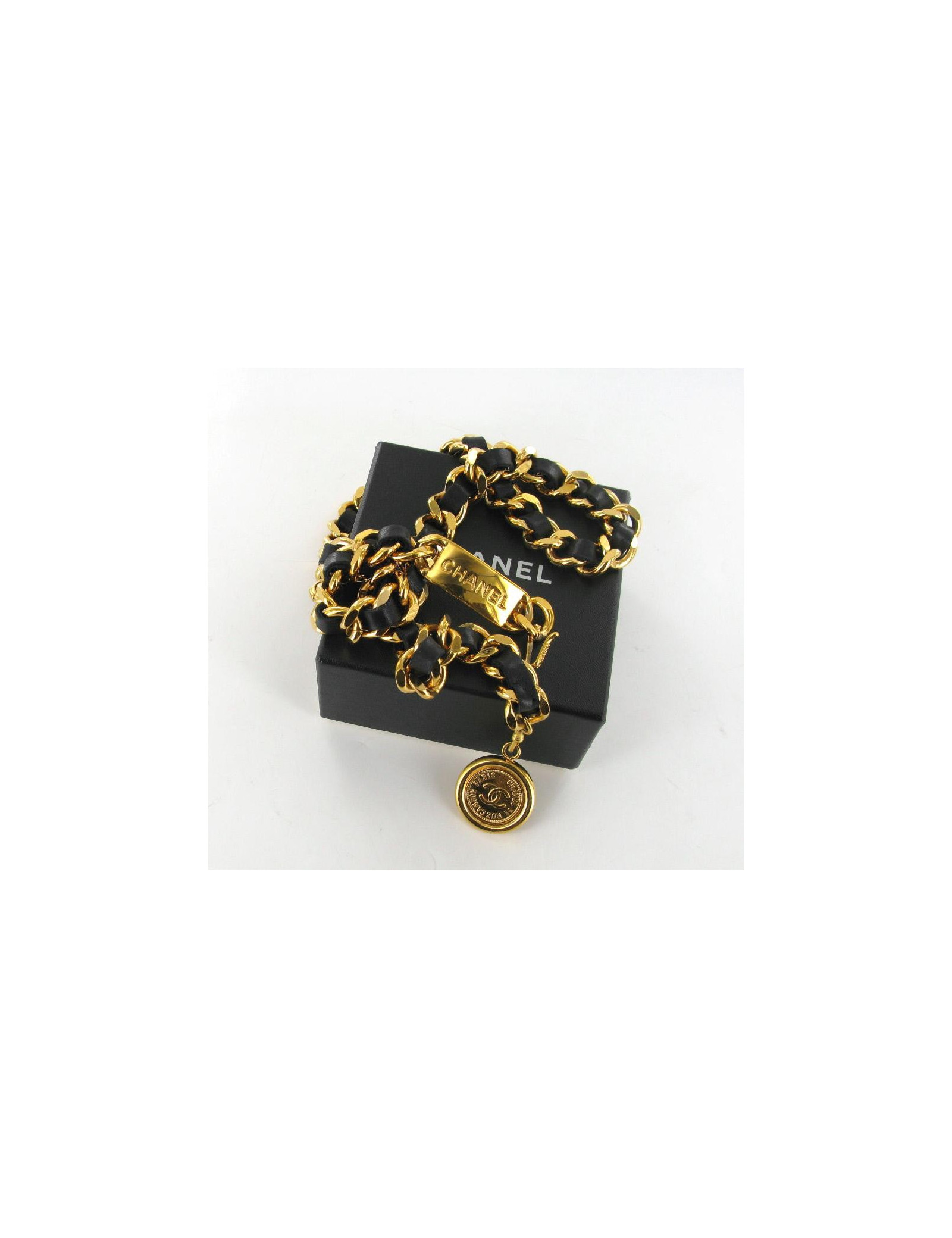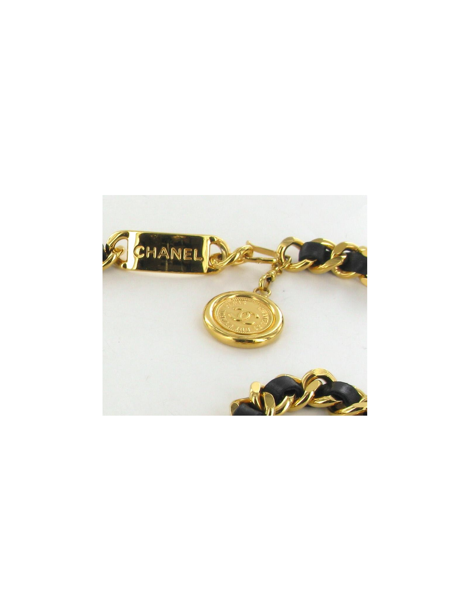 Kolkata black leather belt T80 CHANEL chain gold metal. It dates from the years 90.Le clasp is a plate engraved gold metal "CHANEL". There is also a Medallion gold metal where it is registered, the famous address of the House of CHANEL. It is in very good condition. Livery in box Chanel.
