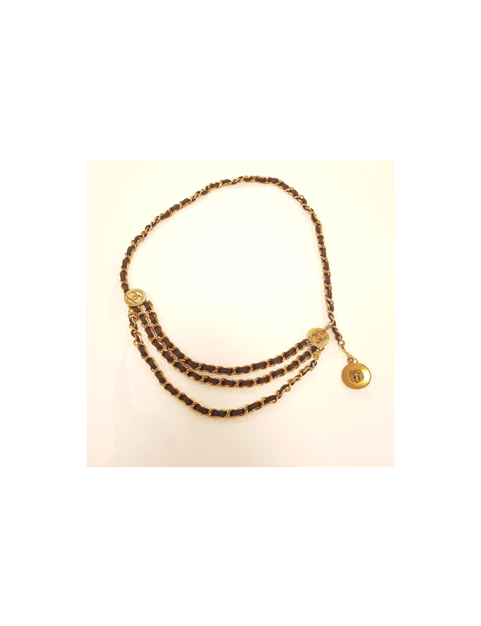 NECKLACES CHRISTIAN DIOR charms belt-necklace DIOR 36876 1,150.00 € CHRISTIAN DIOR vintage belt-necklace Condition : very goodMade in FranceMaterials : metal, rhinestonesColor : goldMeasurements : total length: 80 cm, width : 2.5 cmStamp : yesDetails : Can be worn as a necklace or belt, adjustable with a toggle clasp. No rhinestones are missing on these charms. Add to cart