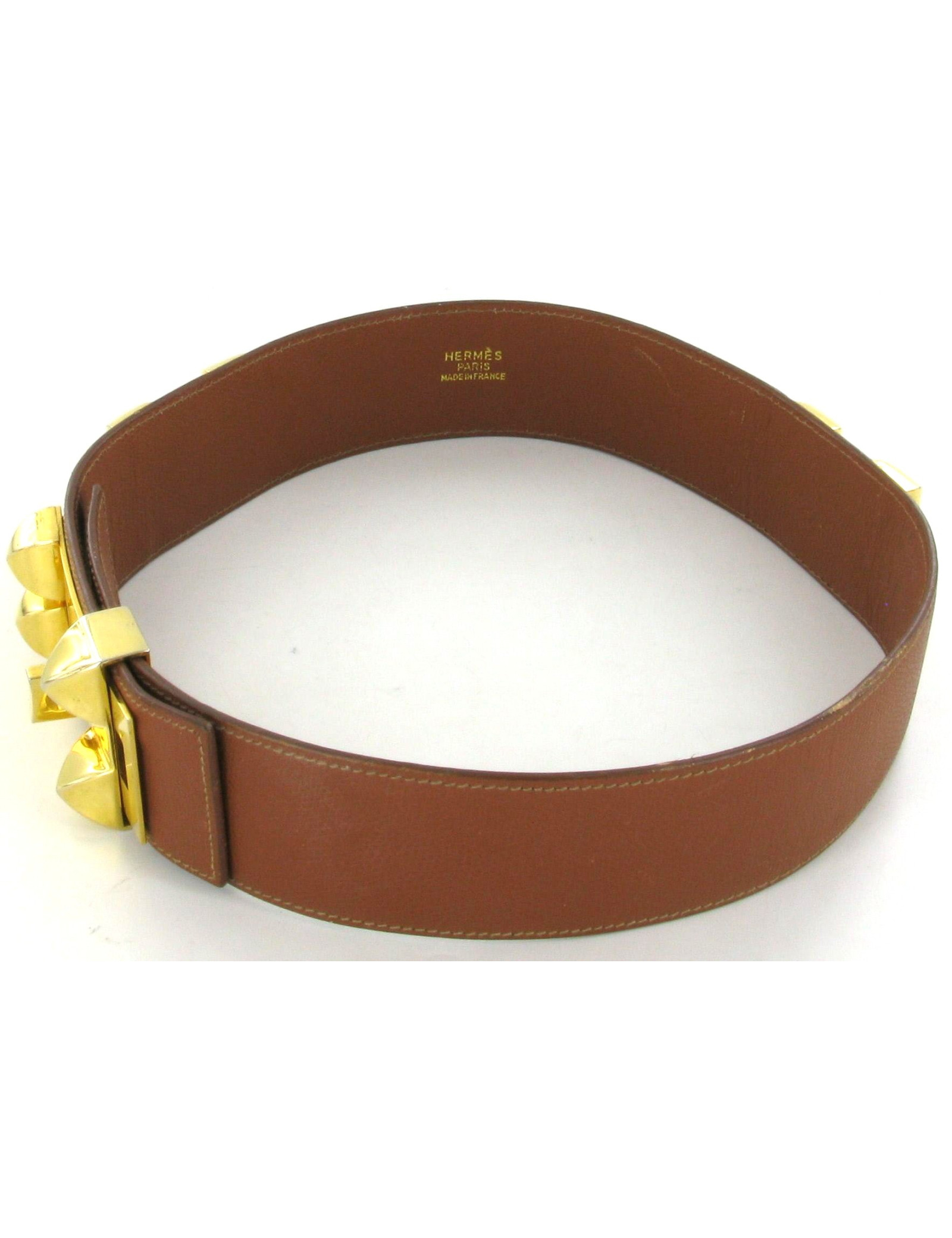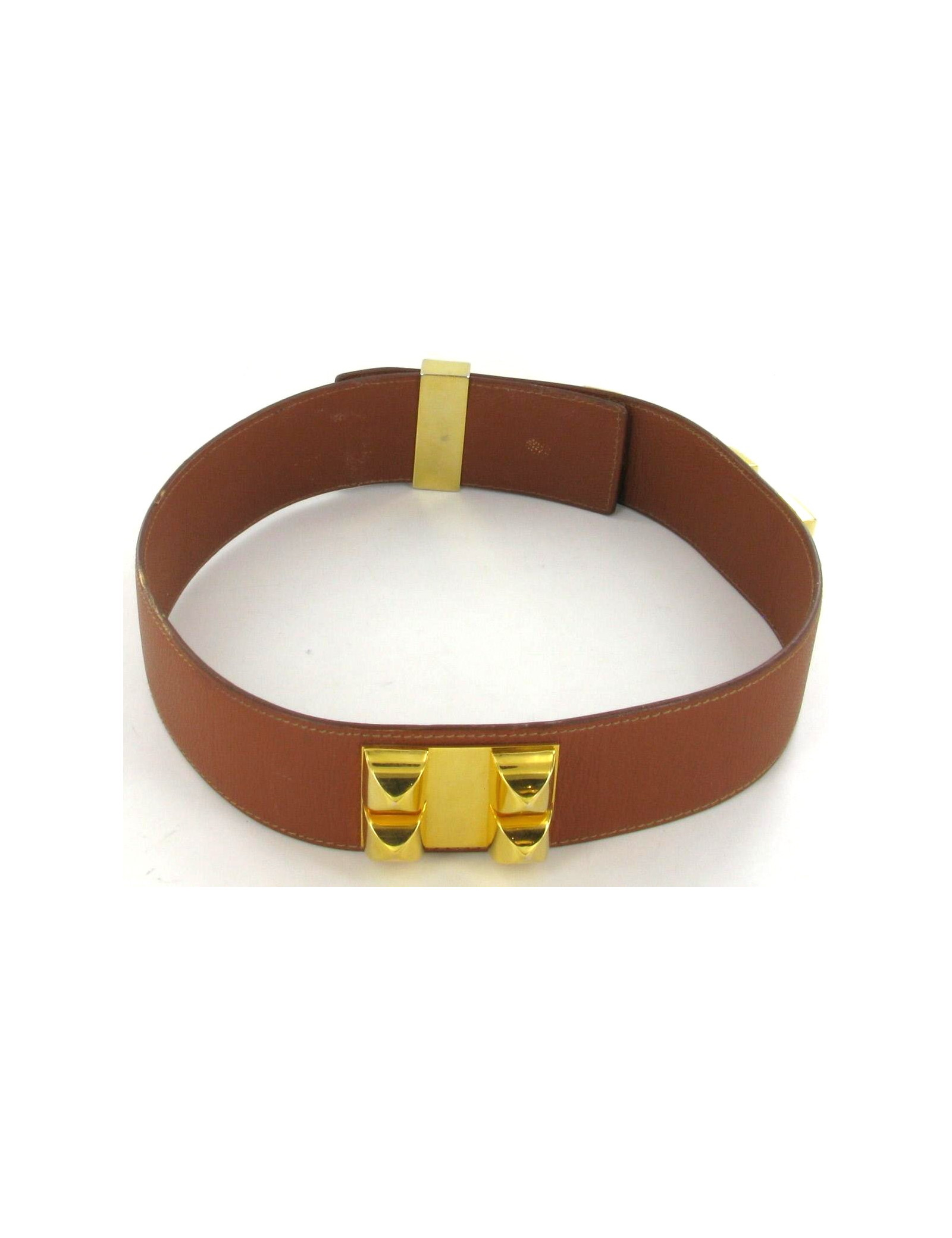 Belt HERMES necklace of dog in camel leather, and nails and gold metal clasp. Become a piece of iconic mode, this belt is a must - have for bending your blouses or your dresses. A few scratches on the inside and outside leather. The metal parts are slightly discoloured on the angles, and presence of micro-scratches. Made in France.