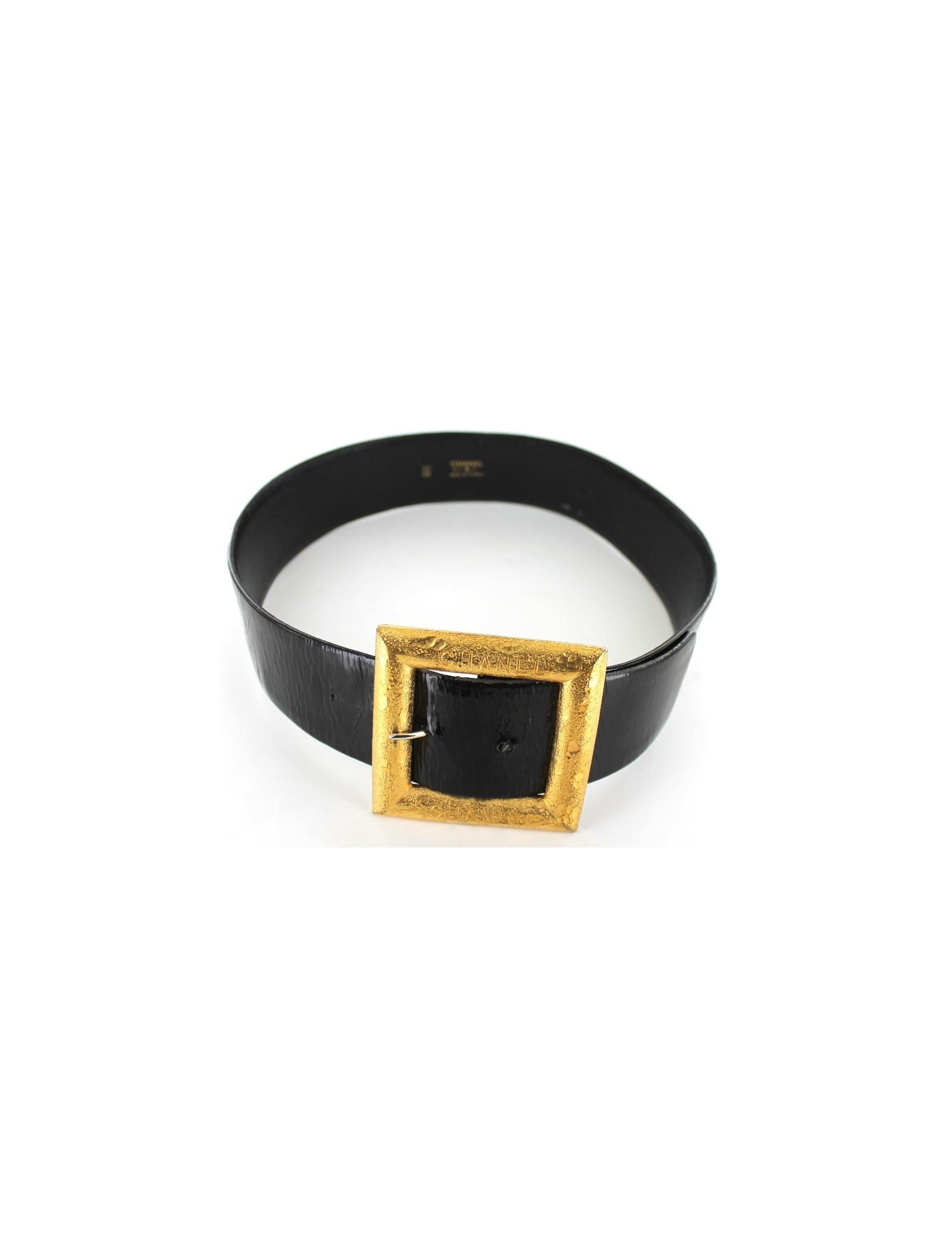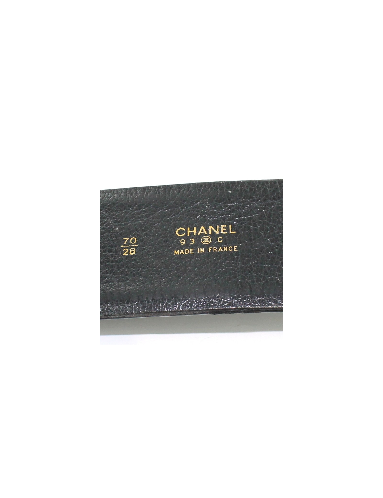 CHANEL belt in black leather and hammered Golden buckle liveried CHANEL. Model collector greatly used by the international press for fashion shoots. Four steps of length adjustment. Leather damaged by time. Made in France.