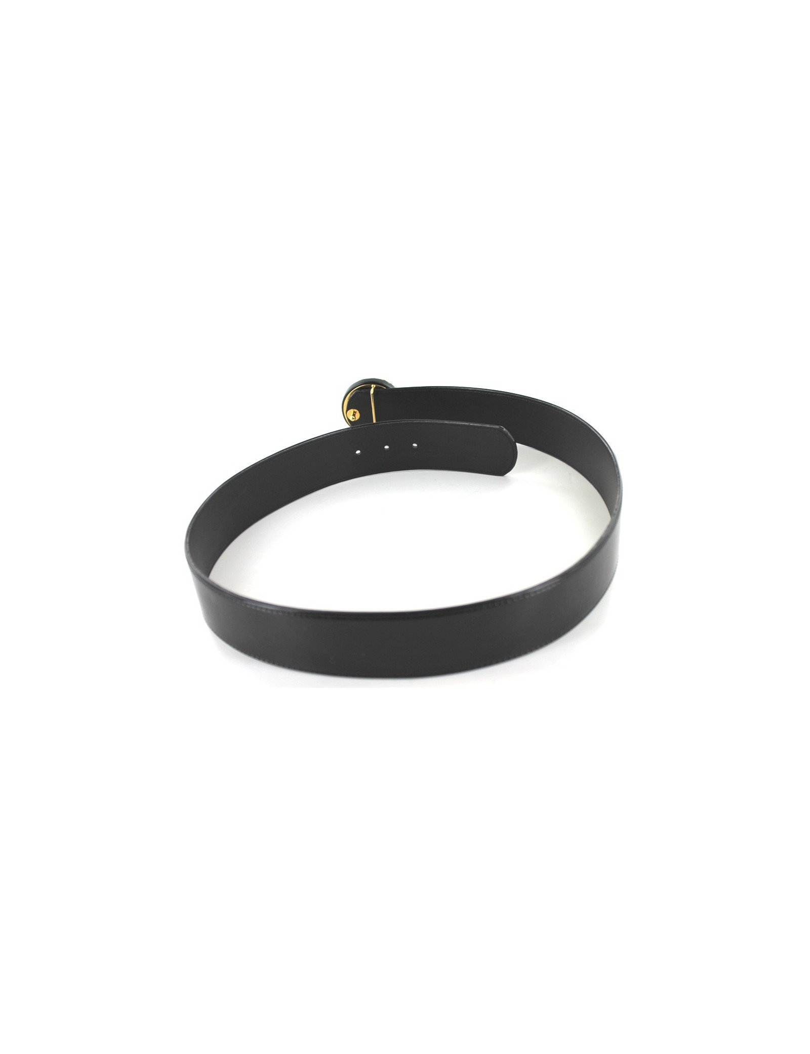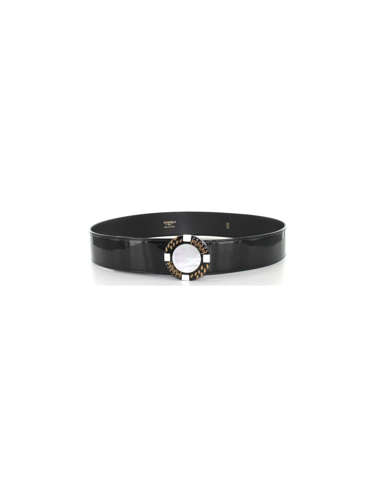 Belt CHANEL Black patent leather and buckle white mother of Pearl. Atuomne-winter collection 1997. Round loop is mother-of-Pearl black and white with Golden representatives details a string and the CC symbol. Three steps of length adjustment. Clasp by button. Made in France.