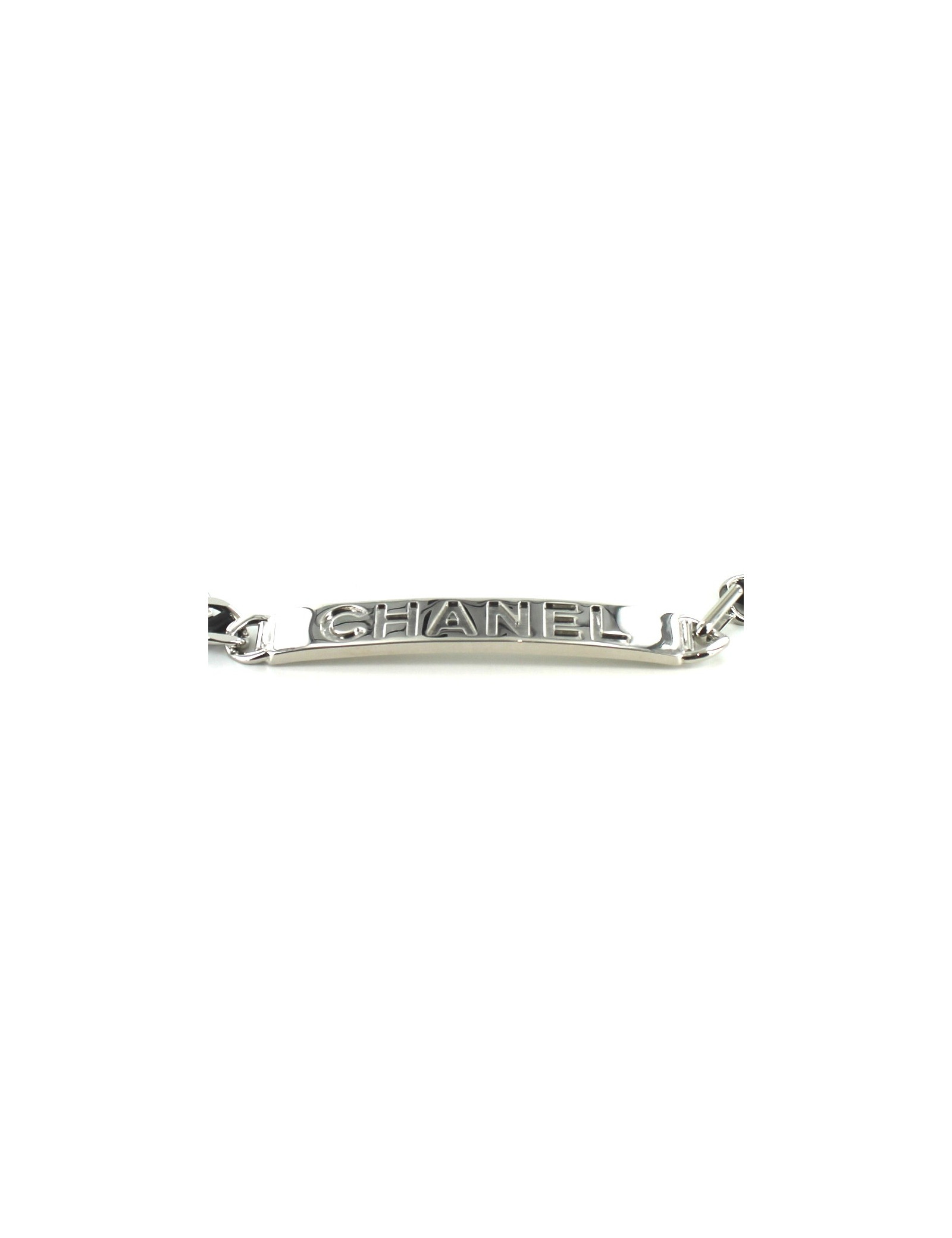 Belt CHANEL in chained interlaced silver with black leather and silver metal cover plate black liveried CHANEL. Spring-summer 1998 collection. Adjustable length. Hook closure. Made in France.