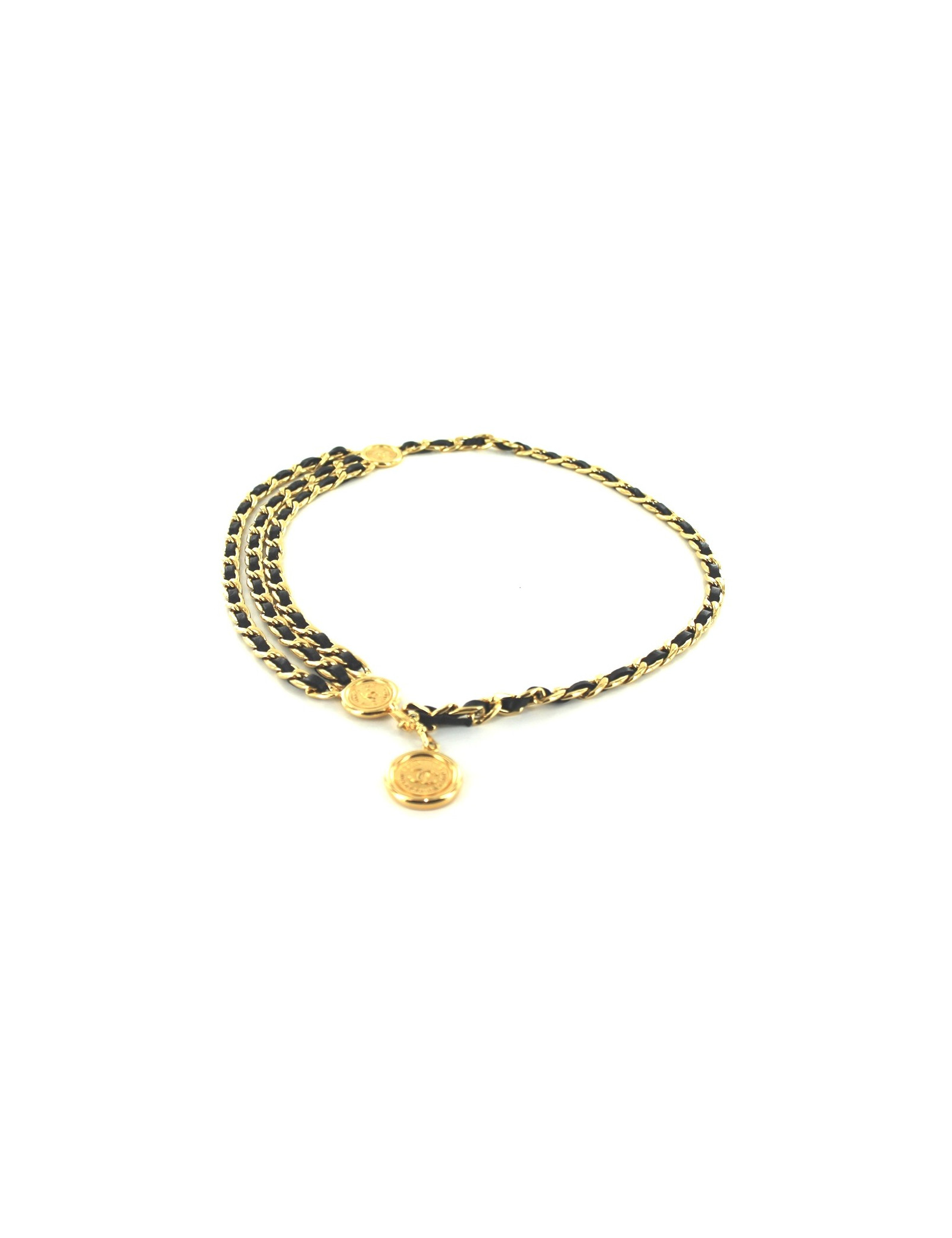 Belt CHANEL chain interlaced gold metal of black leather triple row. String mythical timeless. The big three medallions are signed "CHANEL 31 RUE CAMBON PARIS". The medallion at the end of belt is removable. Scratches from wear. Hook closure.