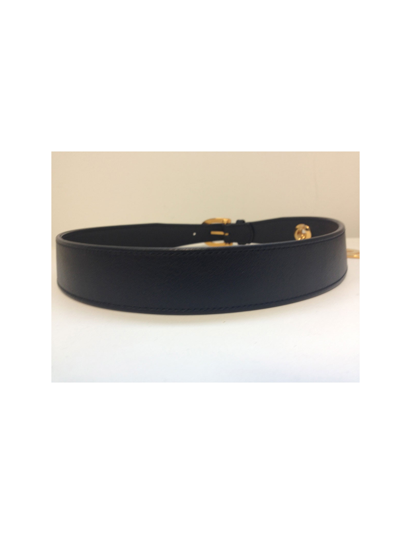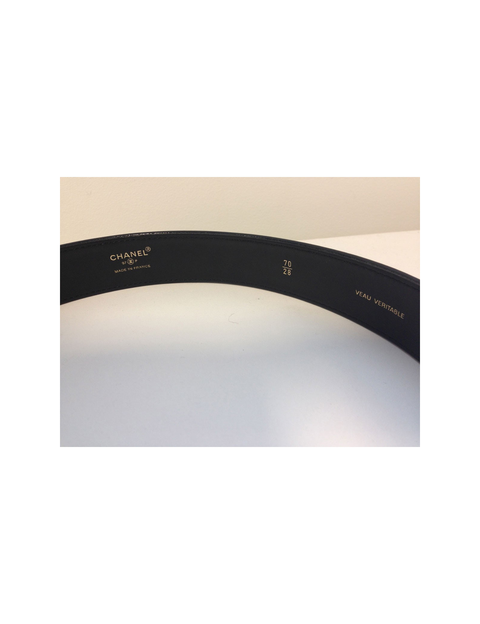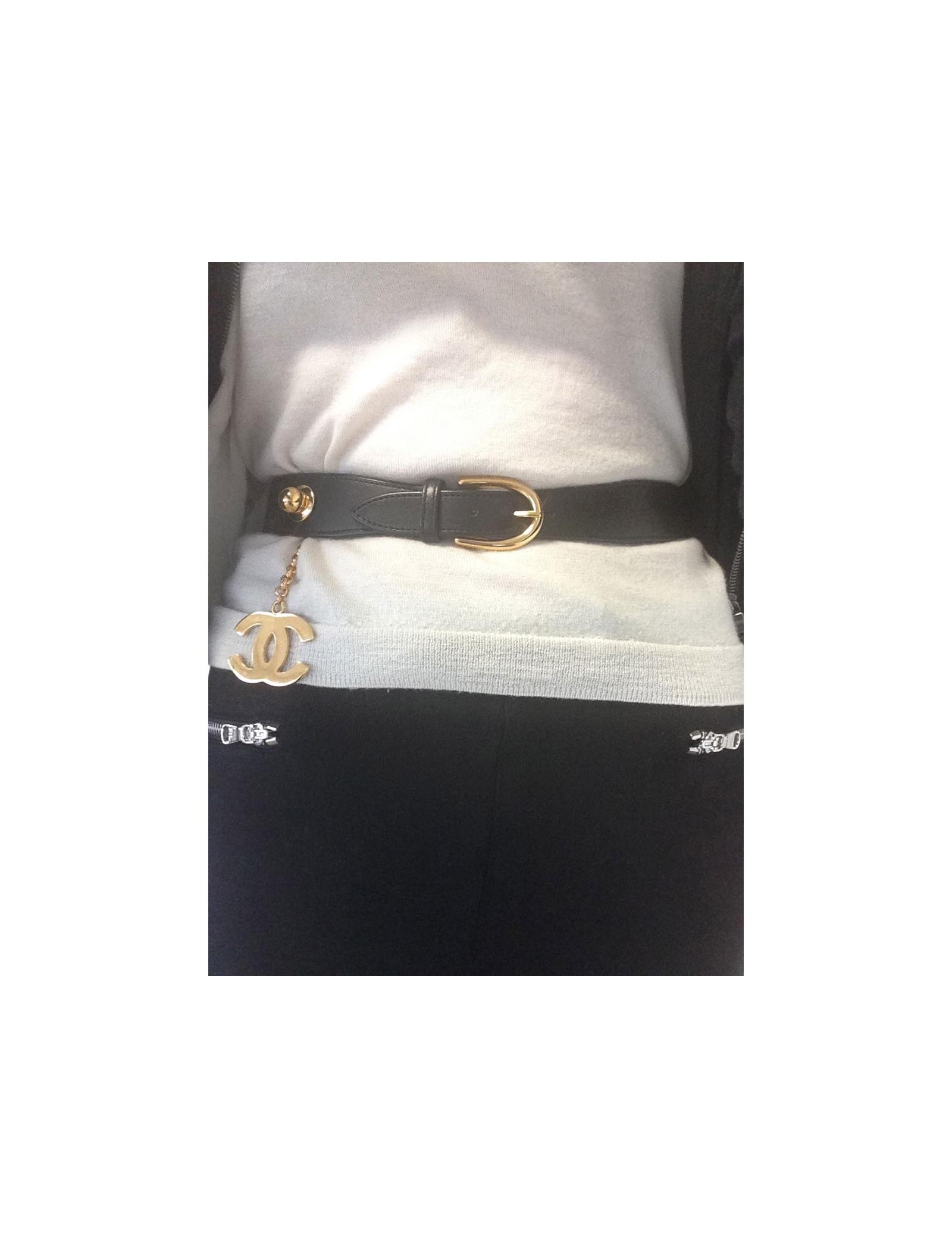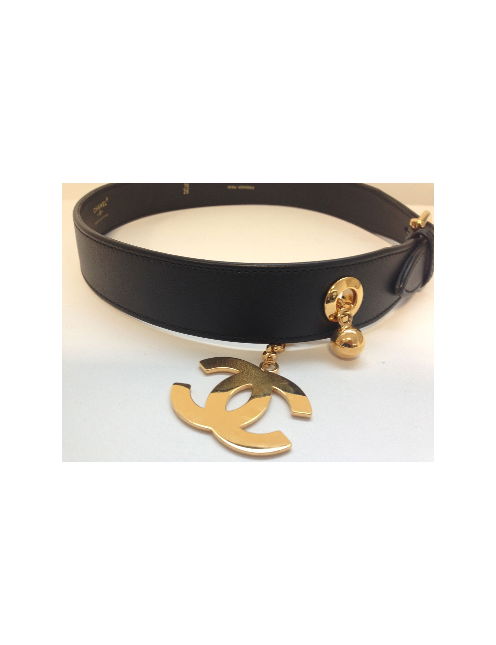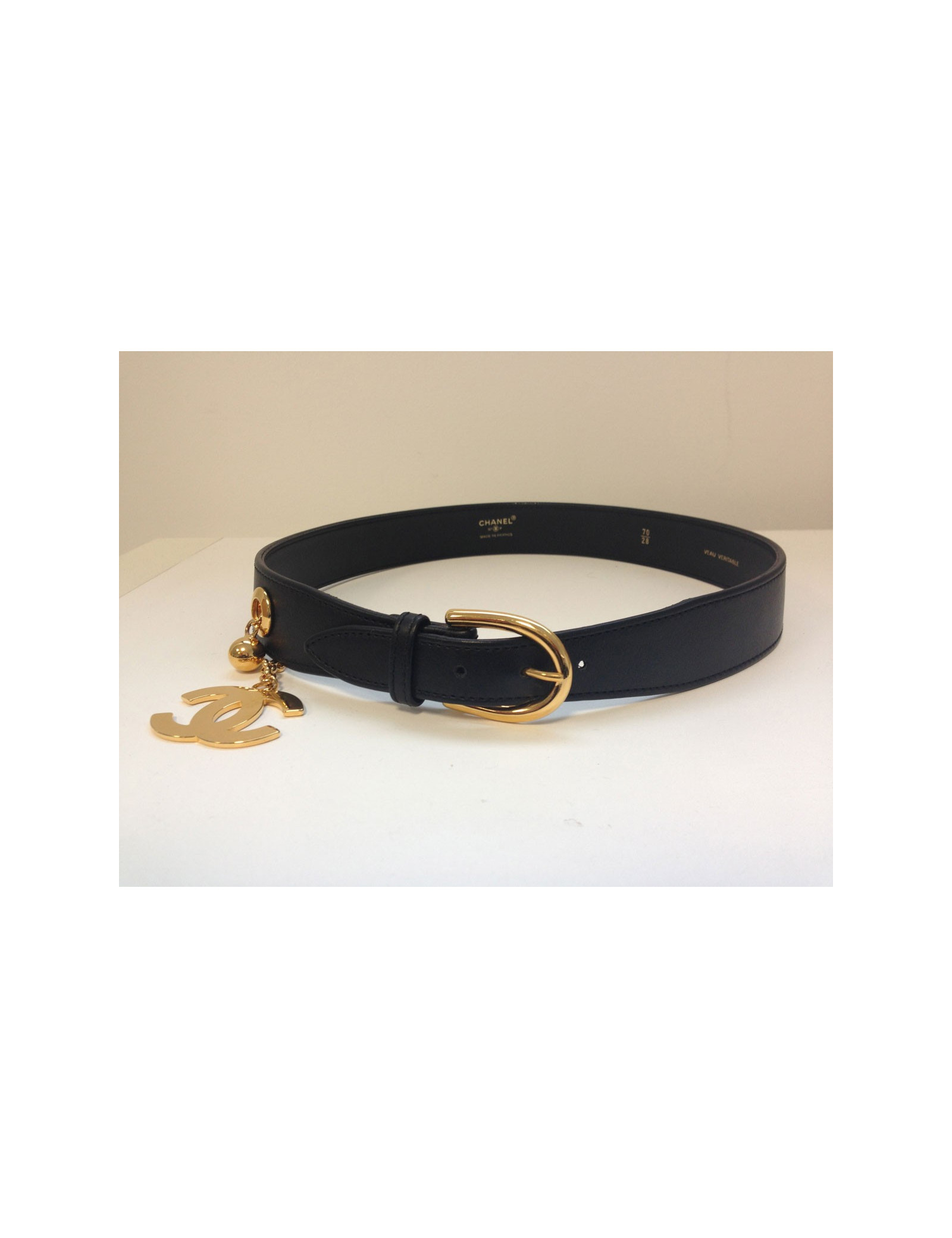 Belt Chanel in black calf leather, T70, leather is impeccable, Golden CC hangs from a chain, the latter presents microphones really light scratches.