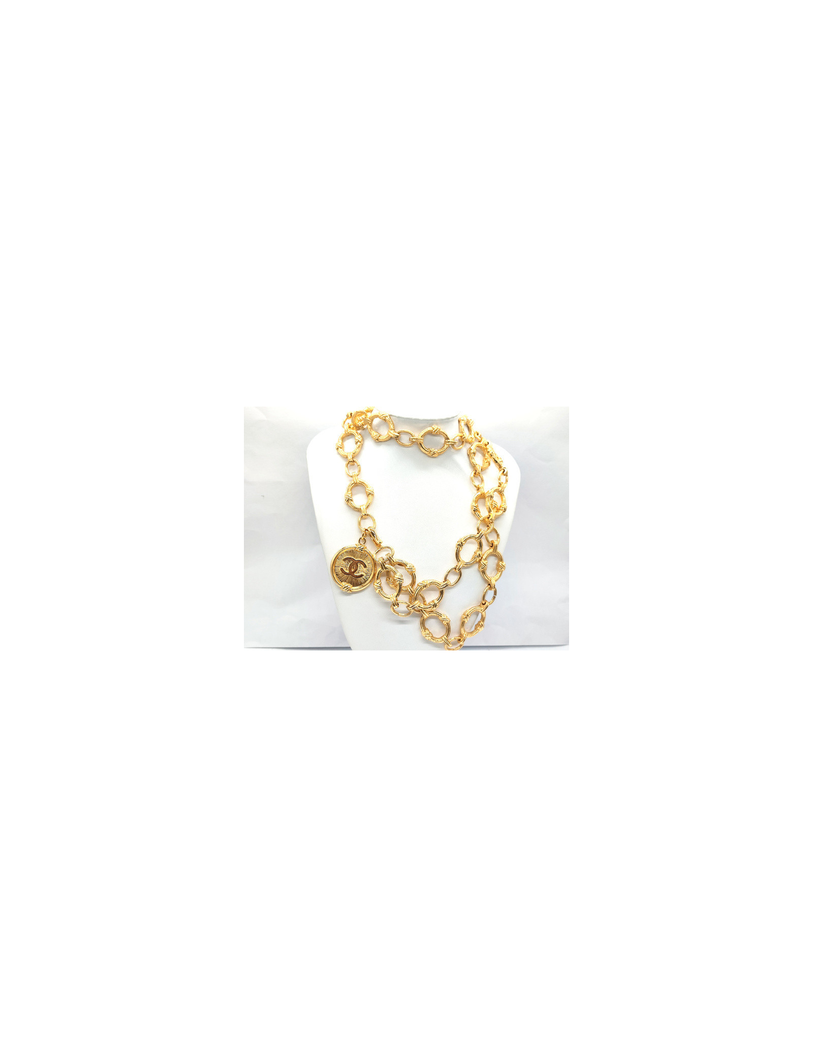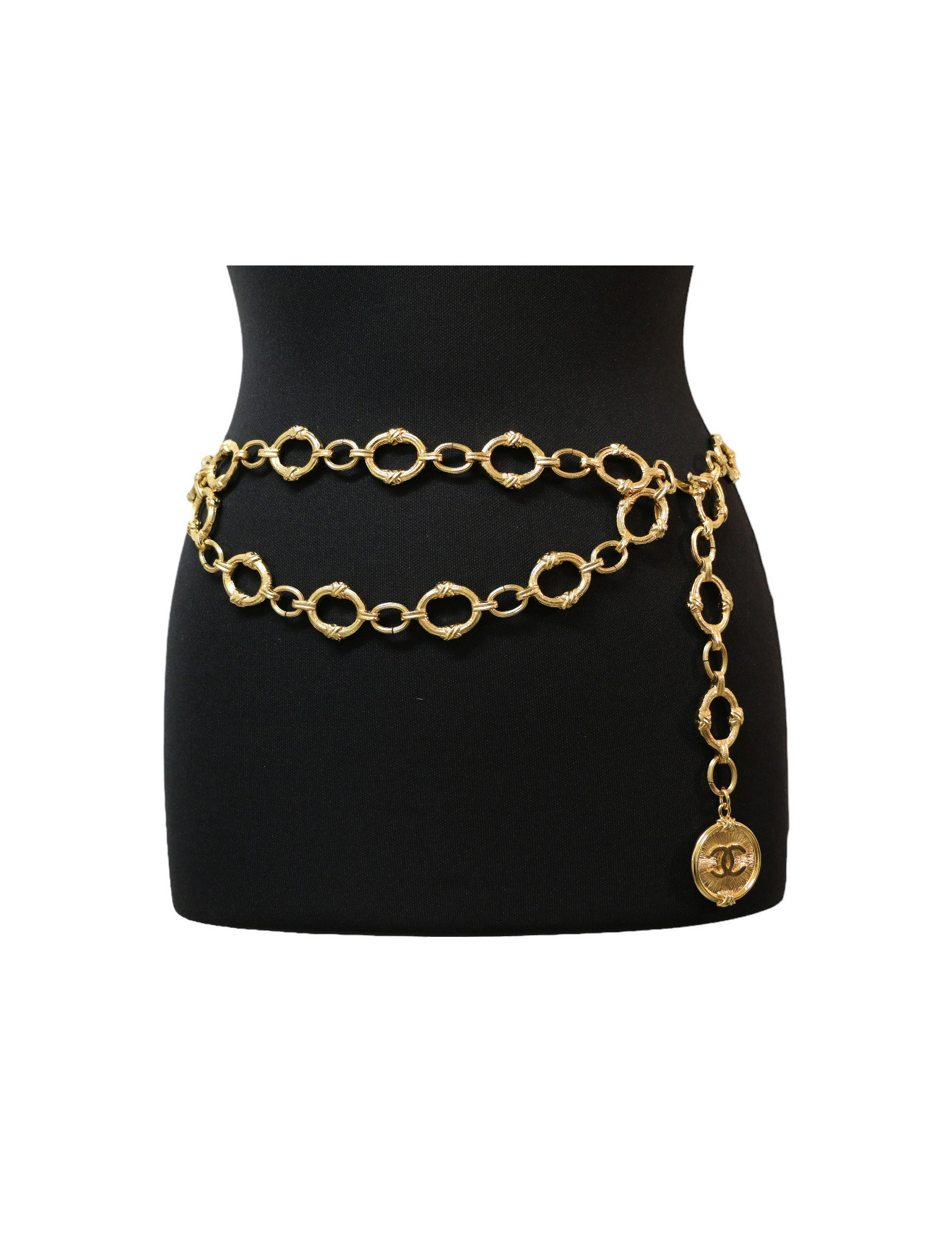 Details : double belt with large CC medallion. The belt is adjustable, as the hook attaches to any link on the chain.