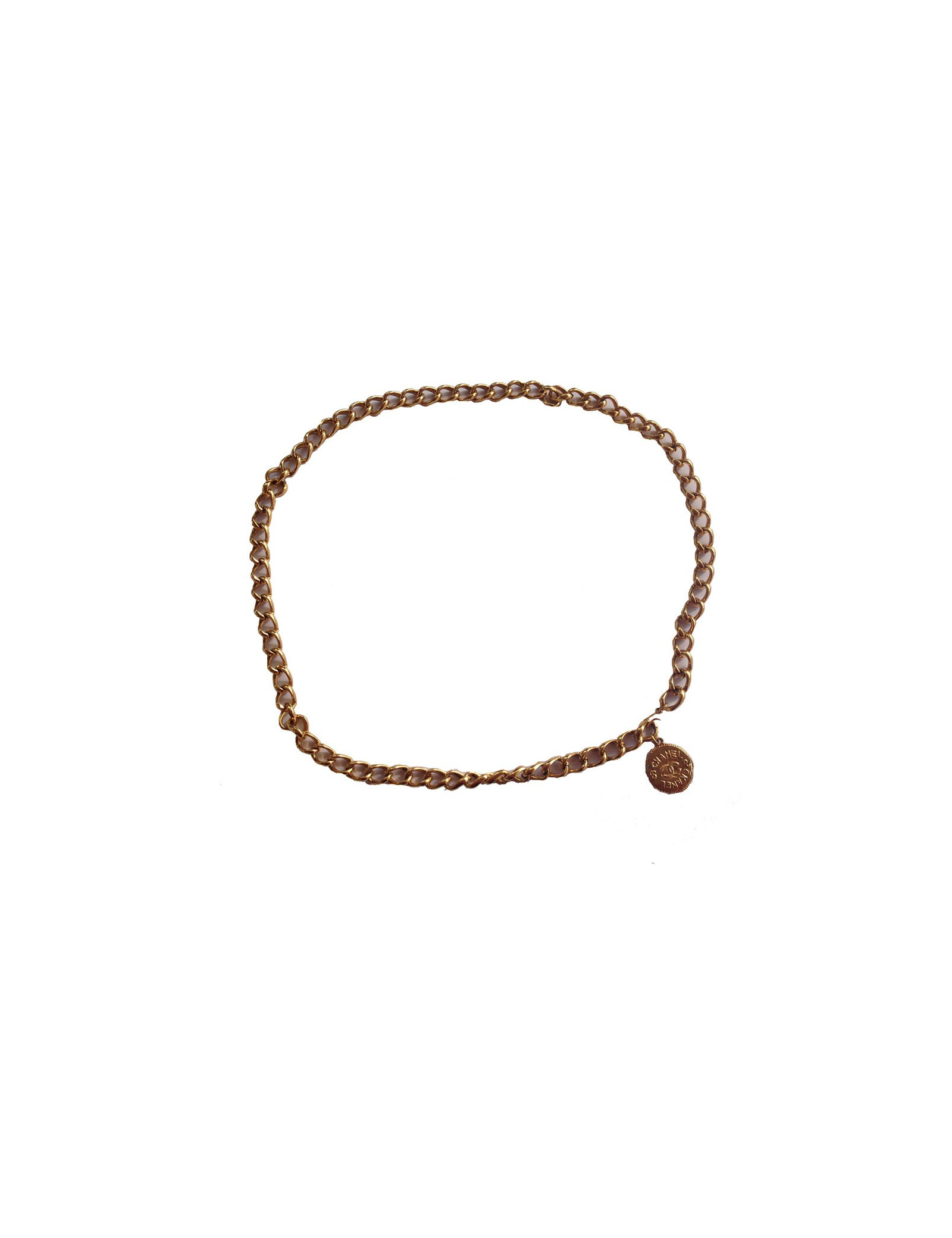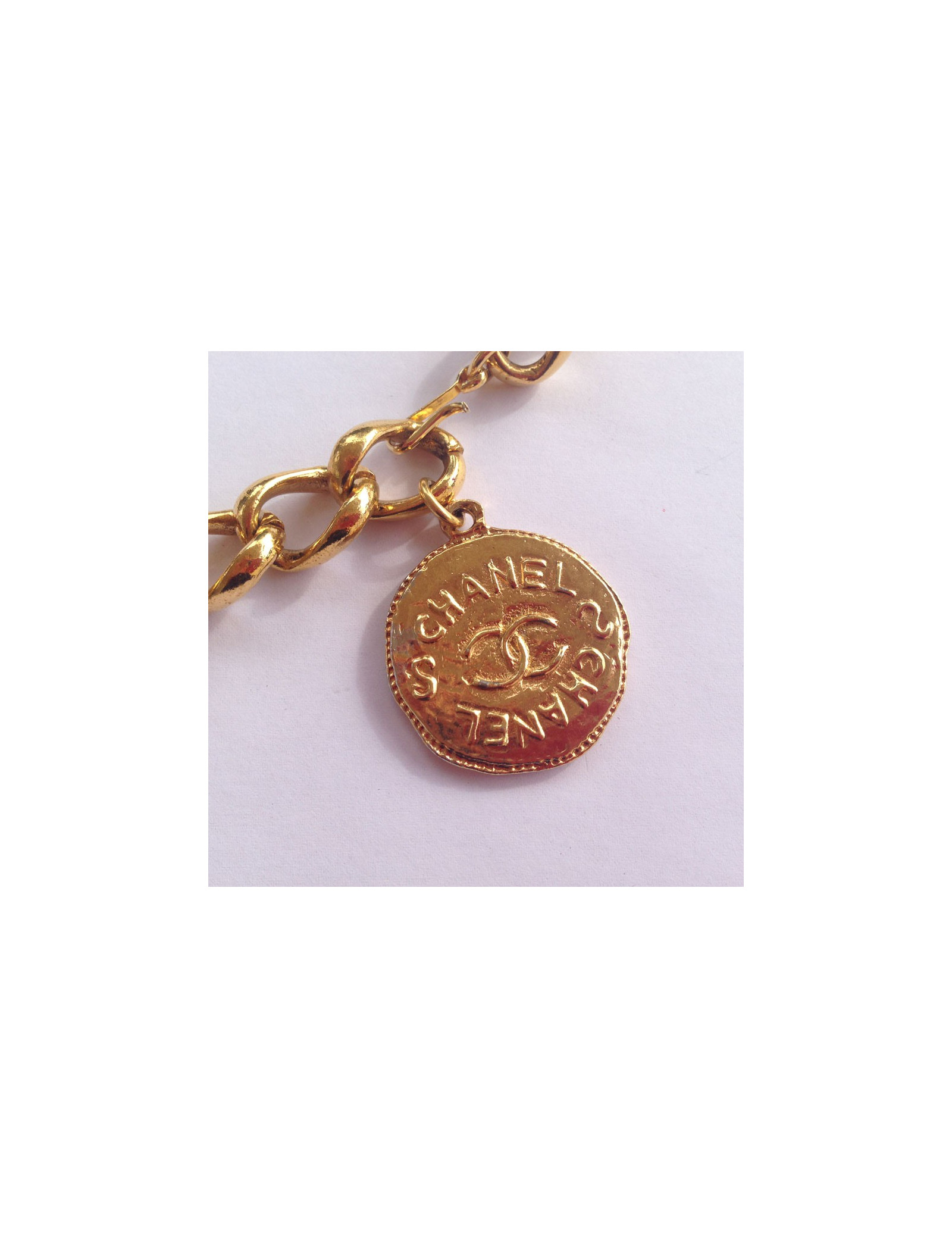 90's! Very beautiful and timeless CHANEL House in golden chain belt. Vintage. The belt ends with a medal to the abbreviation CC on one side and the inscription CHANEL on the other. Gold rose slightly on a small corner of the medal. A hook closure. In very good condition.