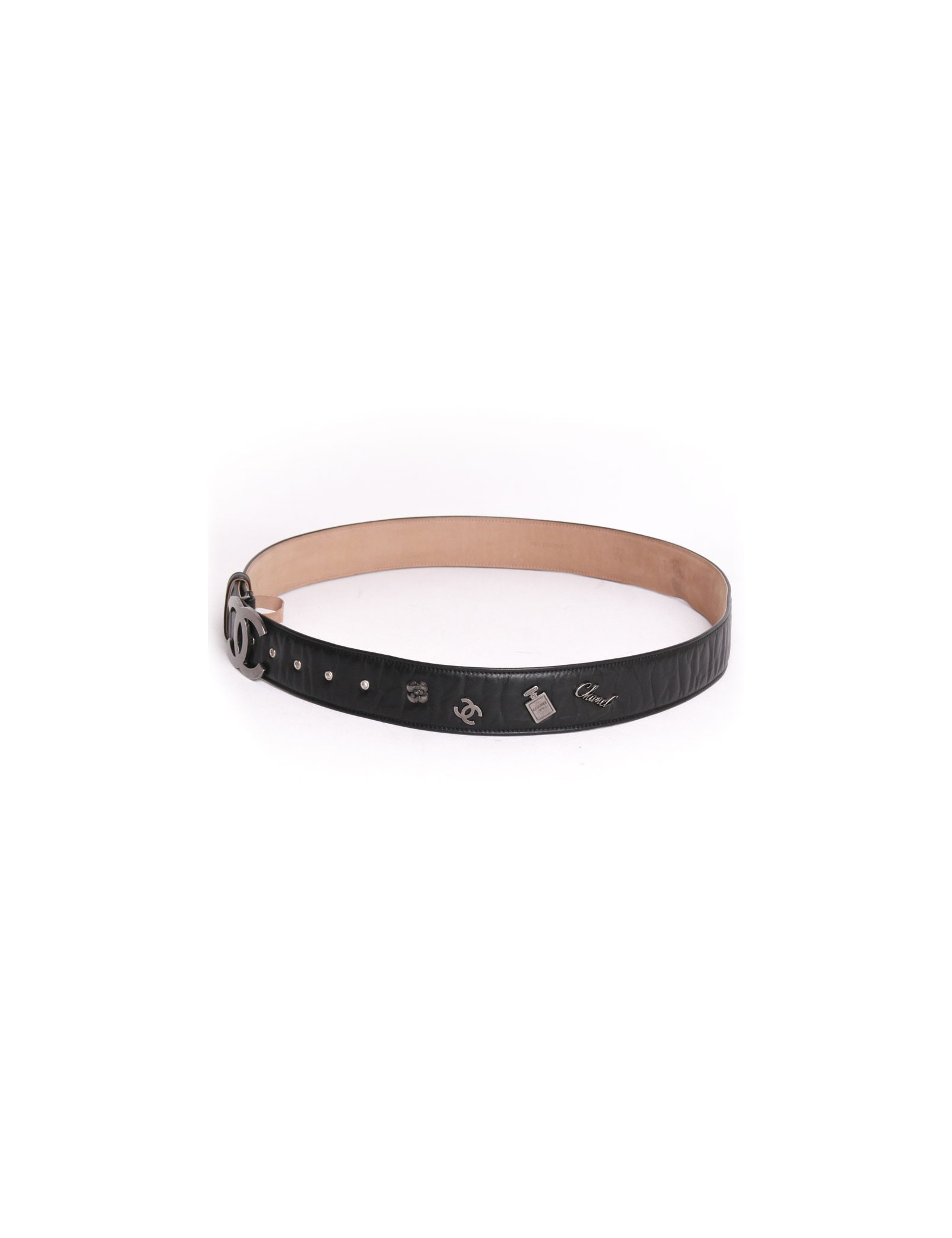 Belt Chanel Black lambskin with camelia, perfume bottle and inscription Chanel silver metal inlays. The belt is composed of 5 holes of clamp. The loop is a double C silver metal (measure of the loop 6 cm x 4.5 cm)