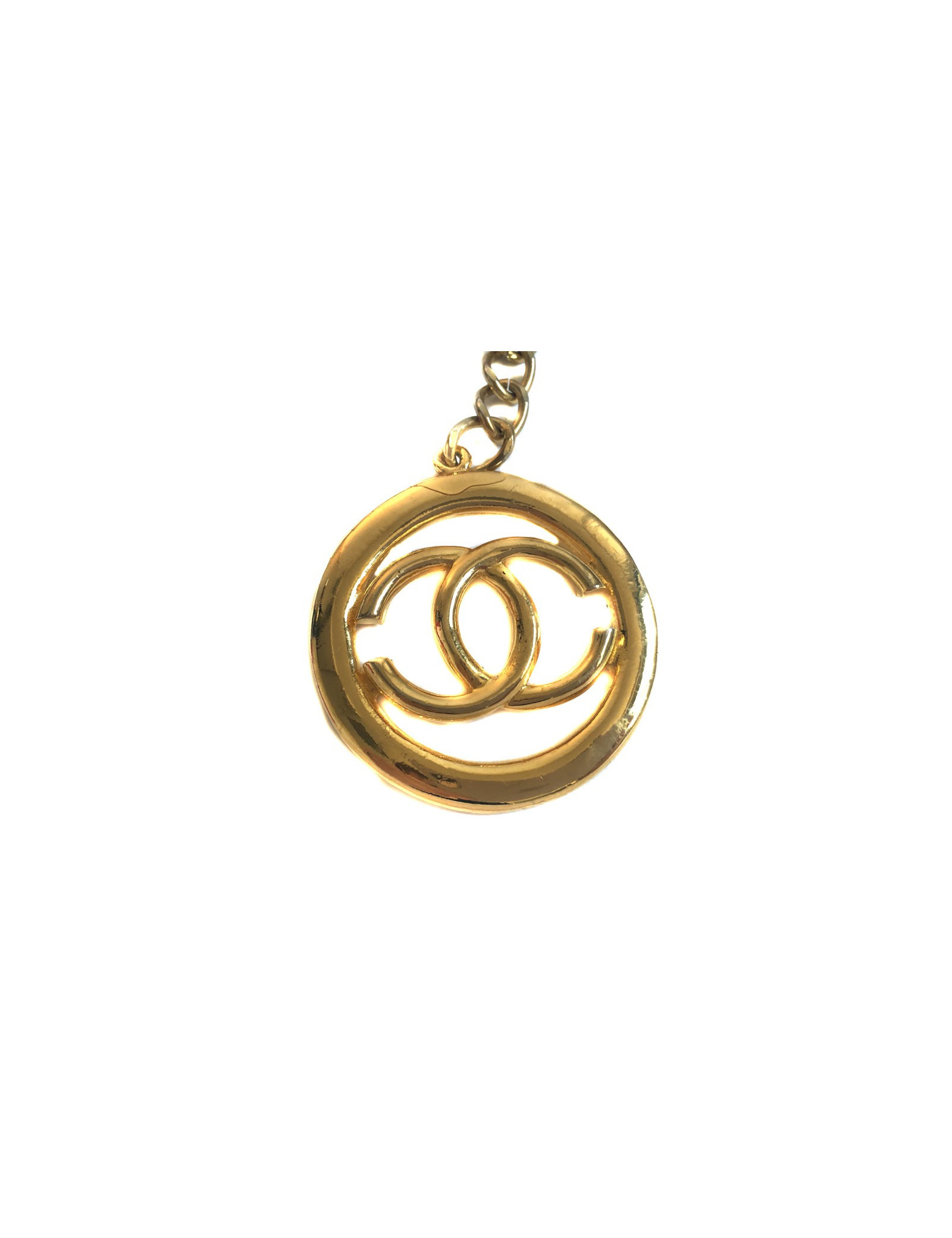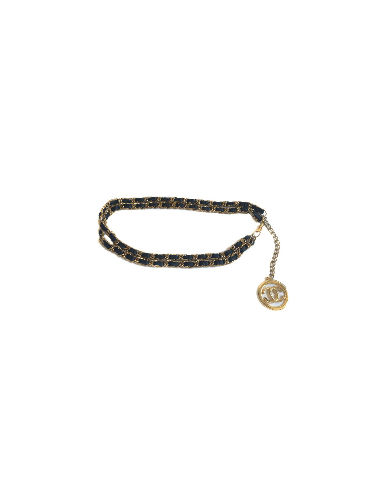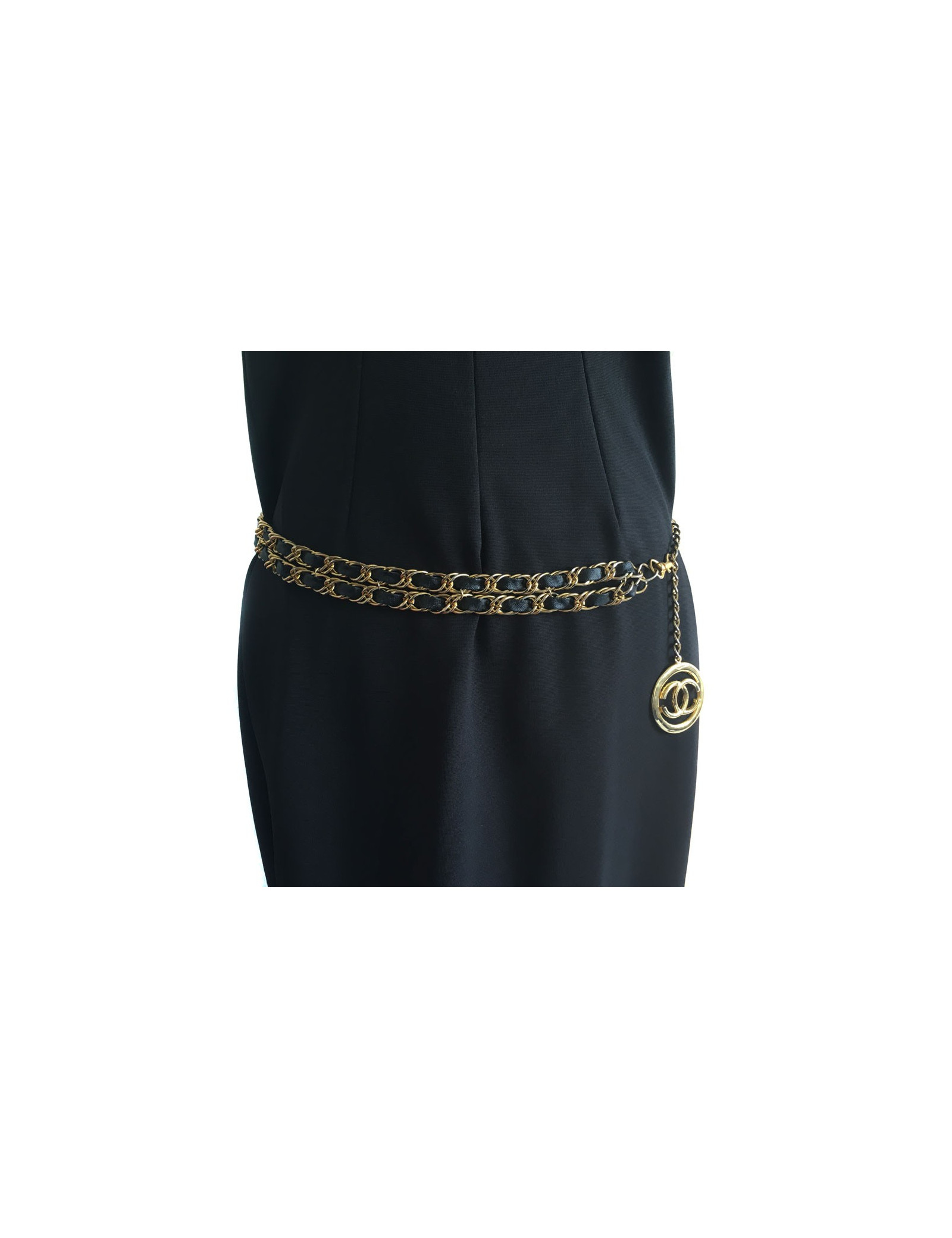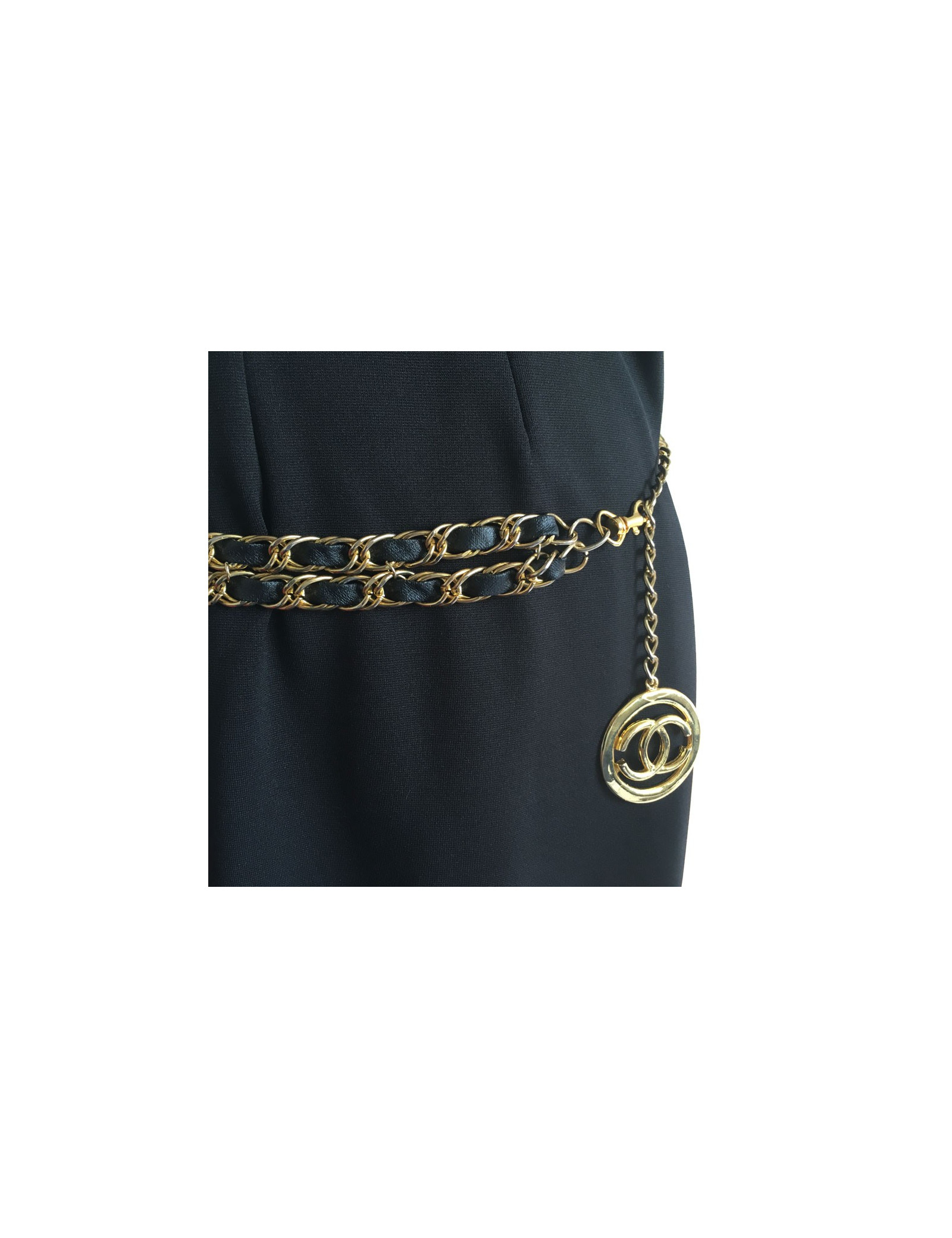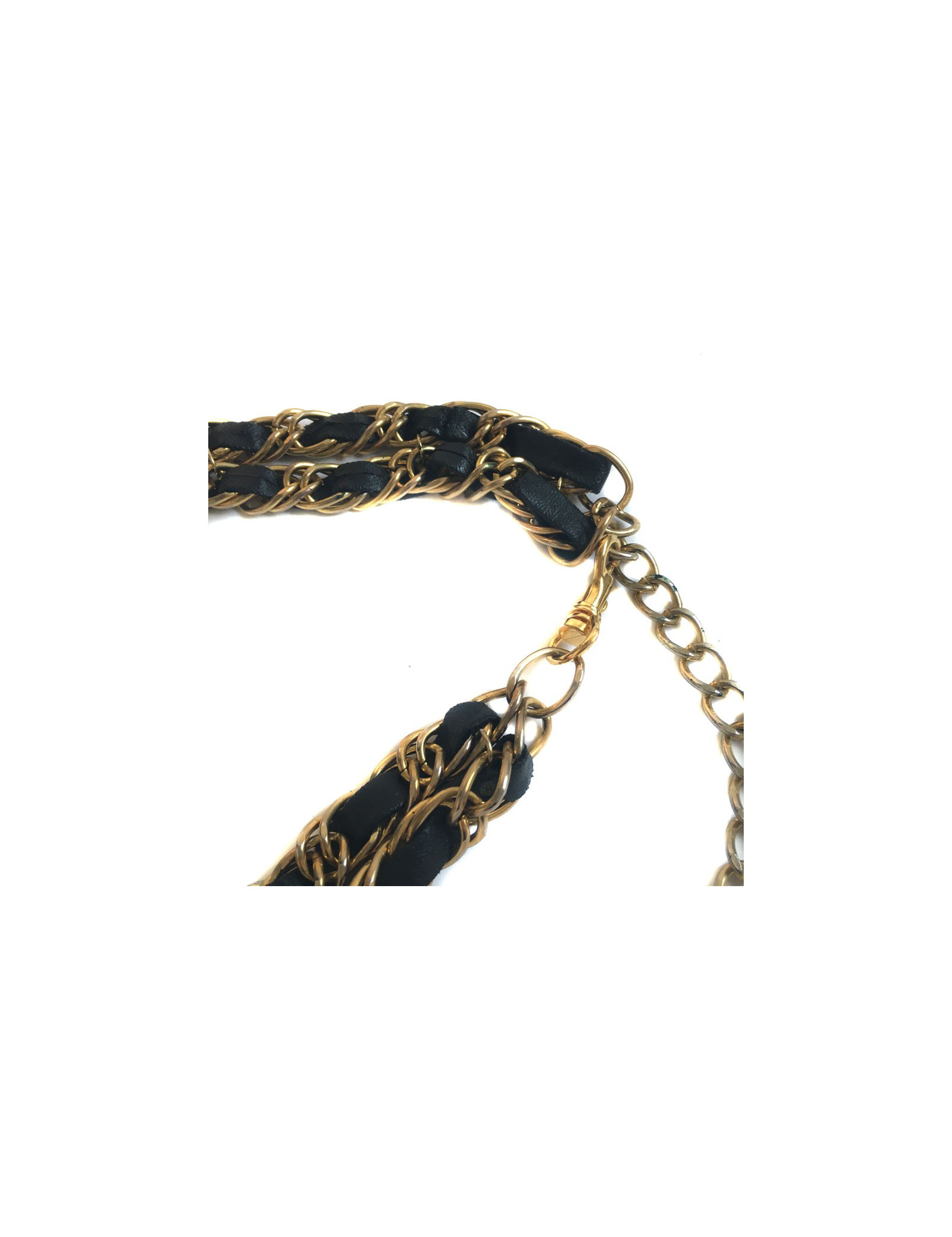 CHANEL vintage belt double row chain Golden interlaced with black leather. The belt ends with a CC in a round, all gold metal. Gilding is a little faded throughout the belt.