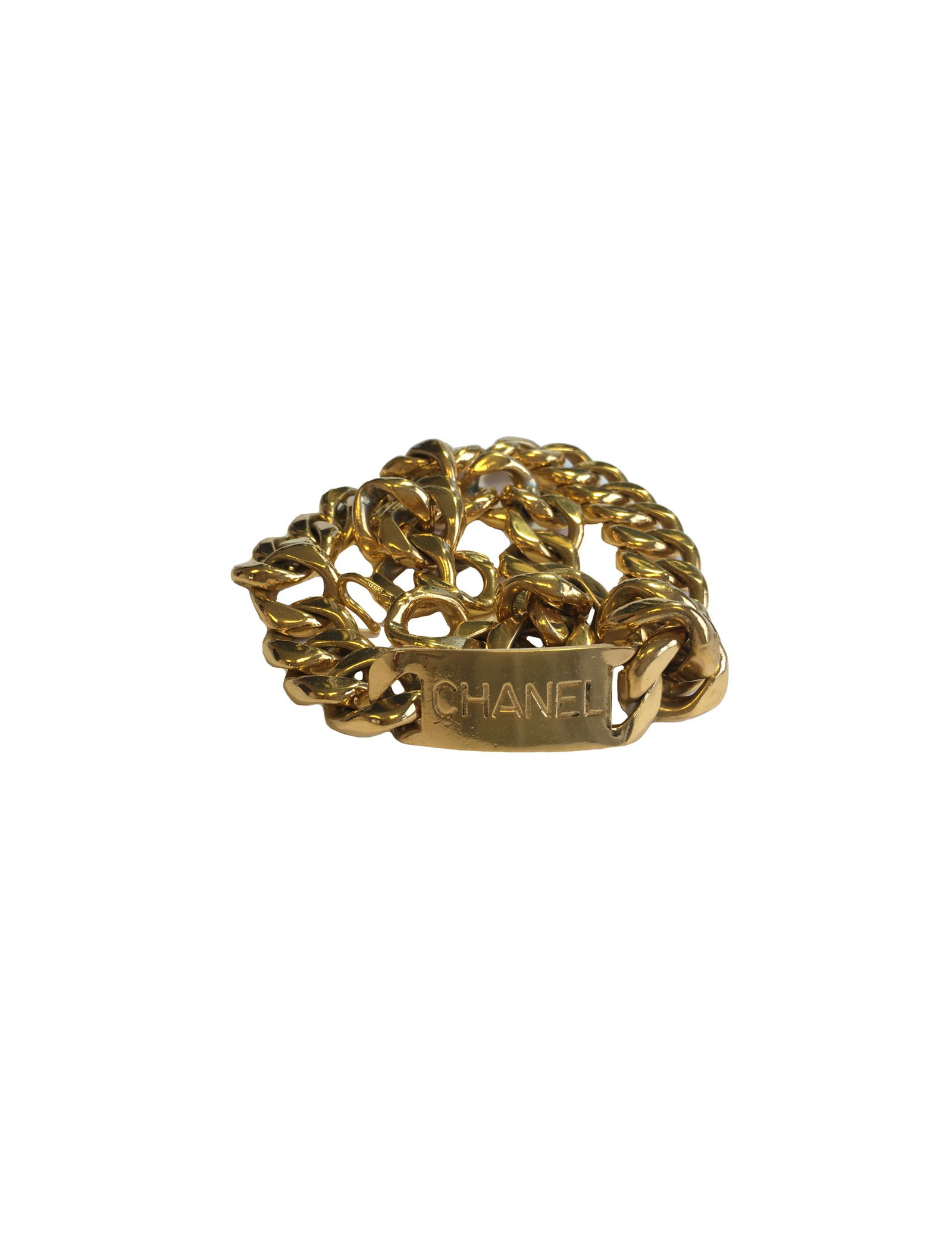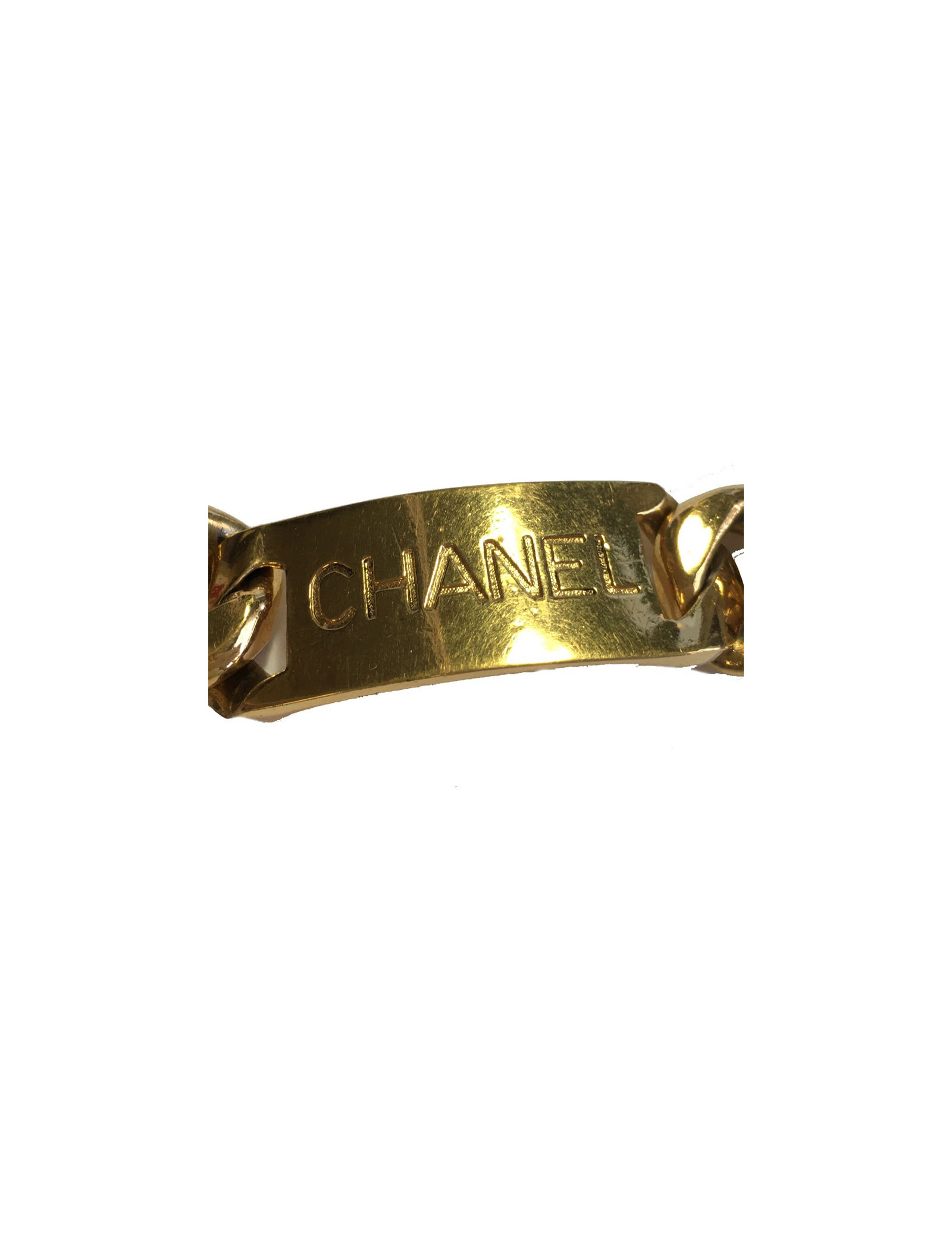80's !! CHANEL belt with big mesh in gilded metal. In the center a plate with the CHANEL brand engraved on the front.