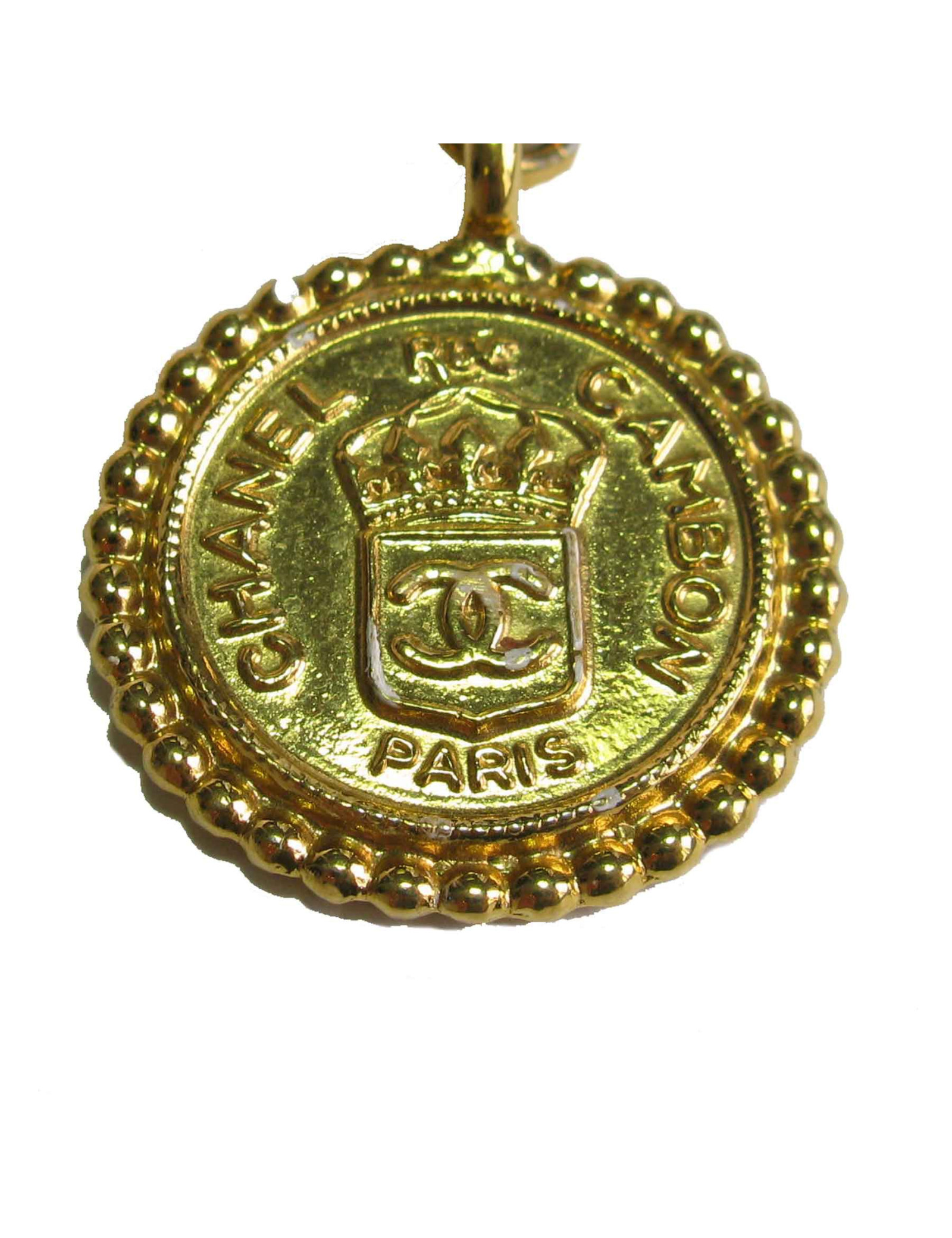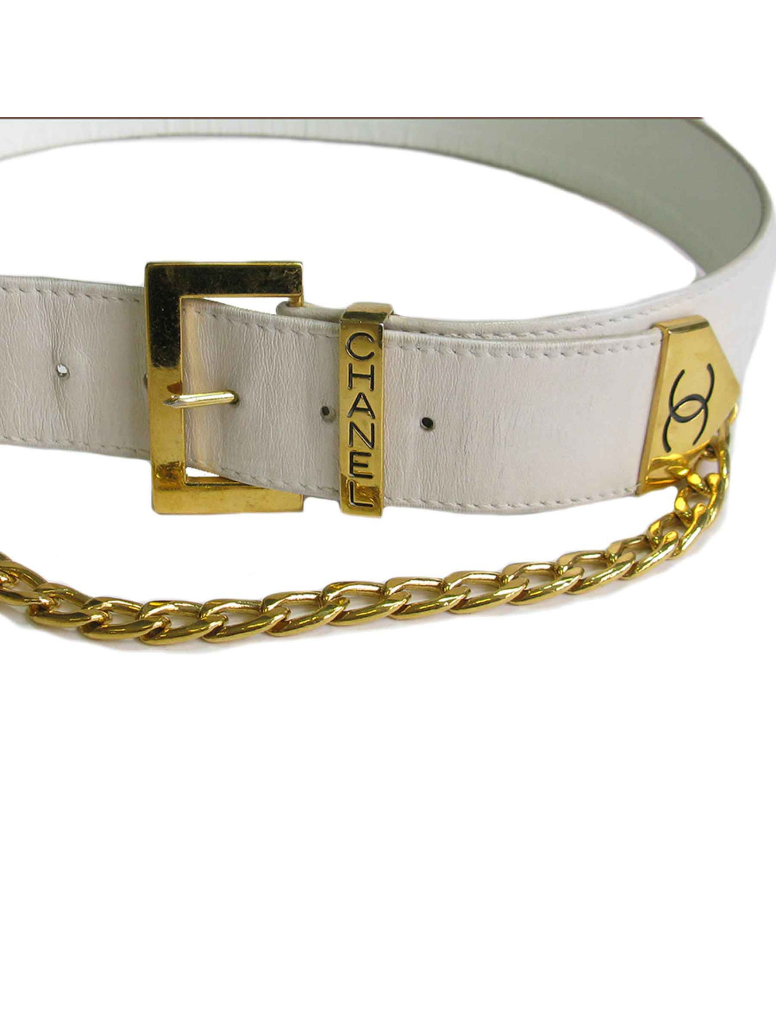 Chanel belt in white leather and gilded metal chain. Clasp in gilded metal. CHANEL inscribed on the clasp. A golden medal completes the belt.