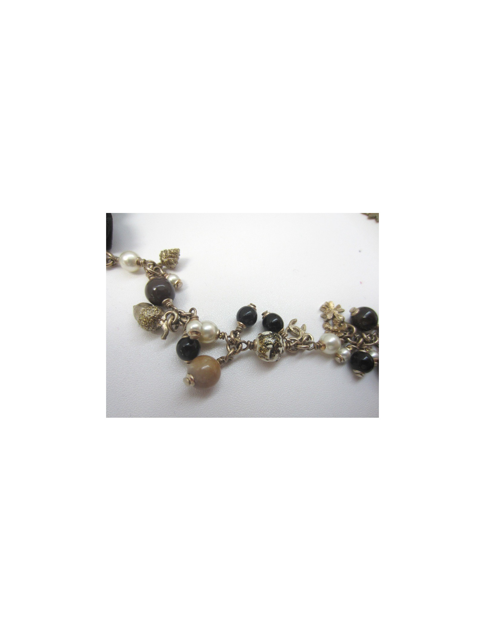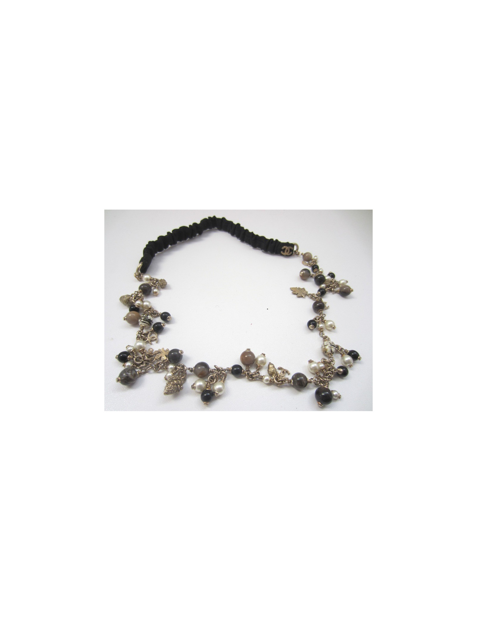 Lovely headband CHANEL in Pearly beads beige, Brown, brown black nuanced, cream and gold. There are also small oak leaves, pommee of pine trees, acorns and four-leaf clovers. A golden CC is also the birth of the fabric. 51.5 is the length total but expandable.