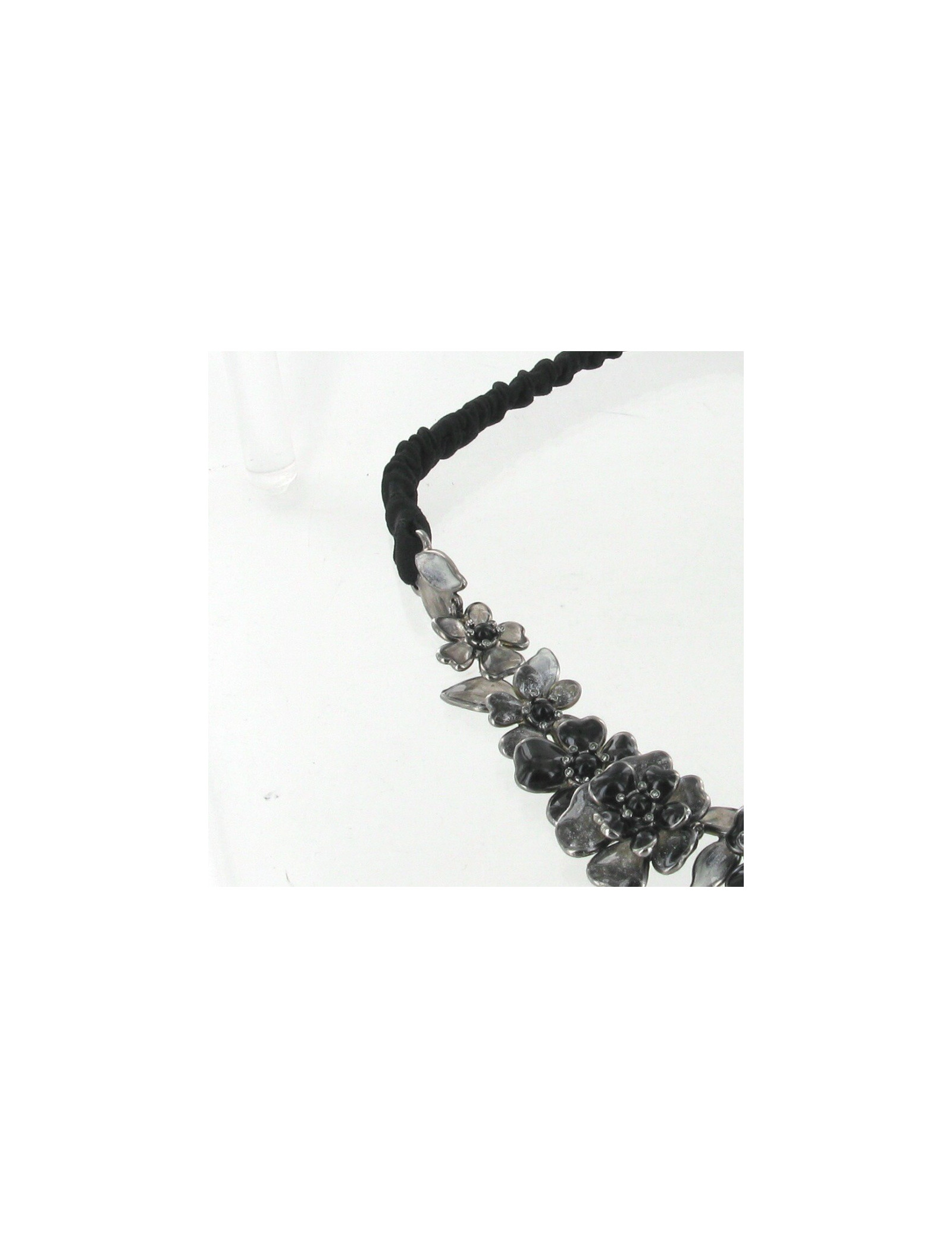 Sublime headband CHANEL camellias black, grey glass paste white and iridescent. One of the camellias is set with a nice aged silver CC. This headband is extensible through a black cloth covered elastic.