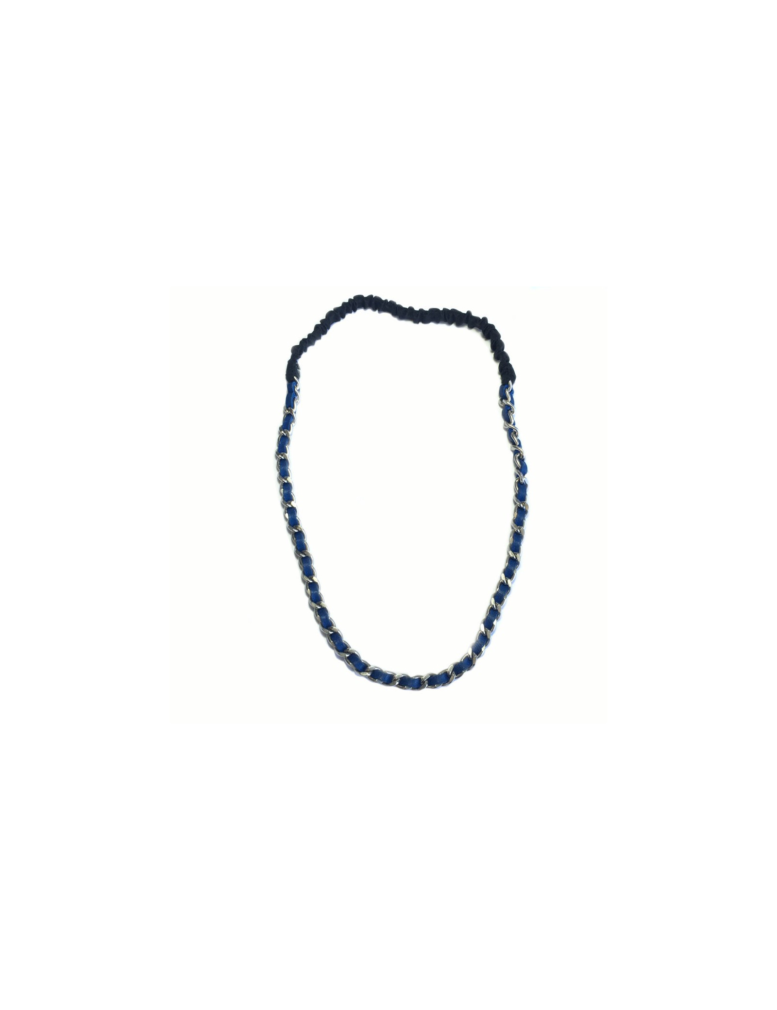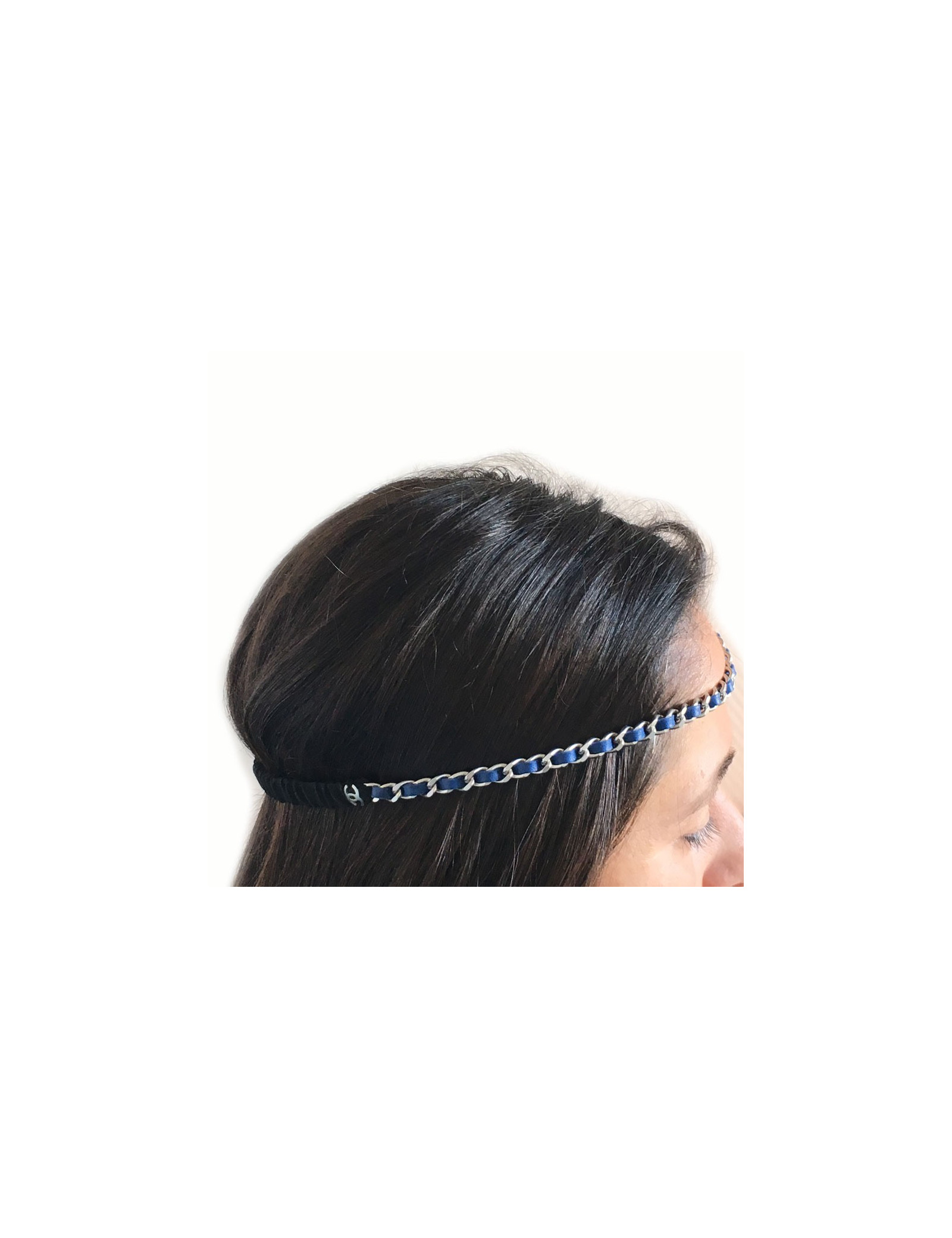 Gorgeous headband or CHANEL headband. Chain silver metal and blue striped leather. Black fabric covered elastic headband. A CC silver on the elastic edge. Never worn.