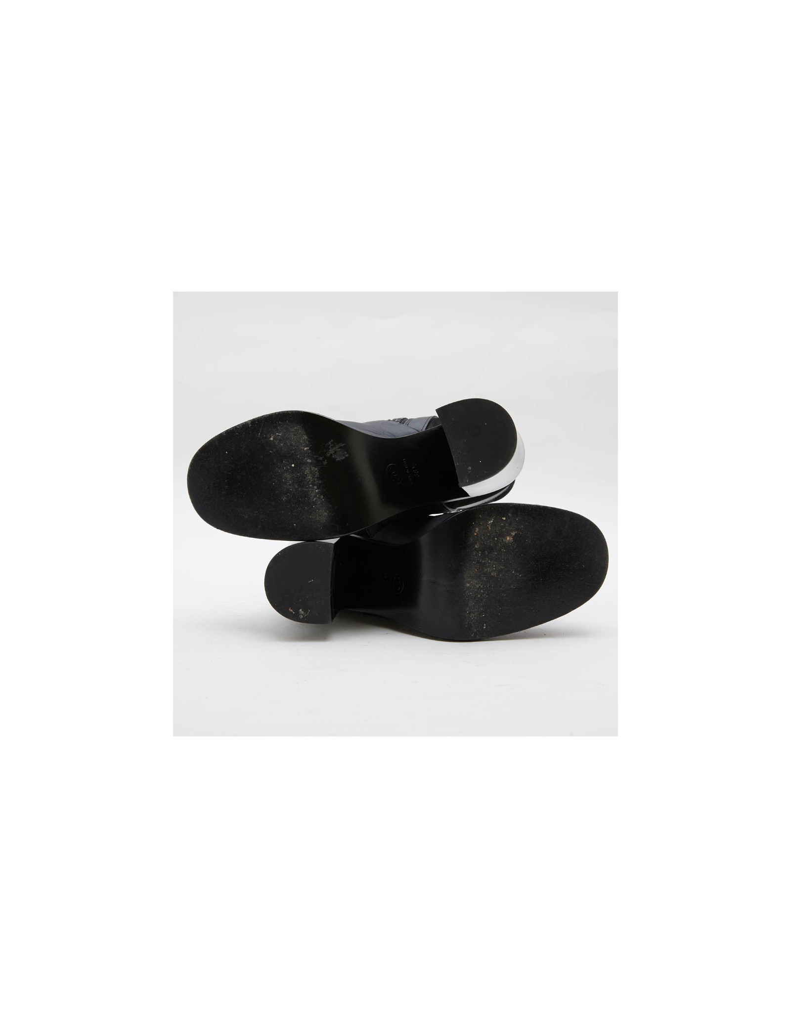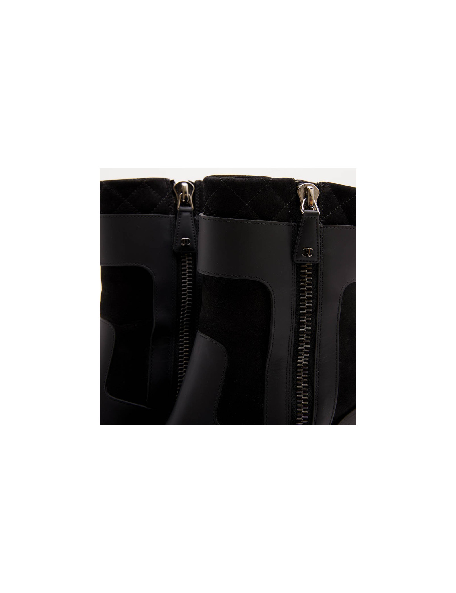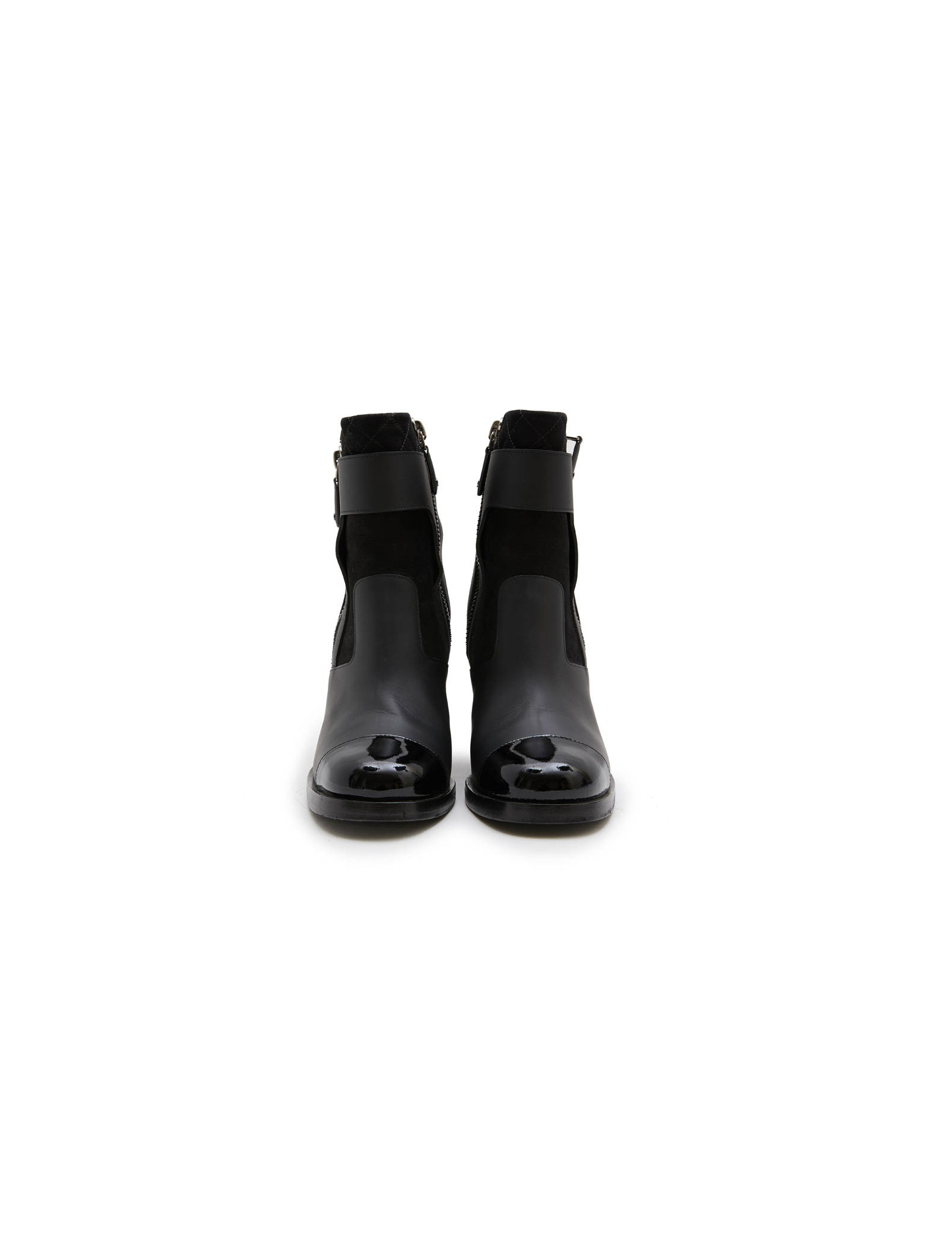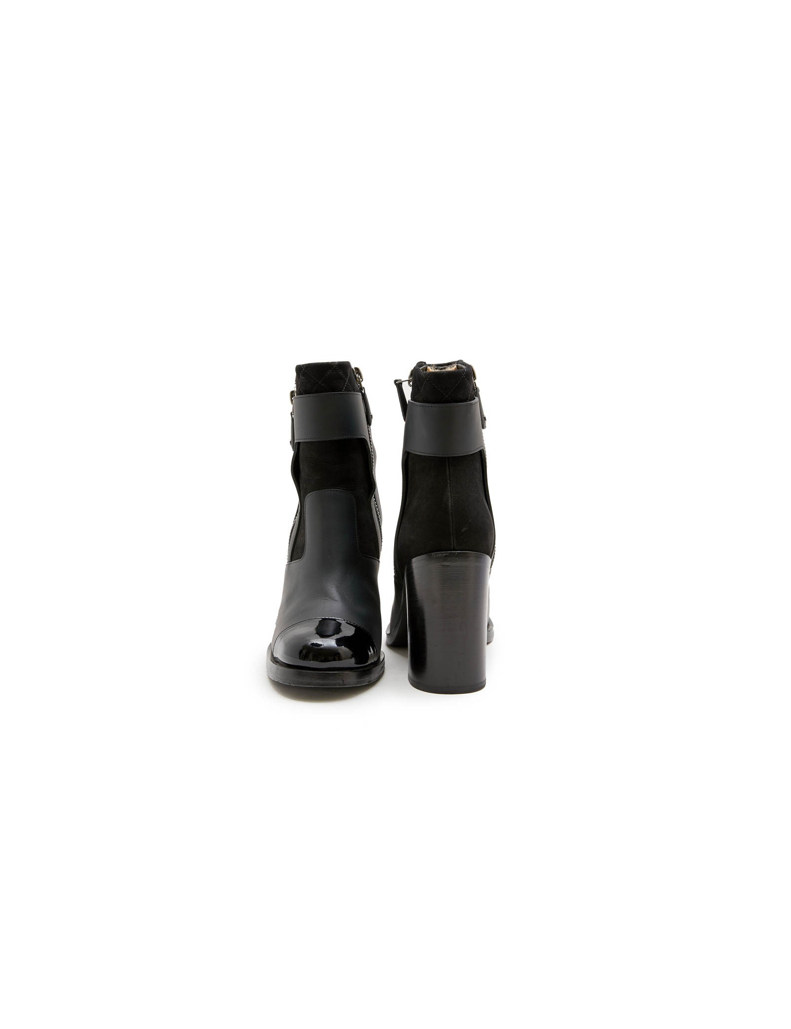Chanel ankle boots in black leather. Silver metal hardware. The tip is in black patent leather. Alpaca inside. They close with a zipper on each side of the ankle.
