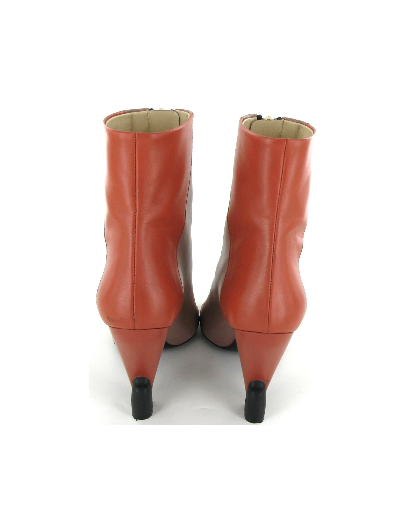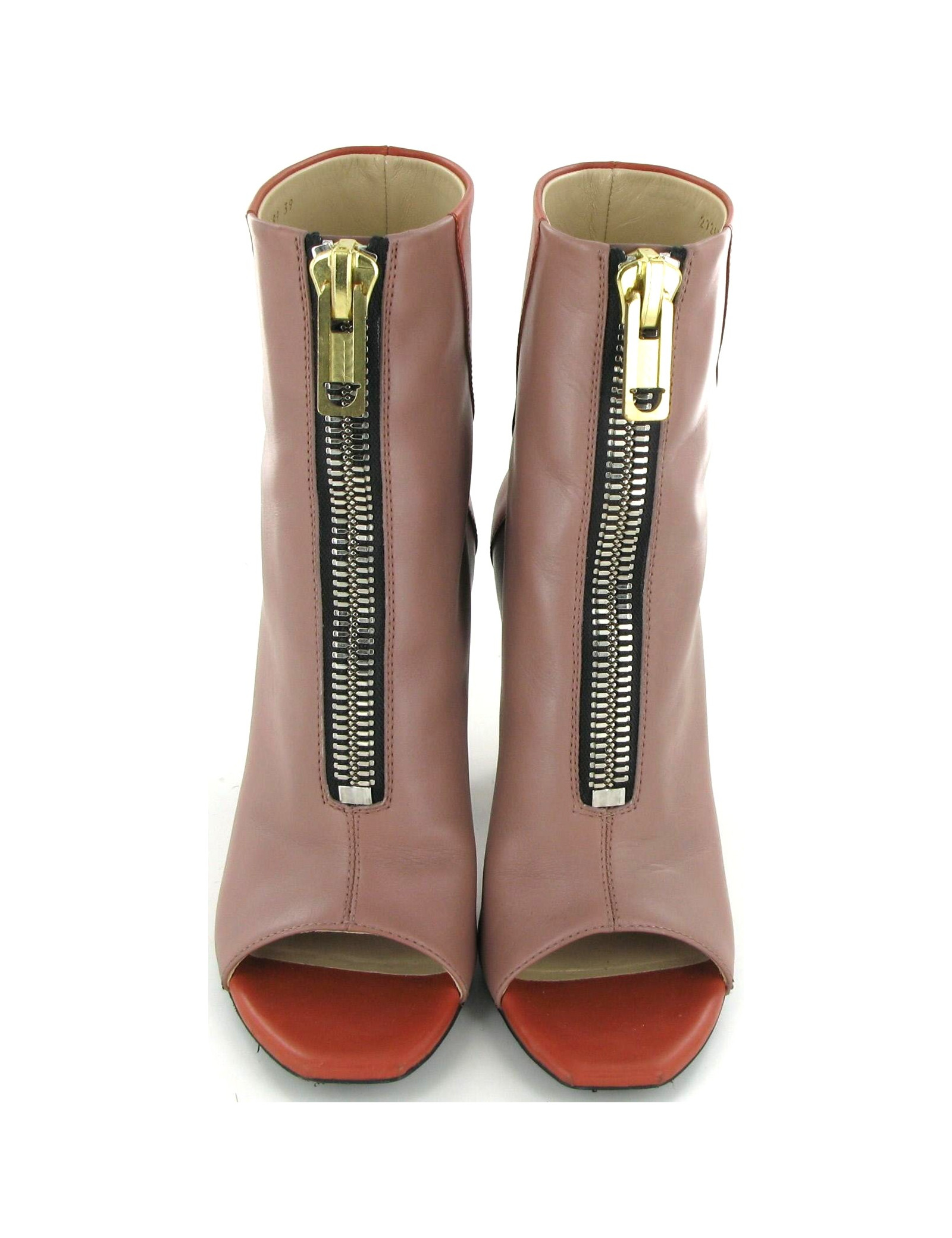 (Open toes) BALENCIAGA leather booties, old color pink and dark orange, size 39. These boots are so comfortable that trend. Covered tapered heel of leather, shape arty. Front of the foot to the square shape. Wide zips are bi-colour: Silver zipper and zip brass. Mark Huey zips are the world reference for the Couture houses. Scope that on one occasion, this pair is in perfect condition. Size: 39, Sole length: 25.5 cm Width: 8 cm, Heel height: 10.5 cm Zip length: 16 cm, Ankle width: 23 cm