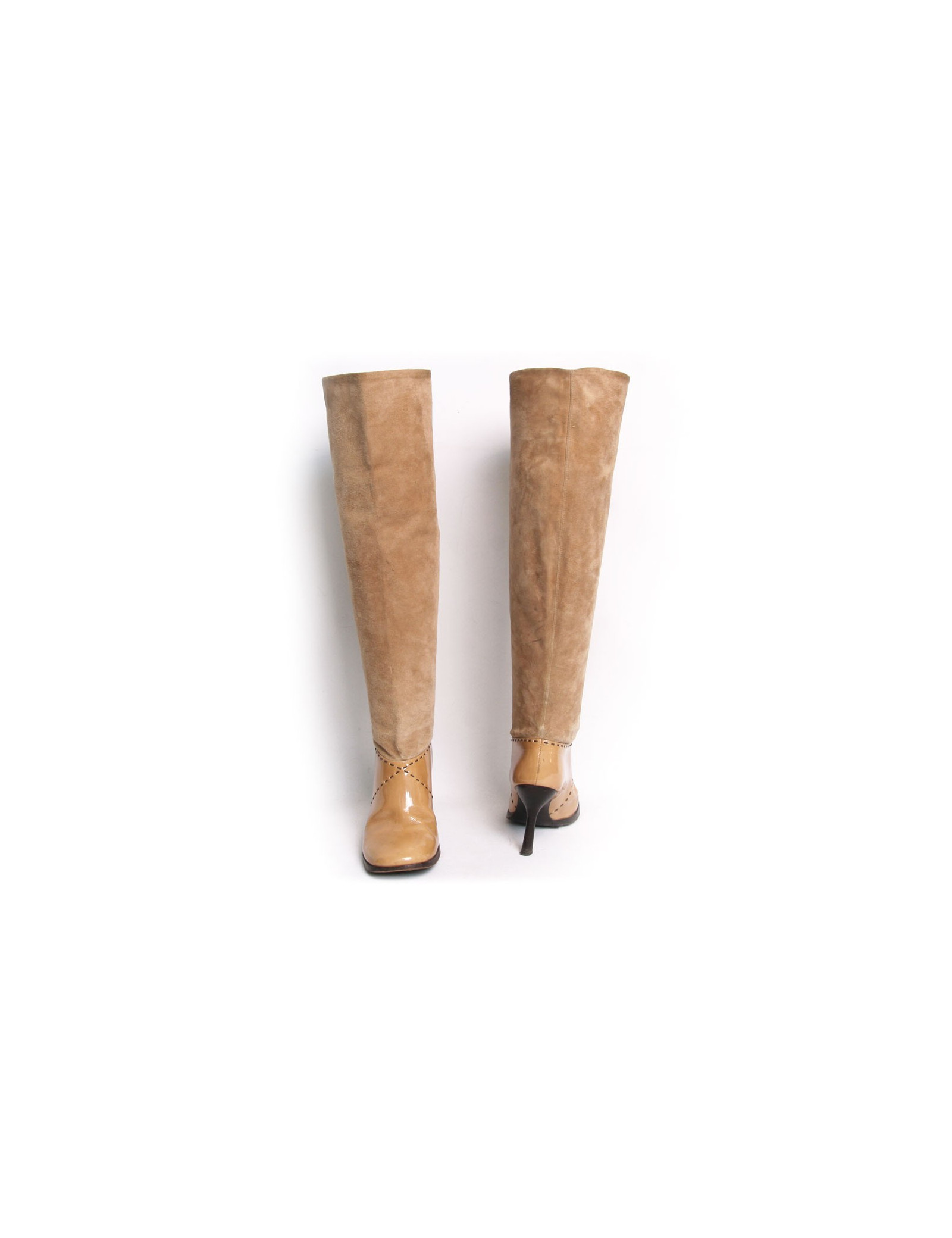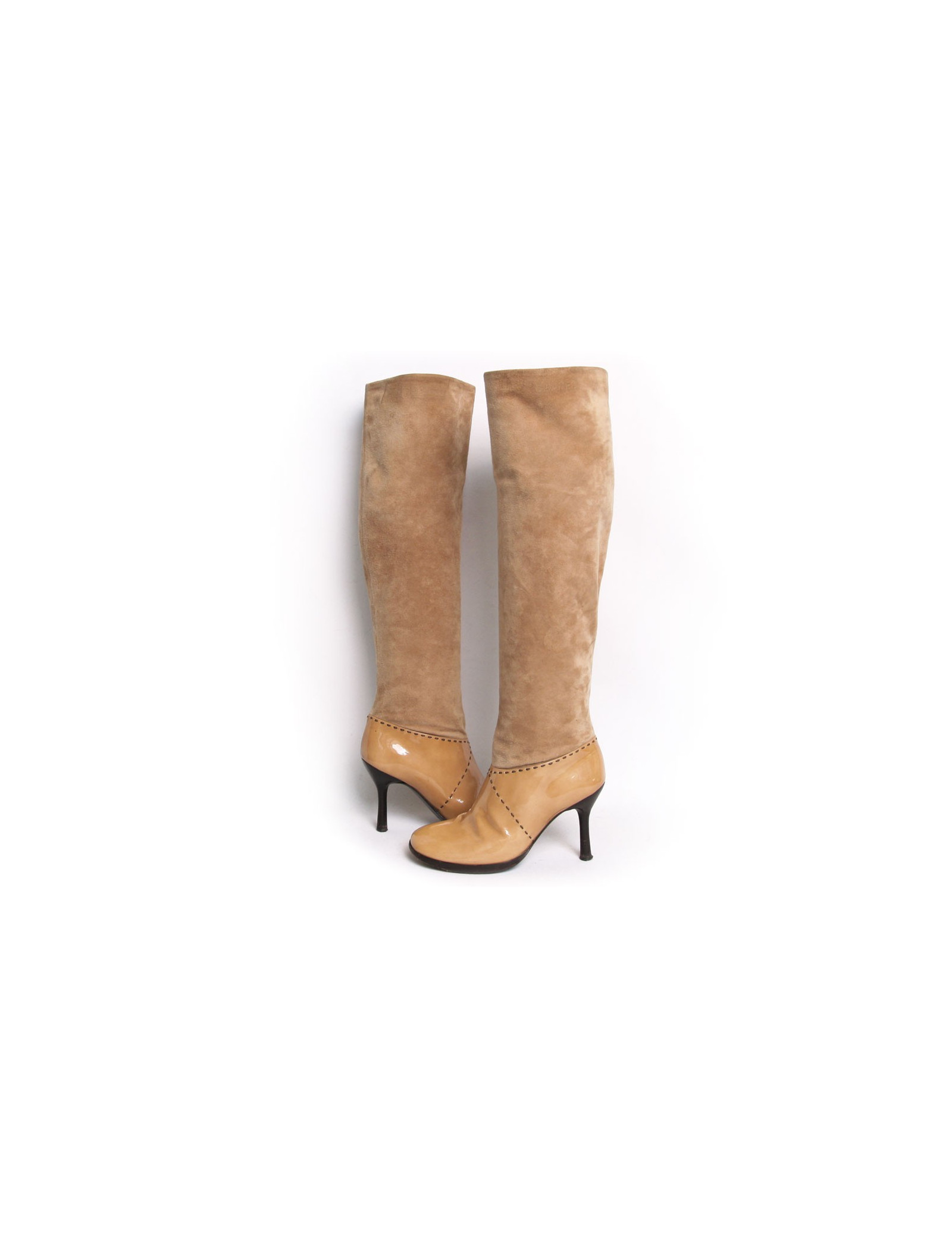 Chanel heels in beige suede and patent leather boots. Size 39.5. Topstitching are dark brown. The heel is fine. The Chanel logo is registered at the top outside of each boot. In very good condition. Light small black marks on suede of the left shoe but very inconspicuous. Slight fold to use at the front of the boots wear. See photos.