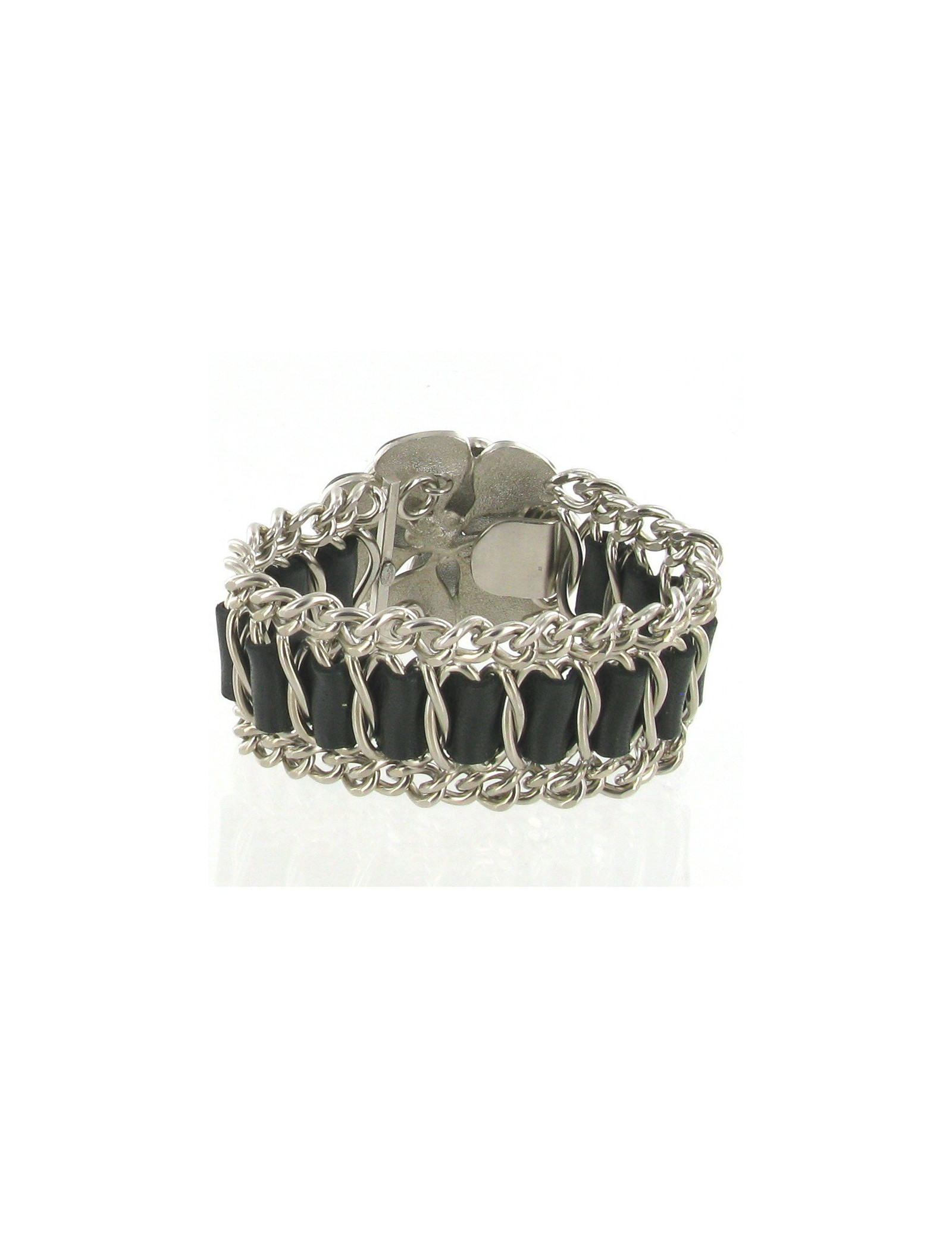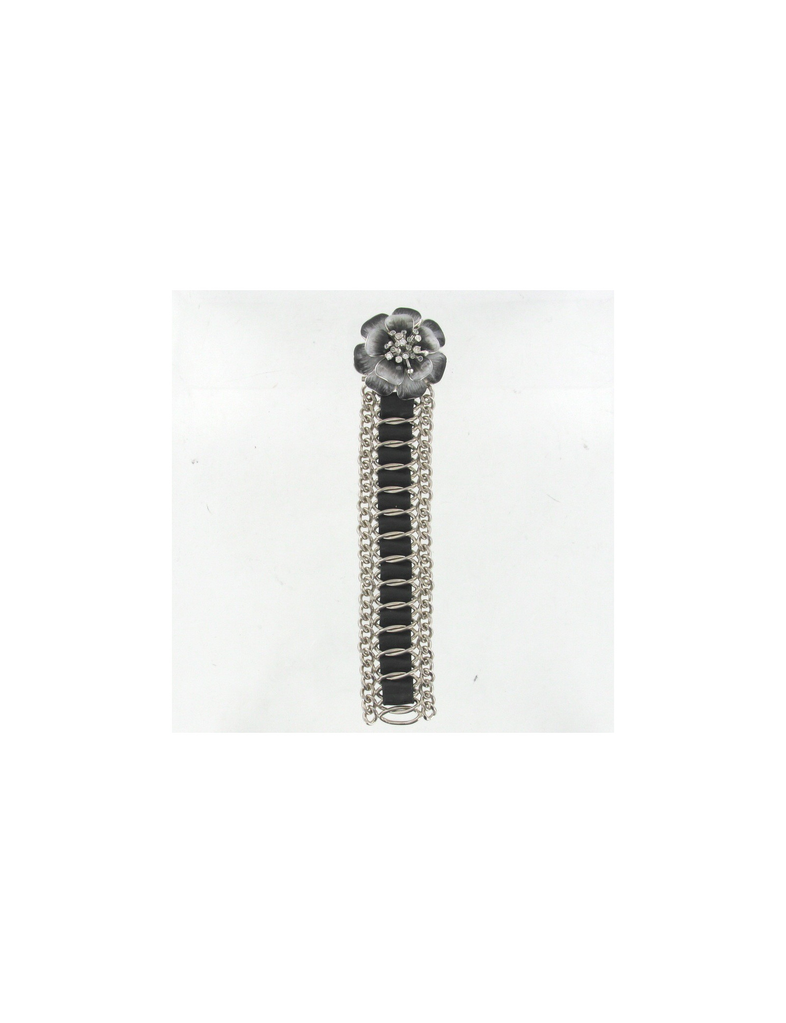 CHANEL Camélia bracelet glass paste, silver chain ring and black leather