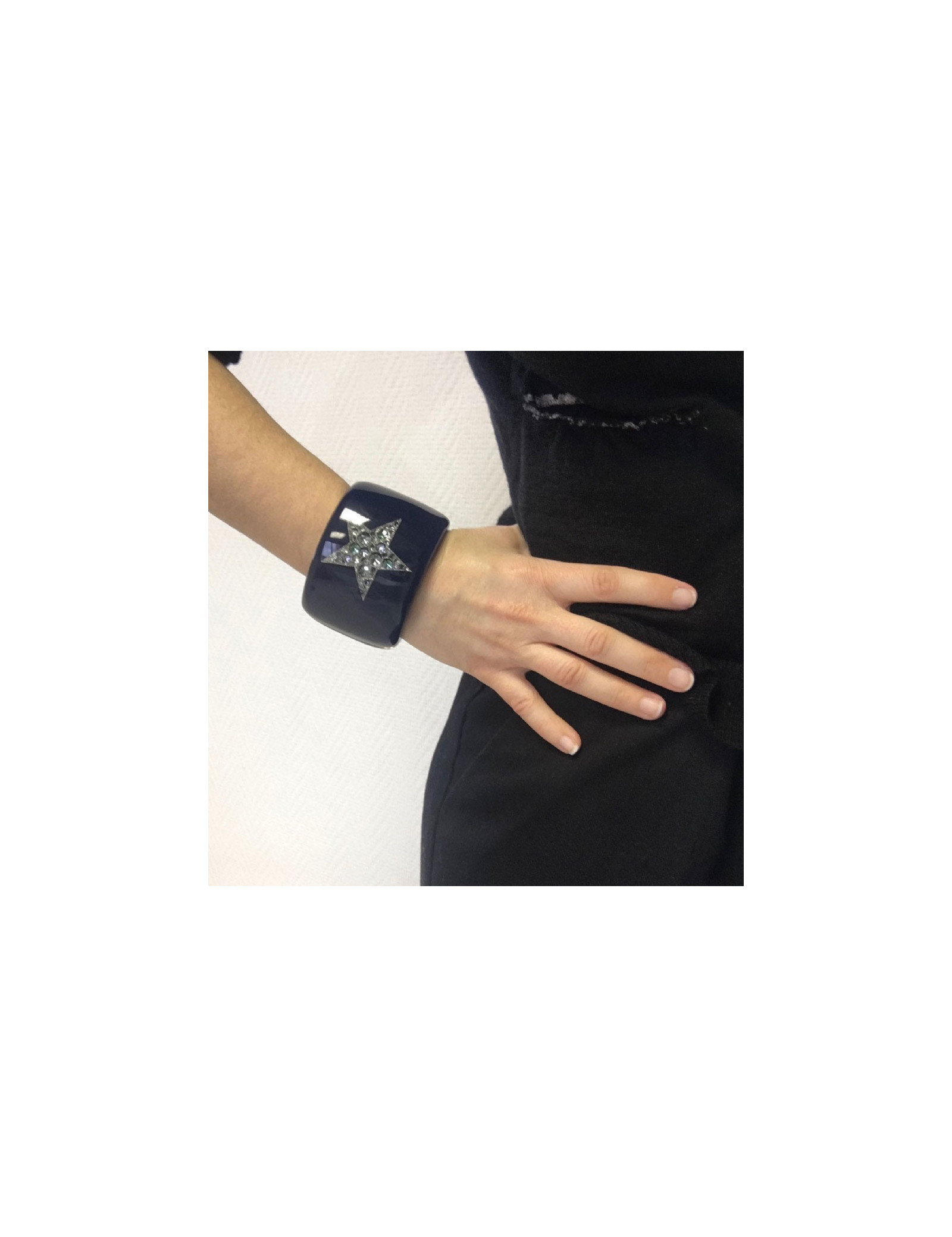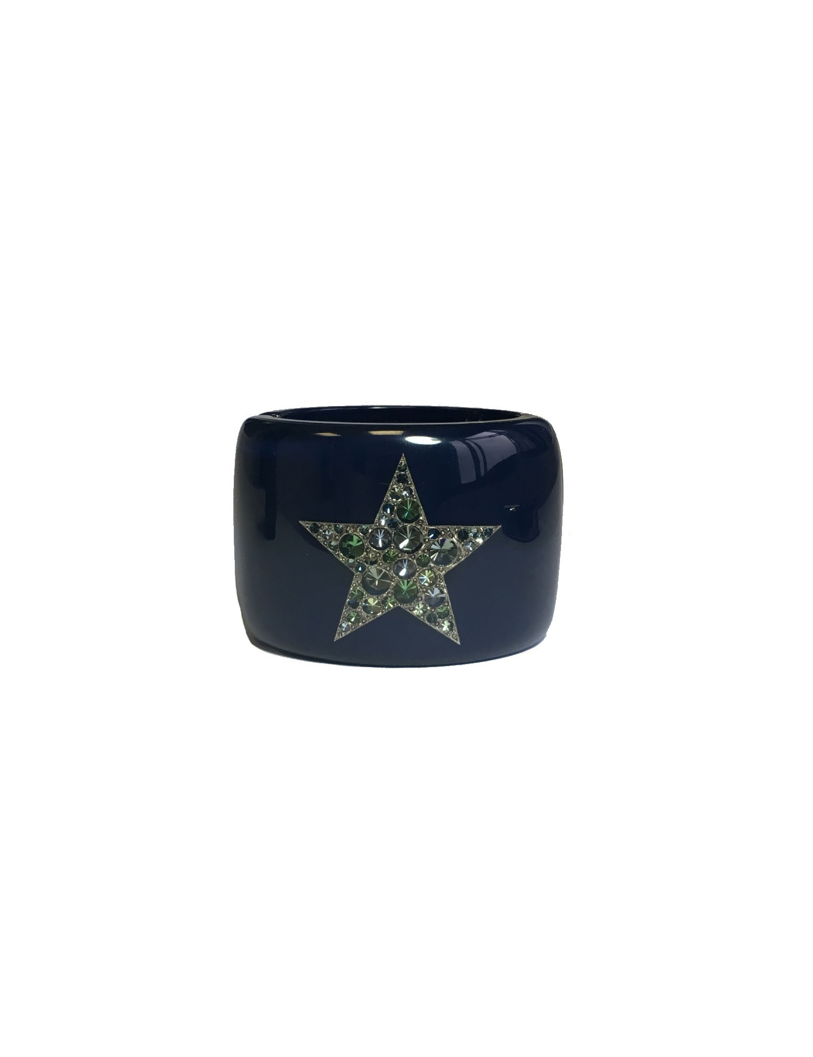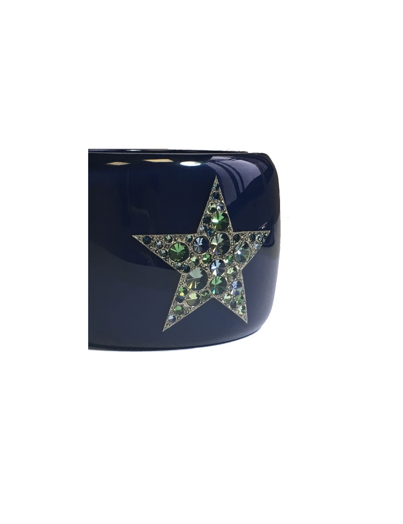 Beautiful Chanel cuff in blue lacquered resin. CC and star set with an inclusion of green, blue and white rhinestones.