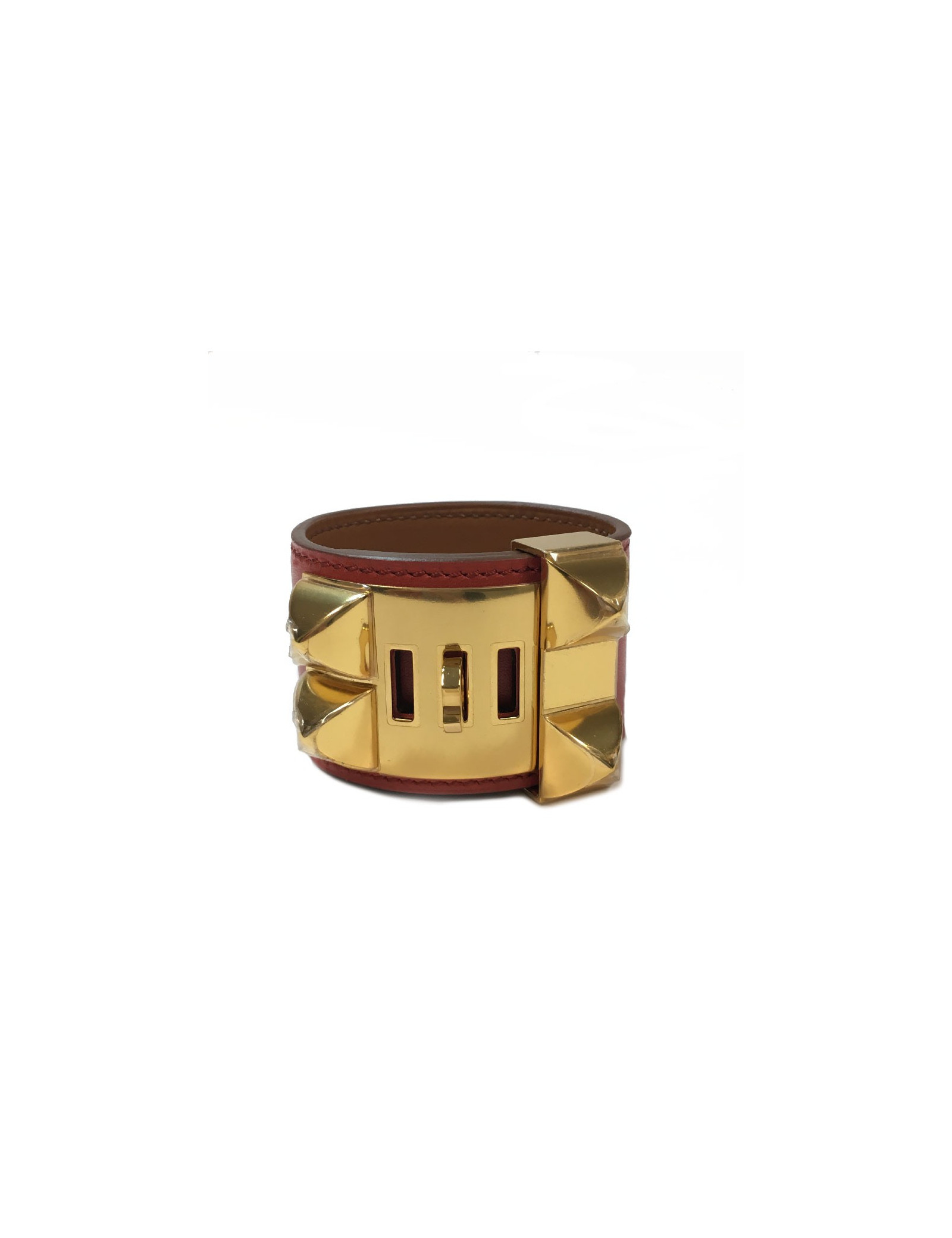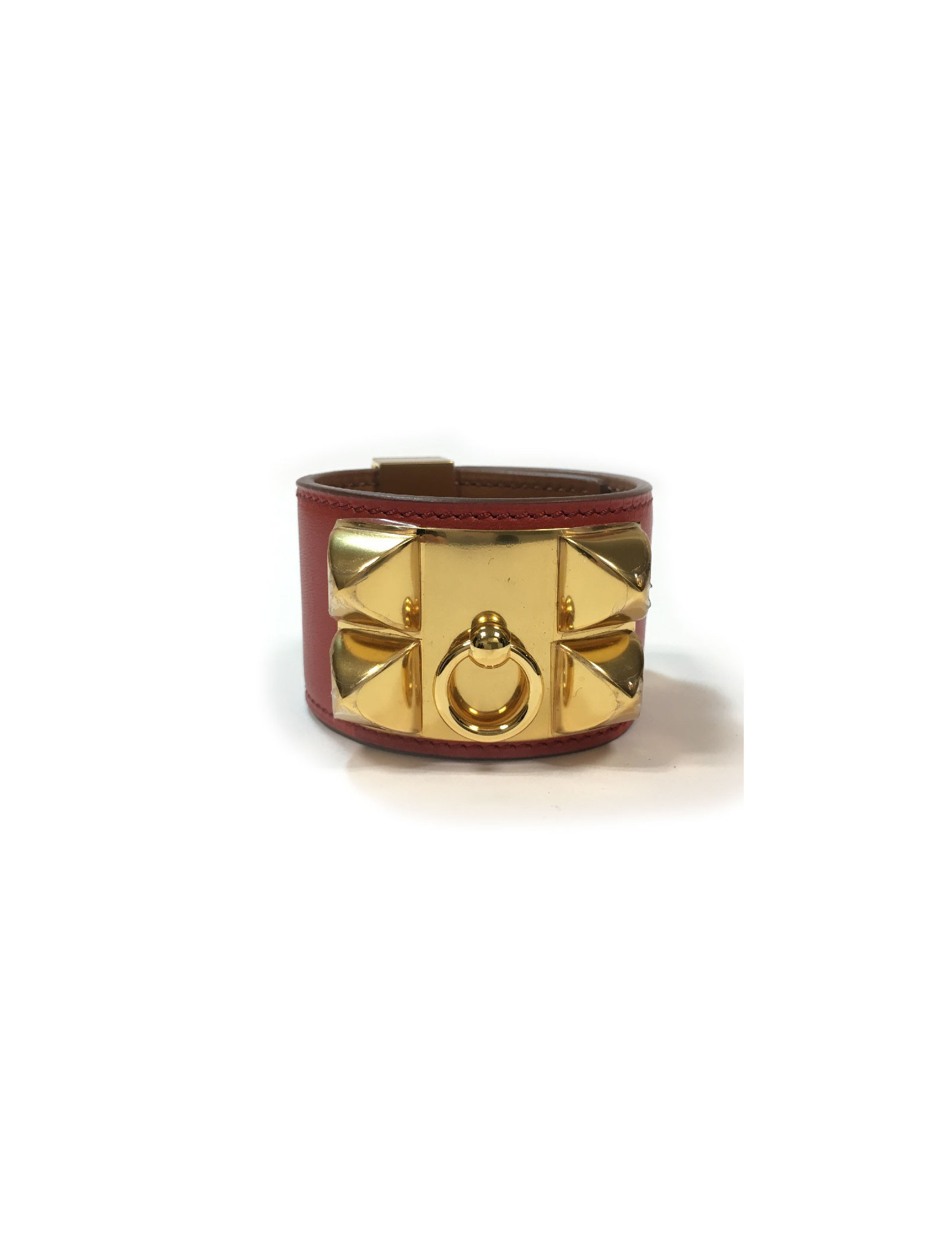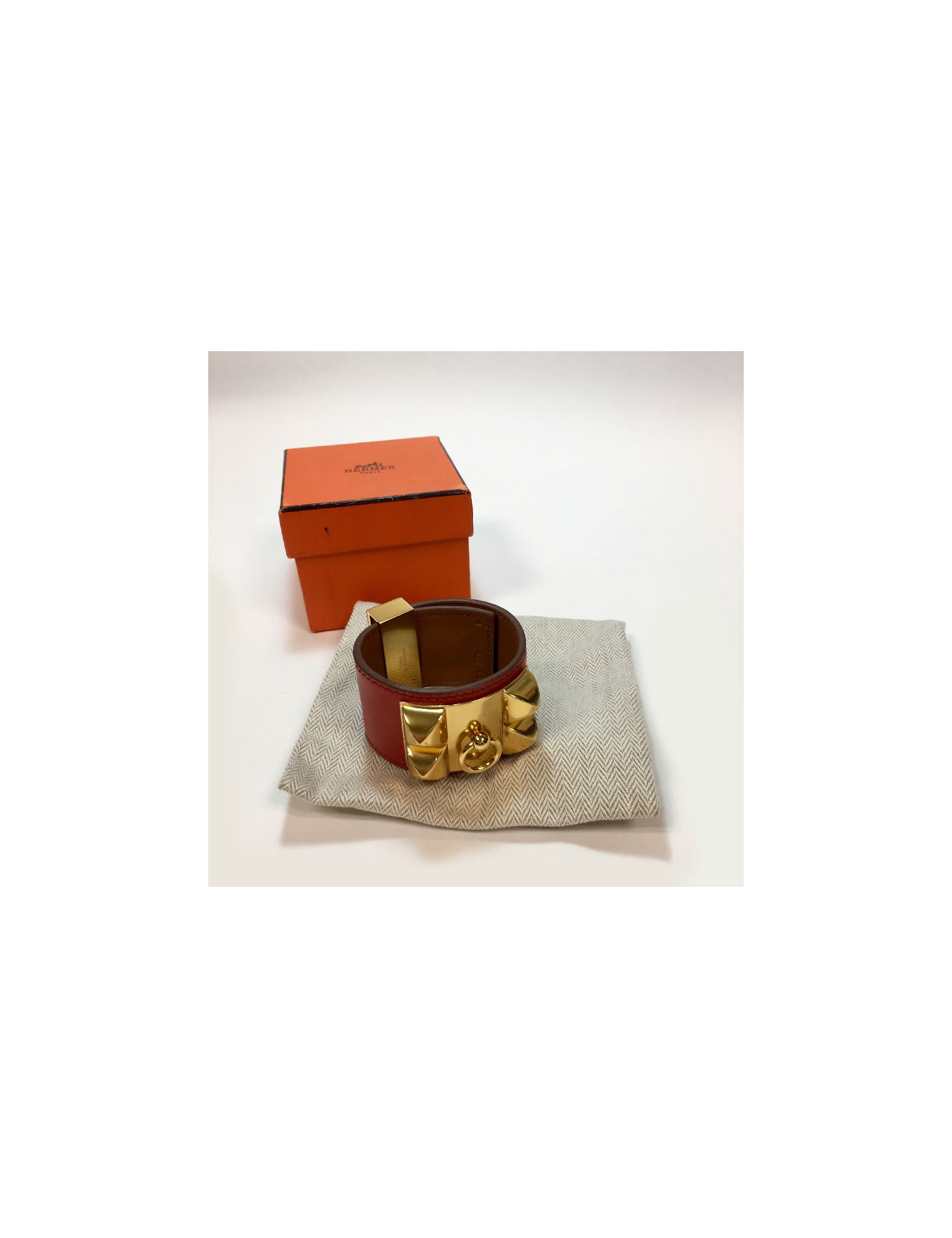 Last items in stock BRACELETS HERMES alligator Collier de chien cuff HERMES 25485 1,450.00 € HERMES alligator Collier de chien cuff Condition: newMade in FranceSize: SMaterials: alligatorColors: sanguineHardware: palladium silver finish metal (plastic protections still on)Letter: T (2015) and S for salesMeasurements: width: 4cm, wrist circumference at its longest: 17 cmDetails: Hermès Dog Collar cuff size S in sanguine alligator leather Advantage... Add to cart