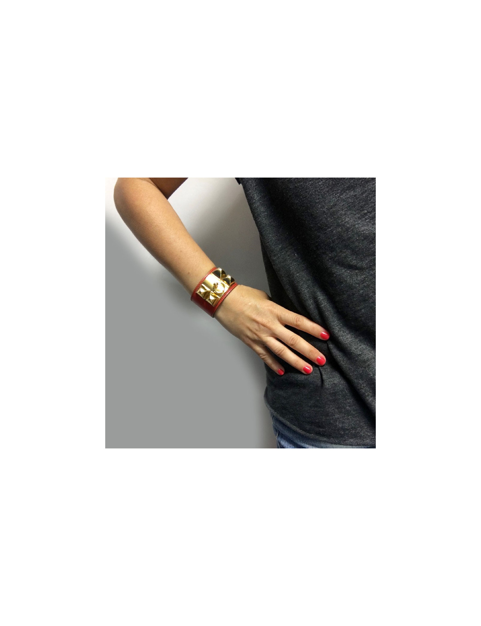 Last items in stock BRACELETS Unbranded leather and 18 k gold bracelet AUTRES MARQUES 16575 880.00 € Unbranded leather and 18 k gold bracelet Condition: good (the gold parts have patina)Matrials: leather, 18 carats goldColors: brown, goldMeasurements: length: 16cm, height: 1cmDetails: Lovely rigid bracelet in aged brown leather with beige saddle stitching. The corners are in solid 18-carat gold, set with 2 aged coins, in the spirit of Bulgari jewelry. It... Add to cart