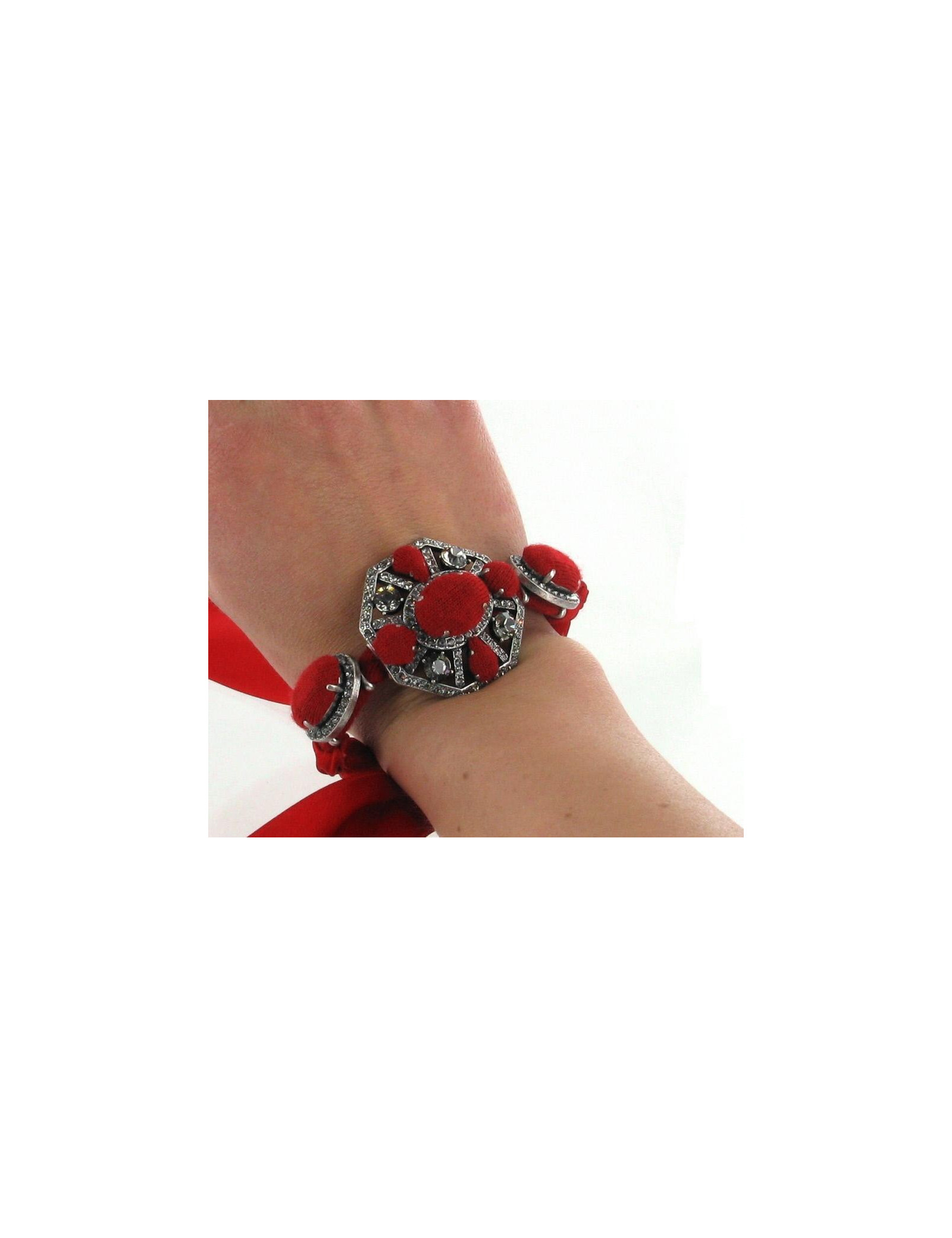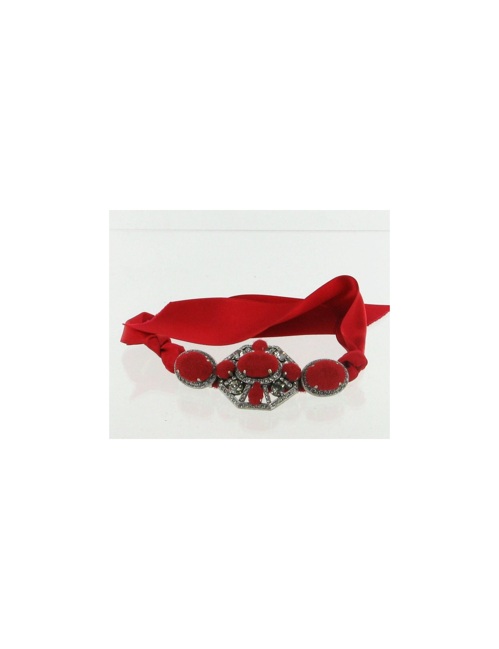 This LANVIN bracelet is decorated with 3 jewelry in downtown Silver set with Rhinestones. This bracelet interweaves Red satin, red fabric and the 3 Central bojoux. Fits any wrist widths since the clasp is a Red satin ribbon which is bound. Comes in its original box and its pochon of origin.