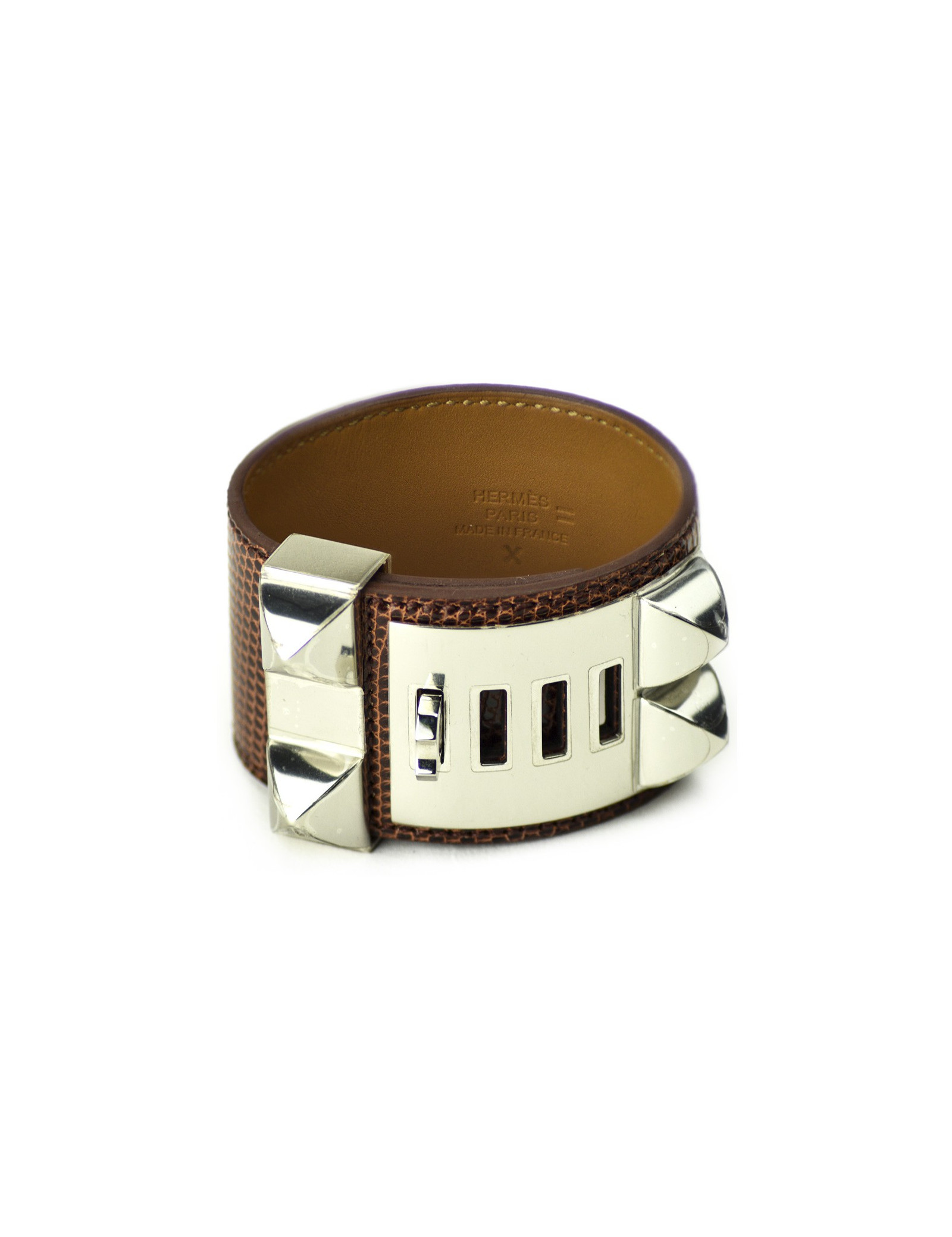 The cuff is a timeless model from HERMES. It represents a dog collar in smoothed Etrusque-colored niloticus lizard leather. The cuff's hardware is in palladium-plated silver.