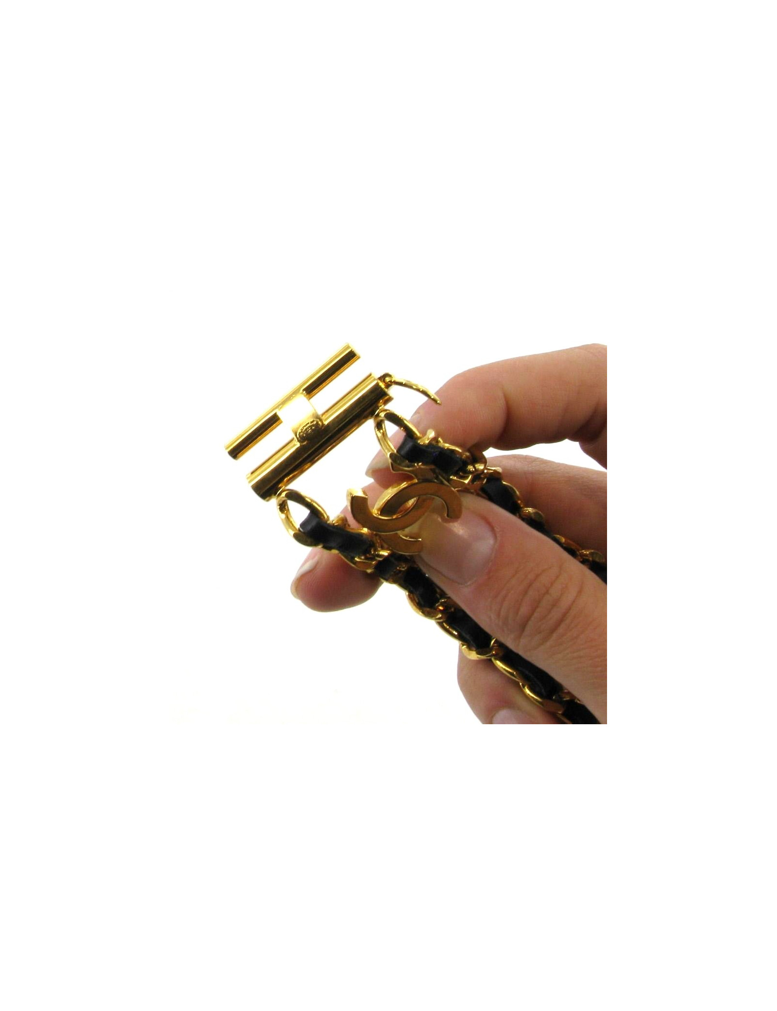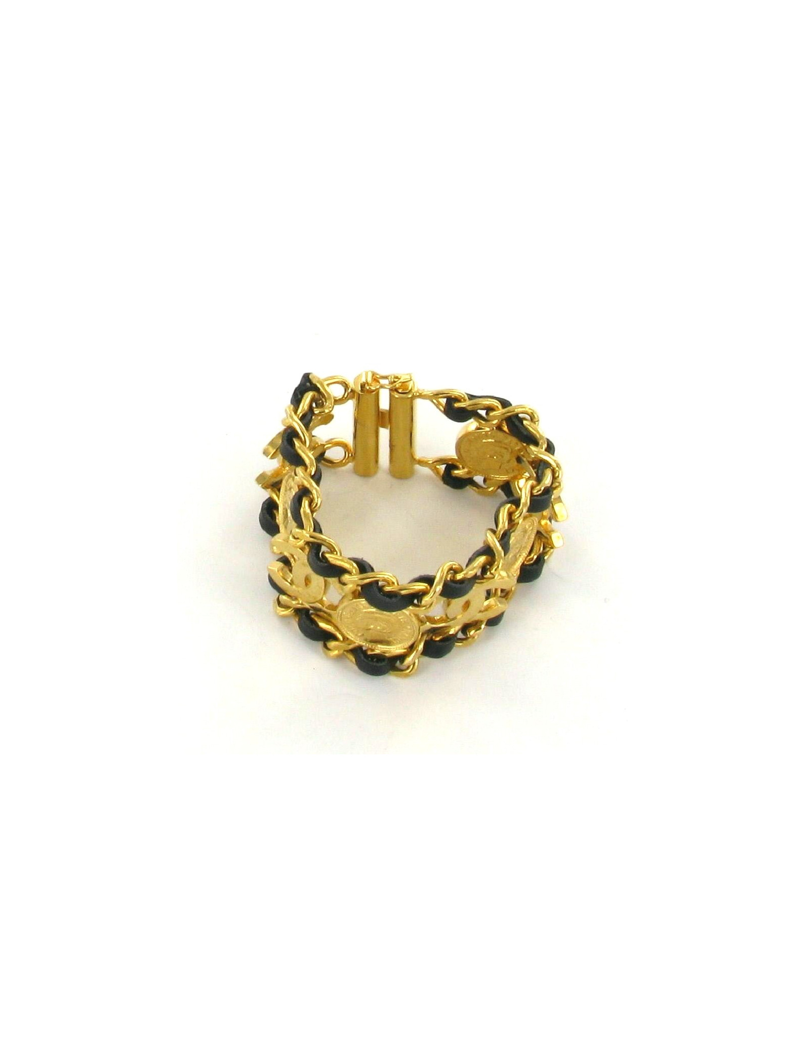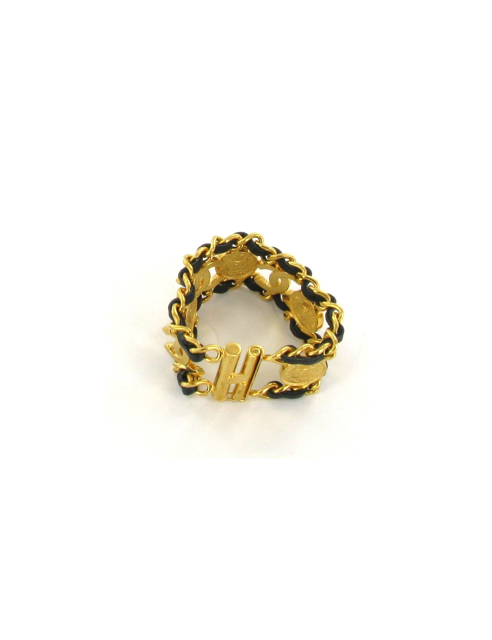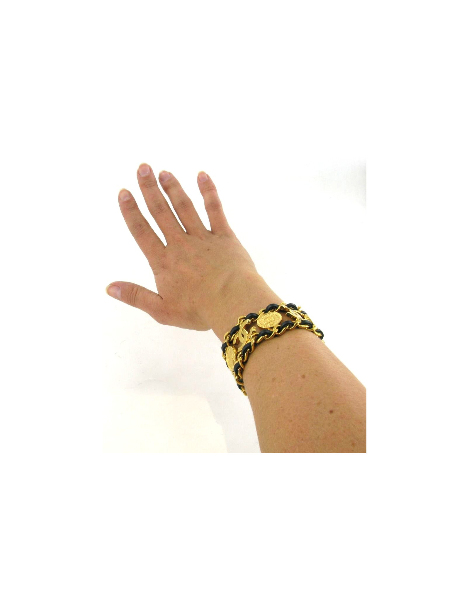 Bracelet CHANEL black lambskin interlaced gold metal. This sublime cuff consists of two strings Recalling bags classic timeless, as well as several CC signatures and engraved pieces of the portrait of Coco Chanel and Chanel "COCO CHANEL PARIS FRANCE". It is a real collector piece. Metal gold with double safety clasp. Scratches from wear.