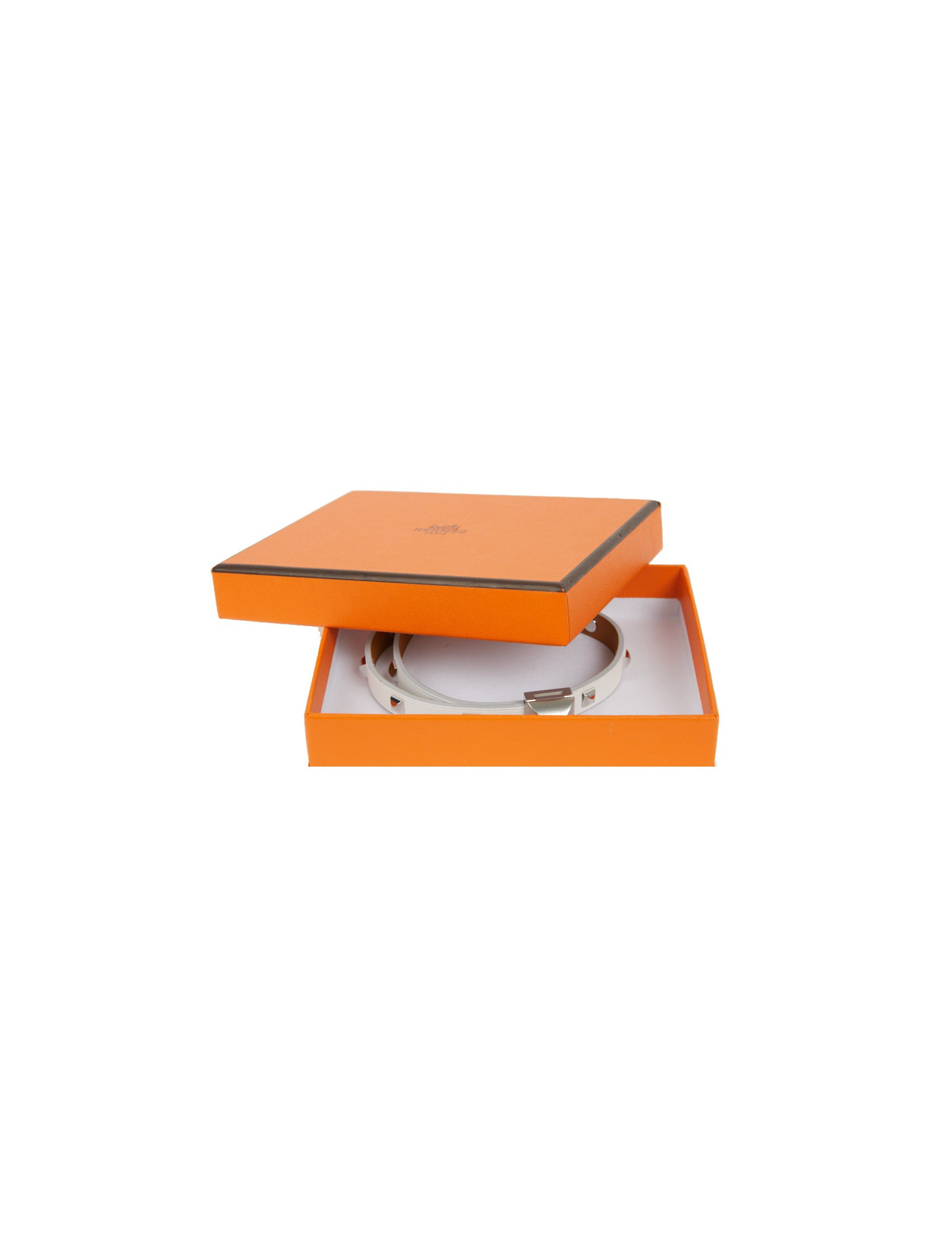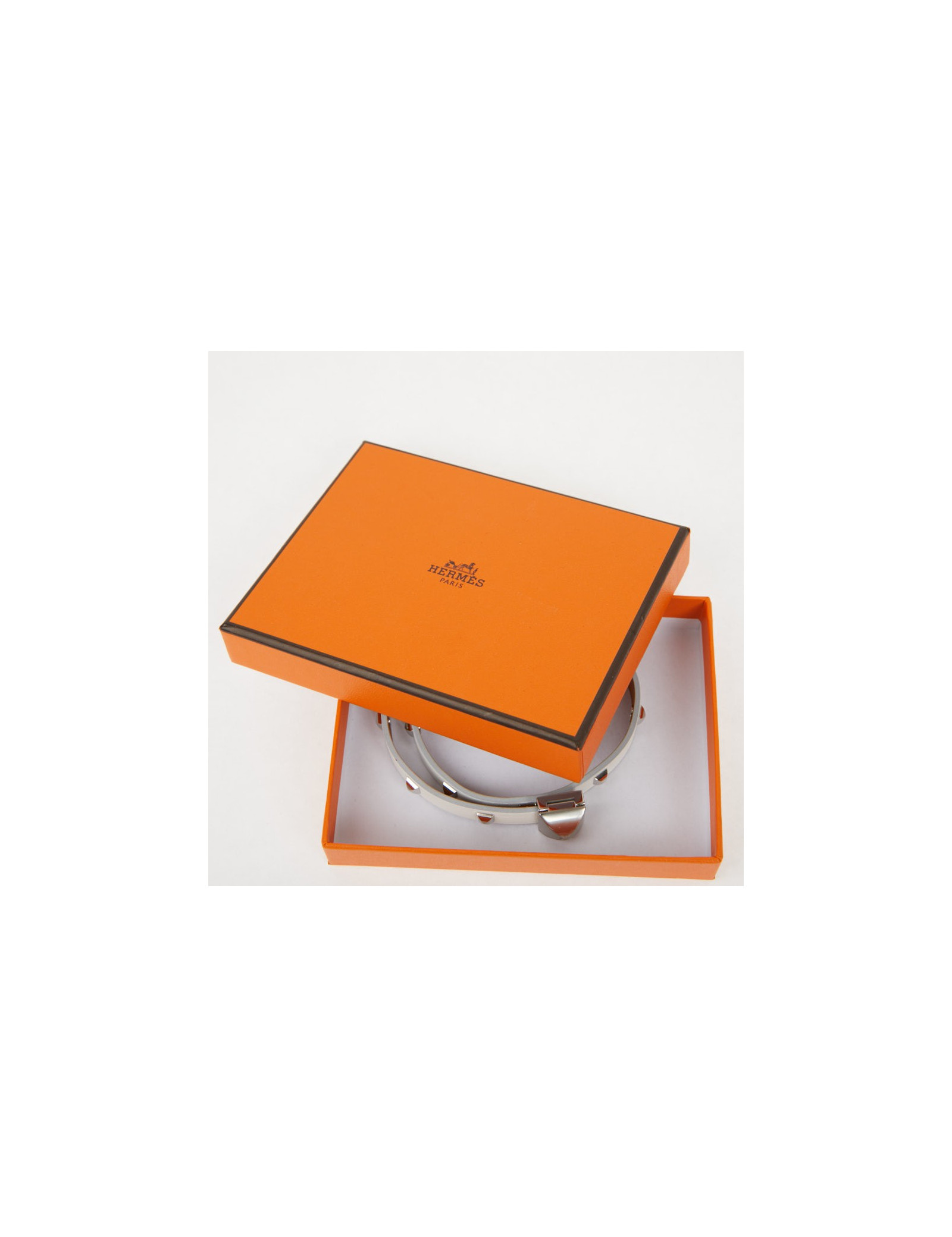 Last items in stock BRACELETS HERMES alligator Collier de chien cuff HERMES 25485 1,450.00 € HERMES alligator Collier de chien cuff Condition: newMade in FranceSize: SMaterials: alligatorColors: sanguineHardware: palladium silver finish metal (plastic protections still on)Letter: T (2015) and S for salesMeasurements: width: 4cm, wrist circumference at its longest: 17 cmDetails: Hermès Dog Collar cuff size S in sanguine alligator leather Advantage... Add to cart