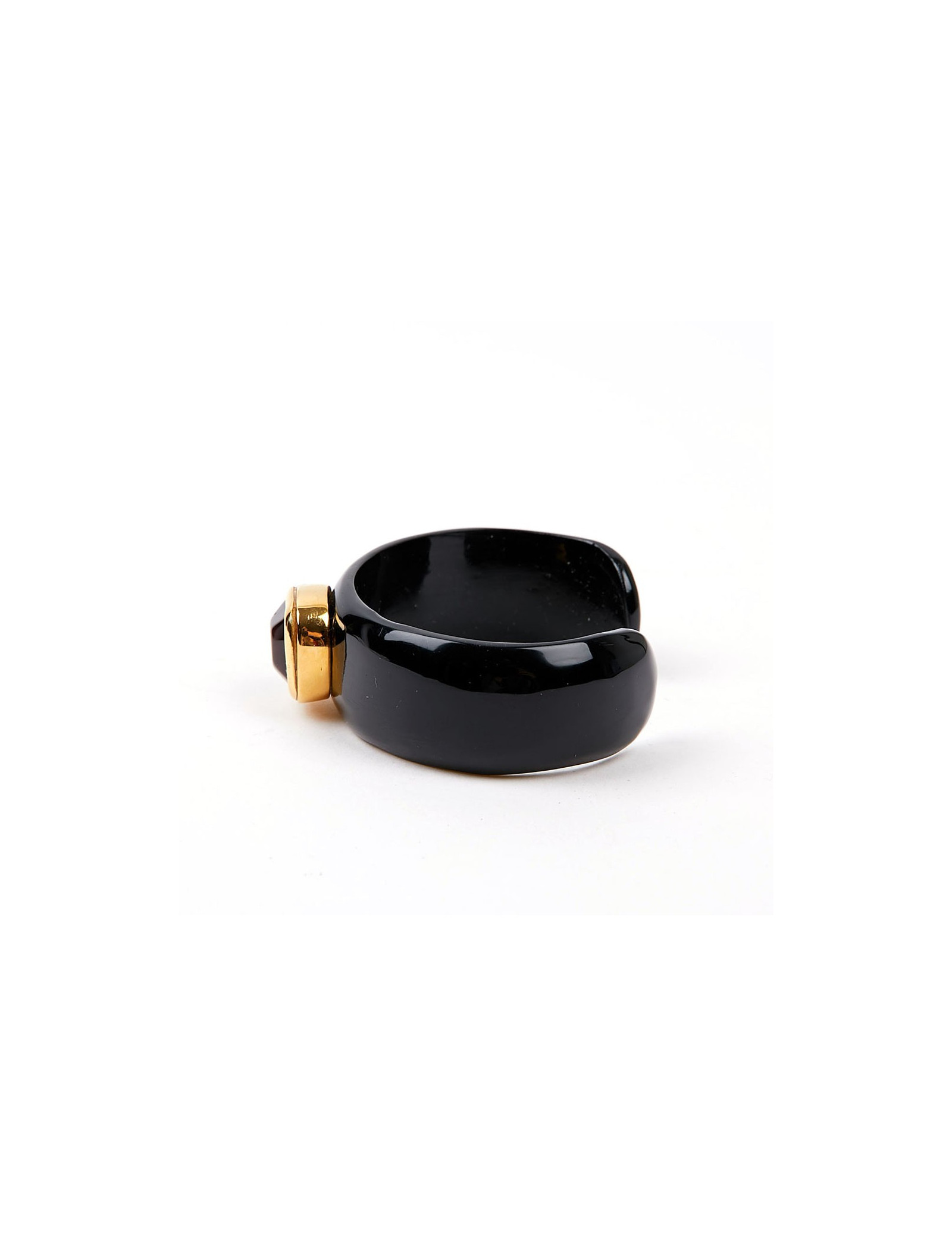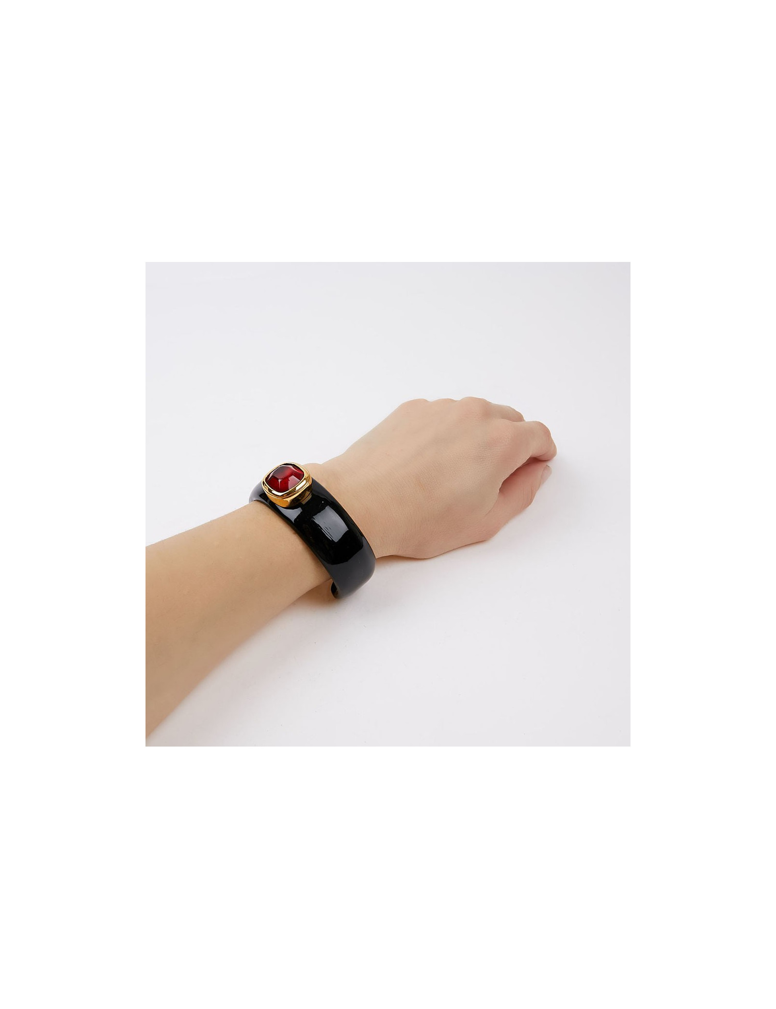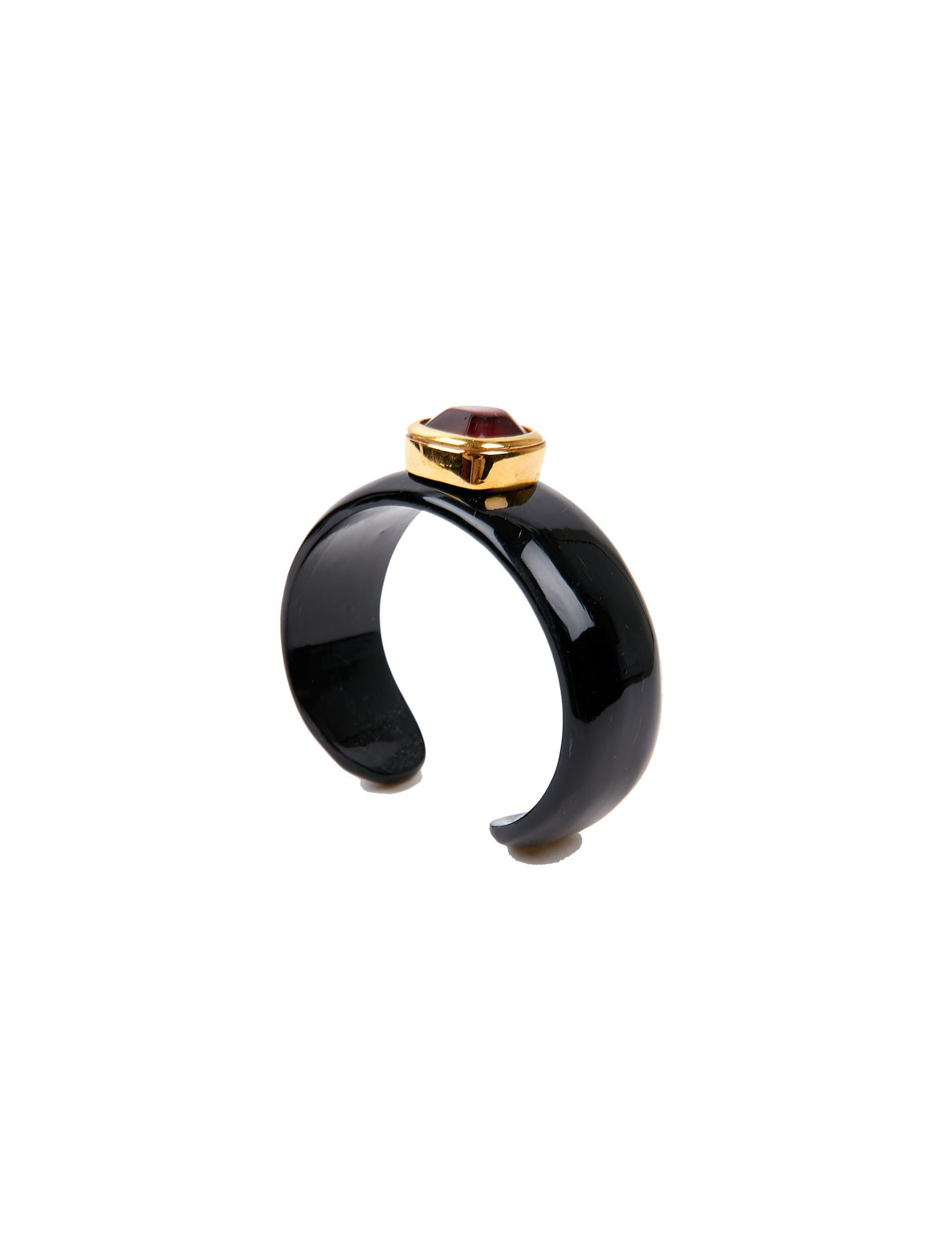 The jewelry was made in the workshops of Monsieur Robert Goossens. The company now belongs to Chanel. Pretty black resin cuff with red-tinted rock crystal cabochon in the center. In very good condition.