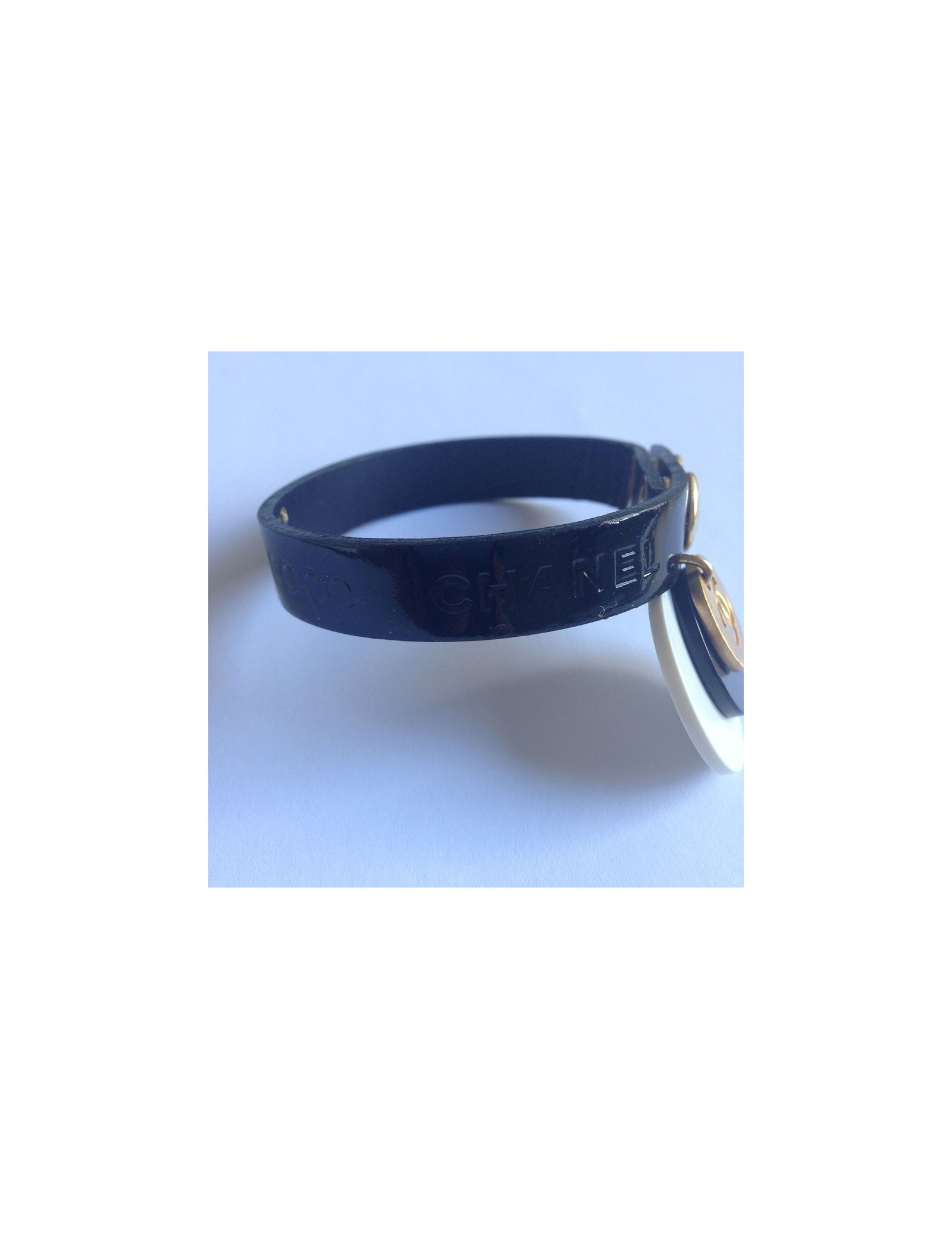 Bracelet Chanel Black patent leather and charms black, white and gold metal CC. On which black patent leather strap and COCO CHANEL.