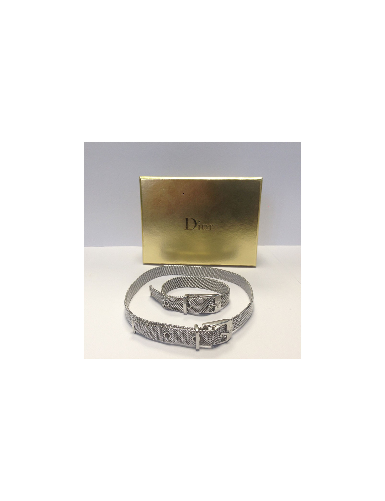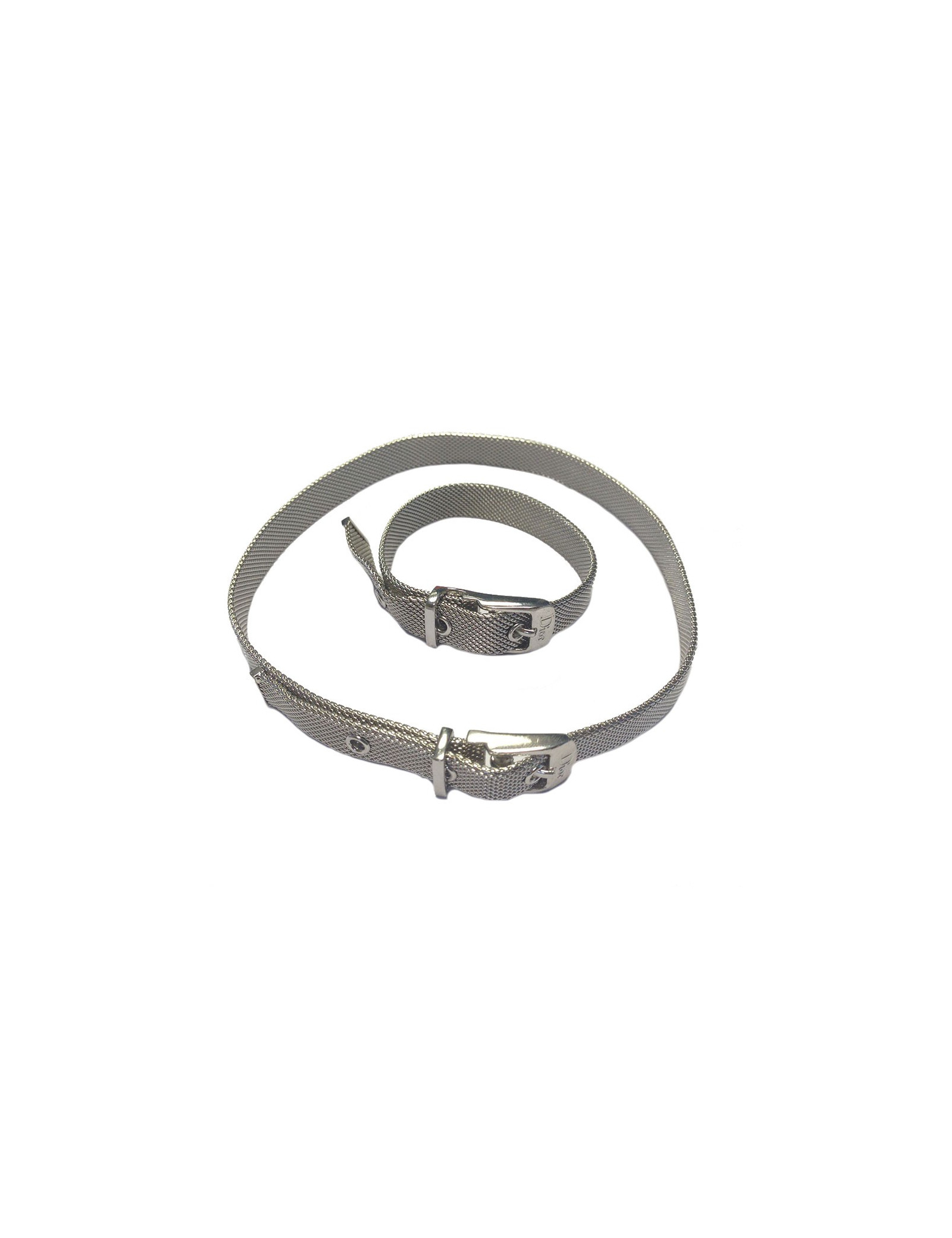 Dior set : necklace and bracelet, in silver metal. Belt clasp with notches. In very good condition.