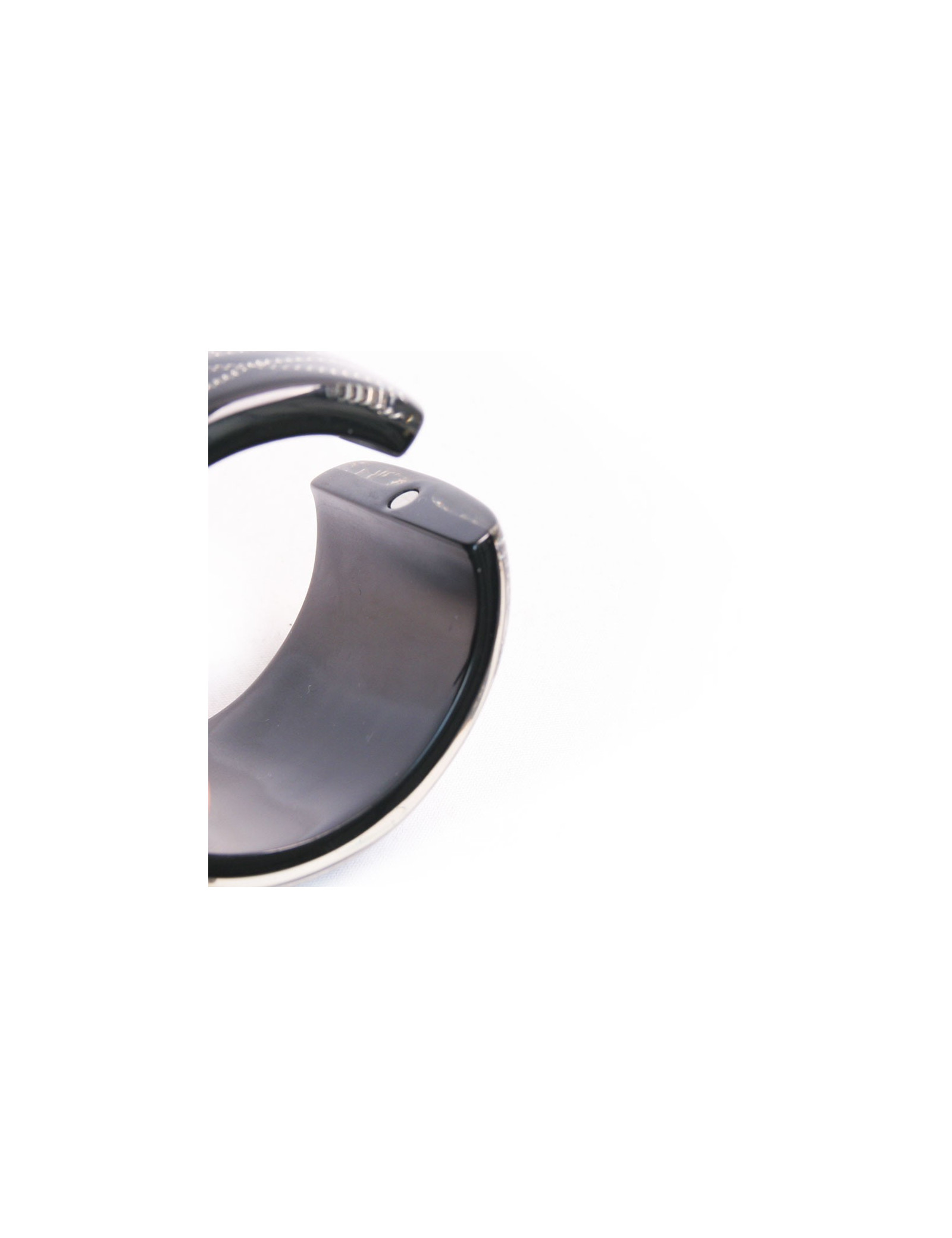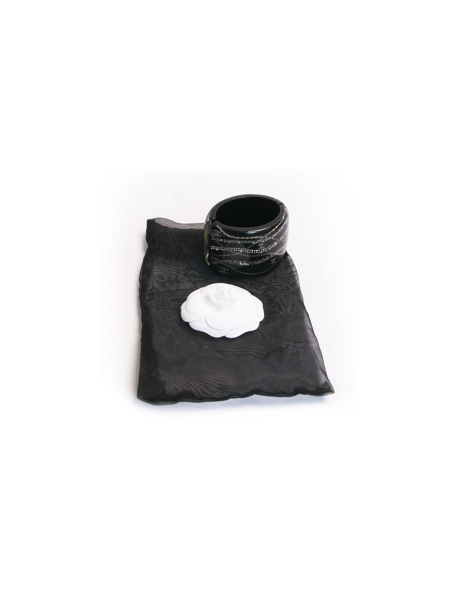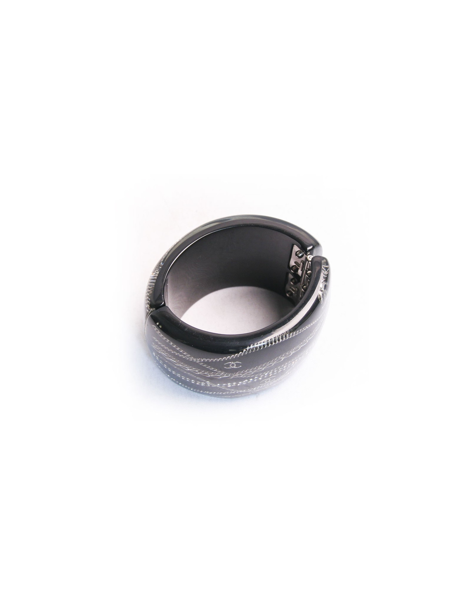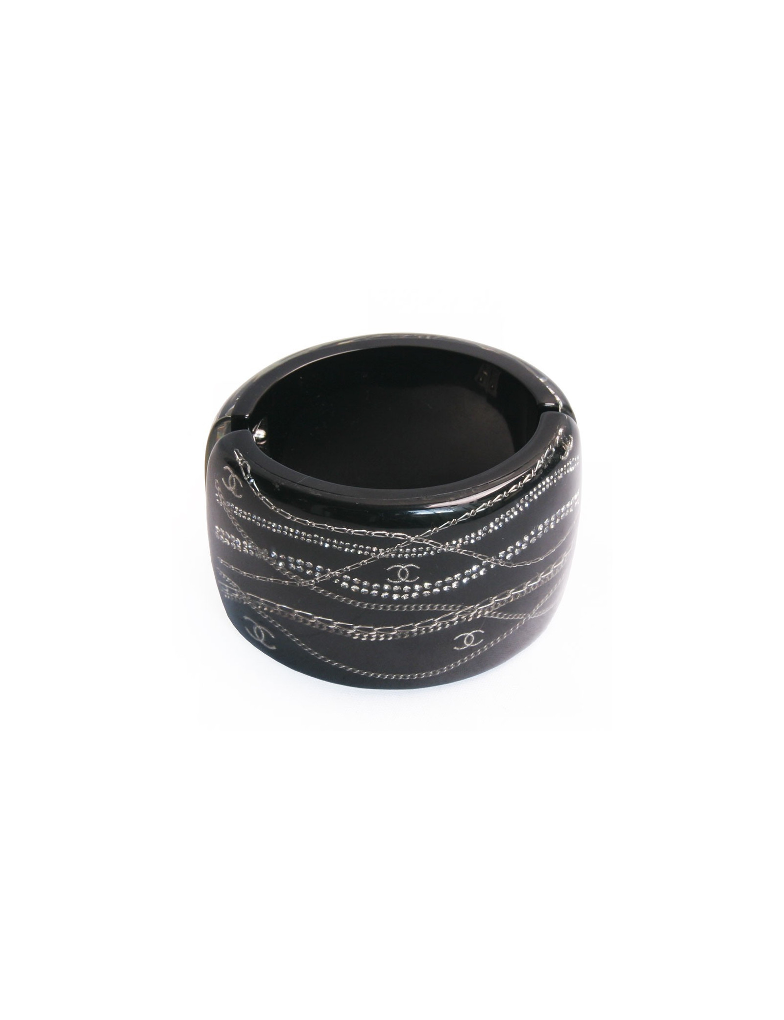 Very nice cuff Chanel enamelled black, with inclusions of double C, aged and rhinestone silver chains. It is closed by a magnet of security. The cuff has some micro-scratches. Good condition. diameter: 6.5 cm - height: 5.5 cm