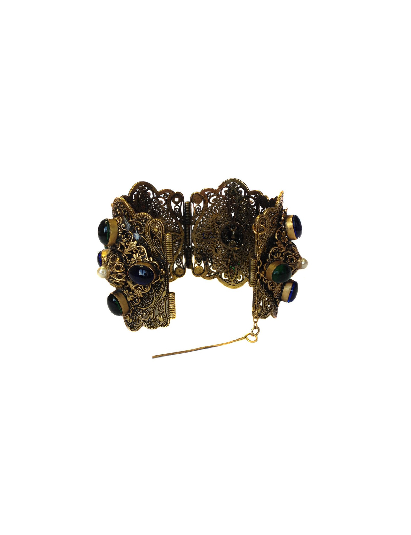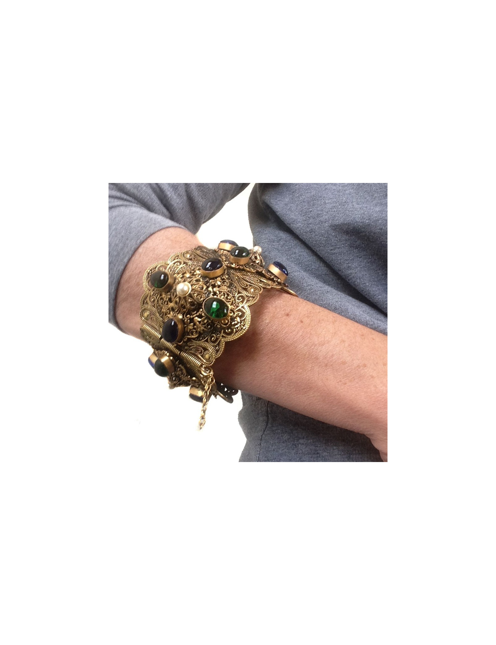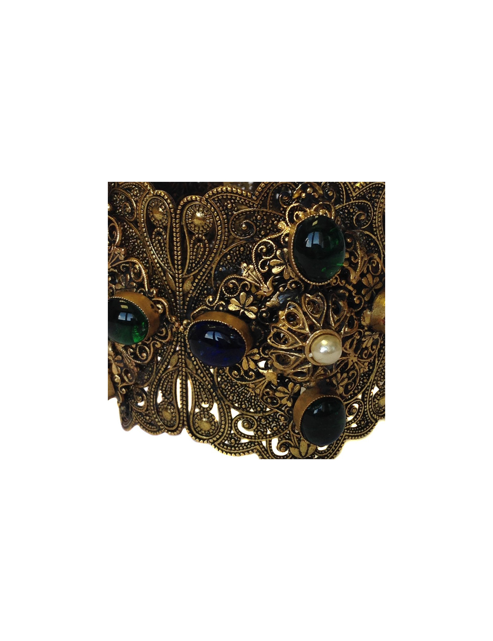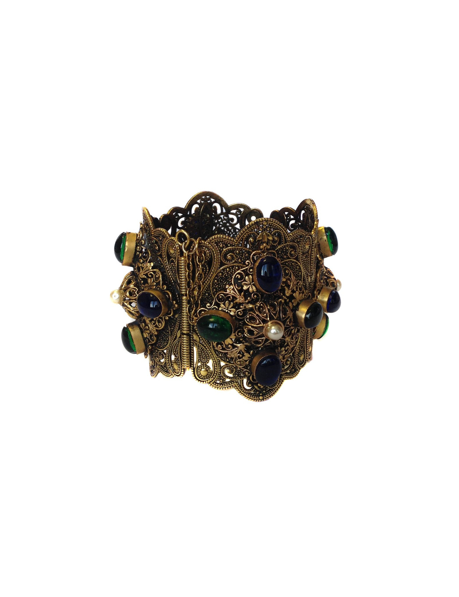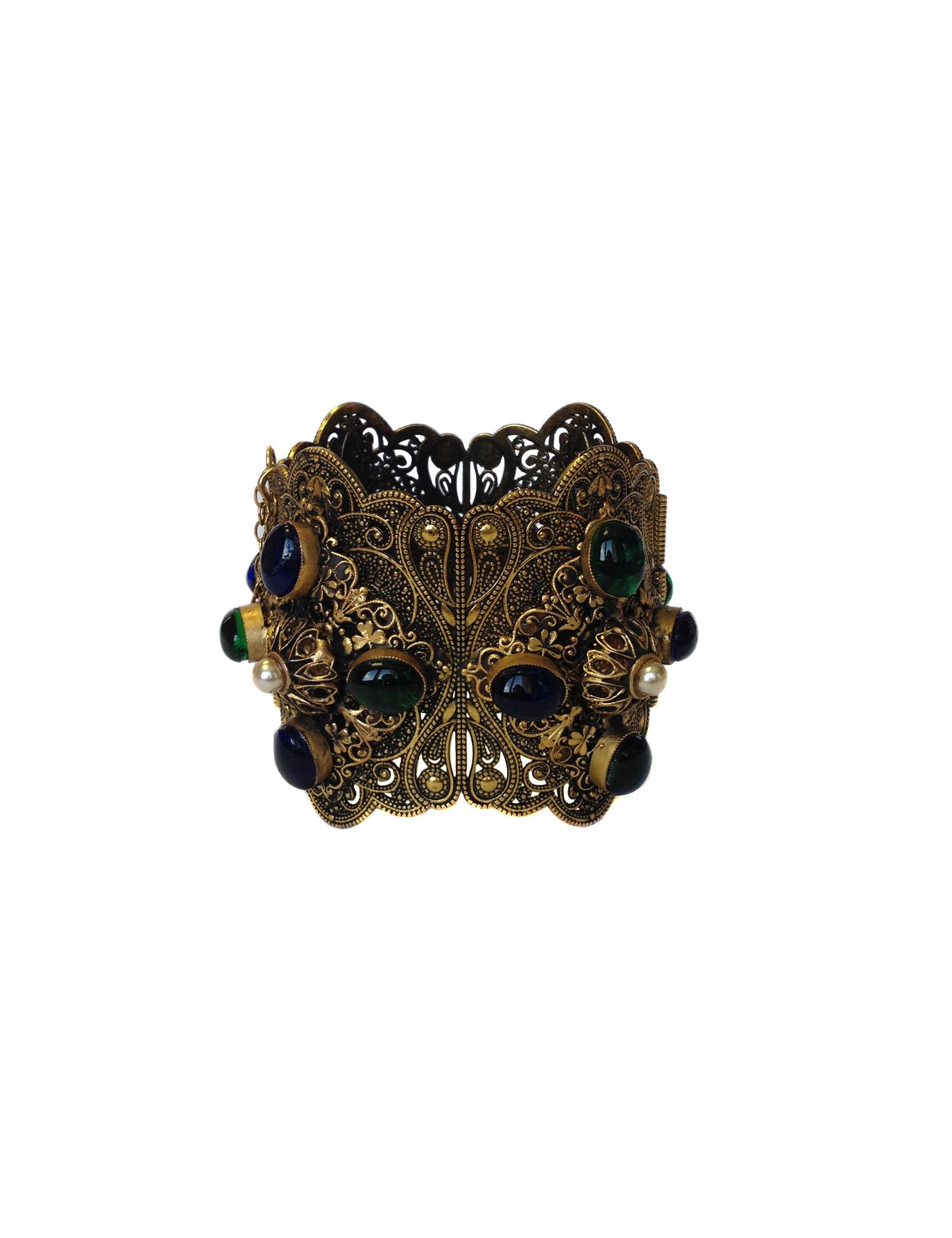 Baroque! Splendide manchette couture Marguerite de Valois en métal or vieilli filigrané et travaillé, demi perles nacrées et pâte de verre multicolore: vert émeraude et bleu saphir. Fermoir avec chaînette. Jamais portée