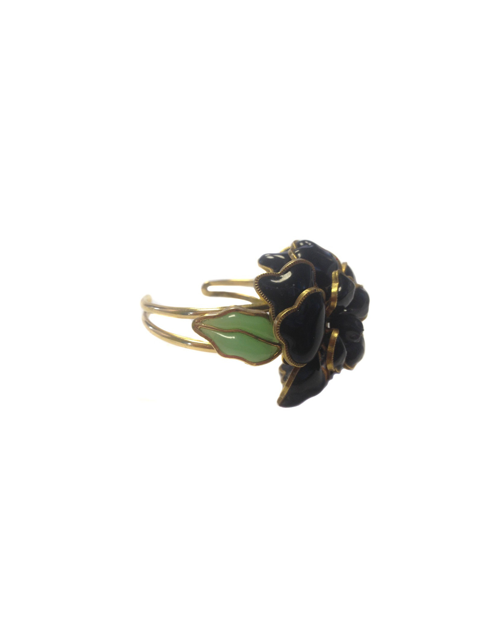 Details: Magnificent Marguerite de Valois couture bracelet. Gilded metal frame, large molten black glass flower, jade-colored molten glass leaf and leaf topped with Swarovski rhinestones.