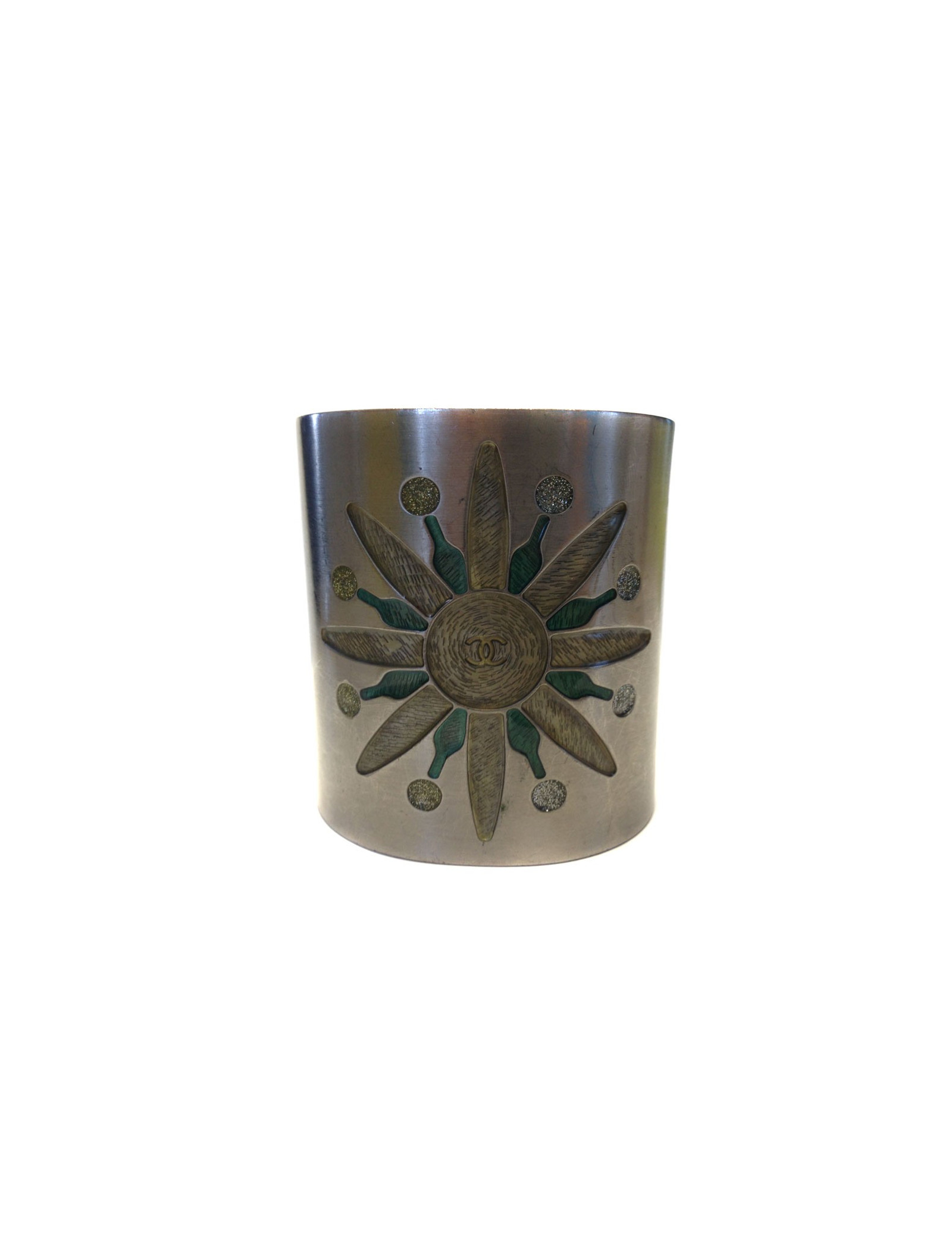 Very beautiful CHANEL cuff rigid silver metal, fall 1999 collection. Engraved in the metal, colored in green and yellow flower with a resin, with in its centre a CC. In good condition, few scratches on the cuff.