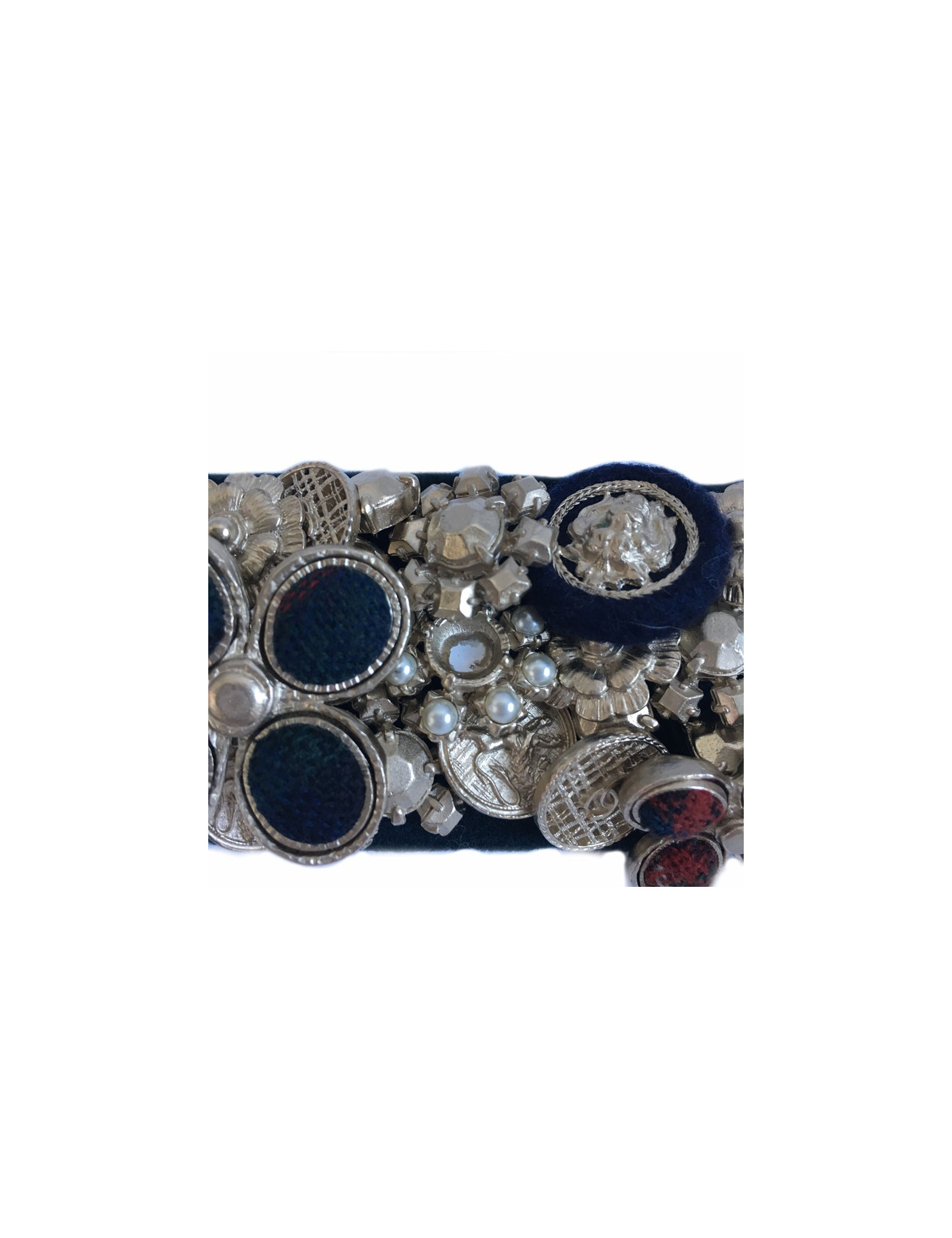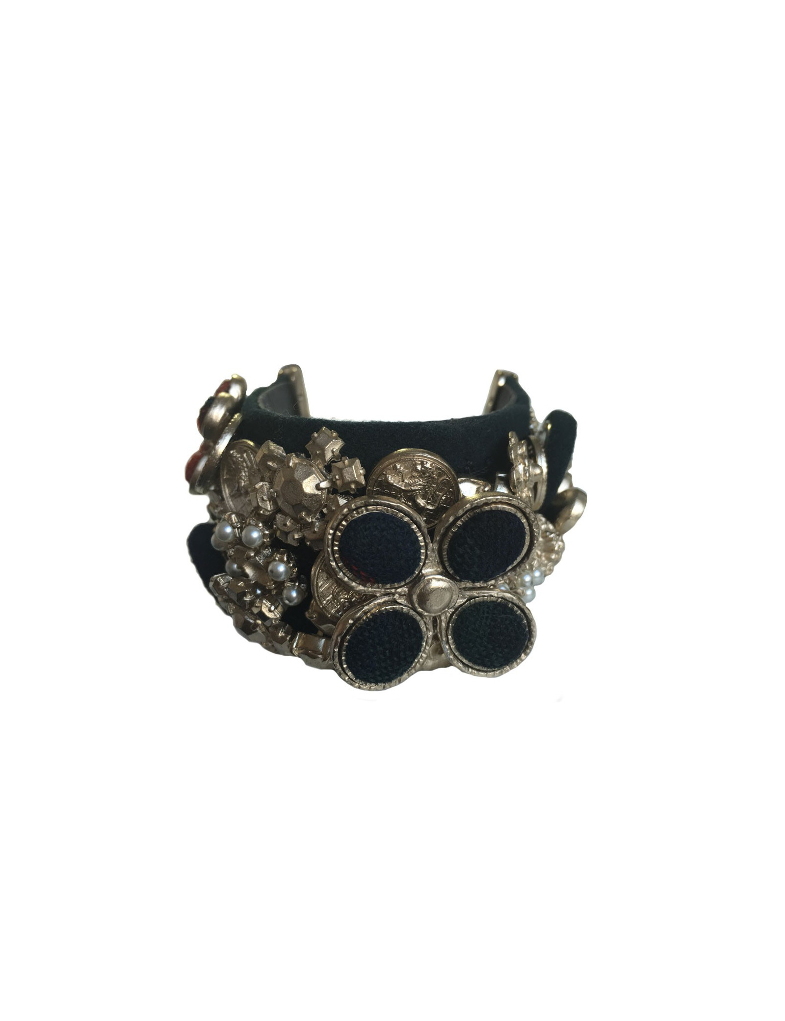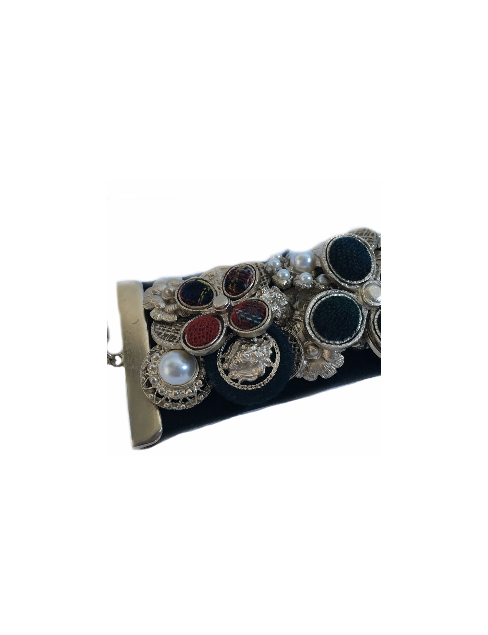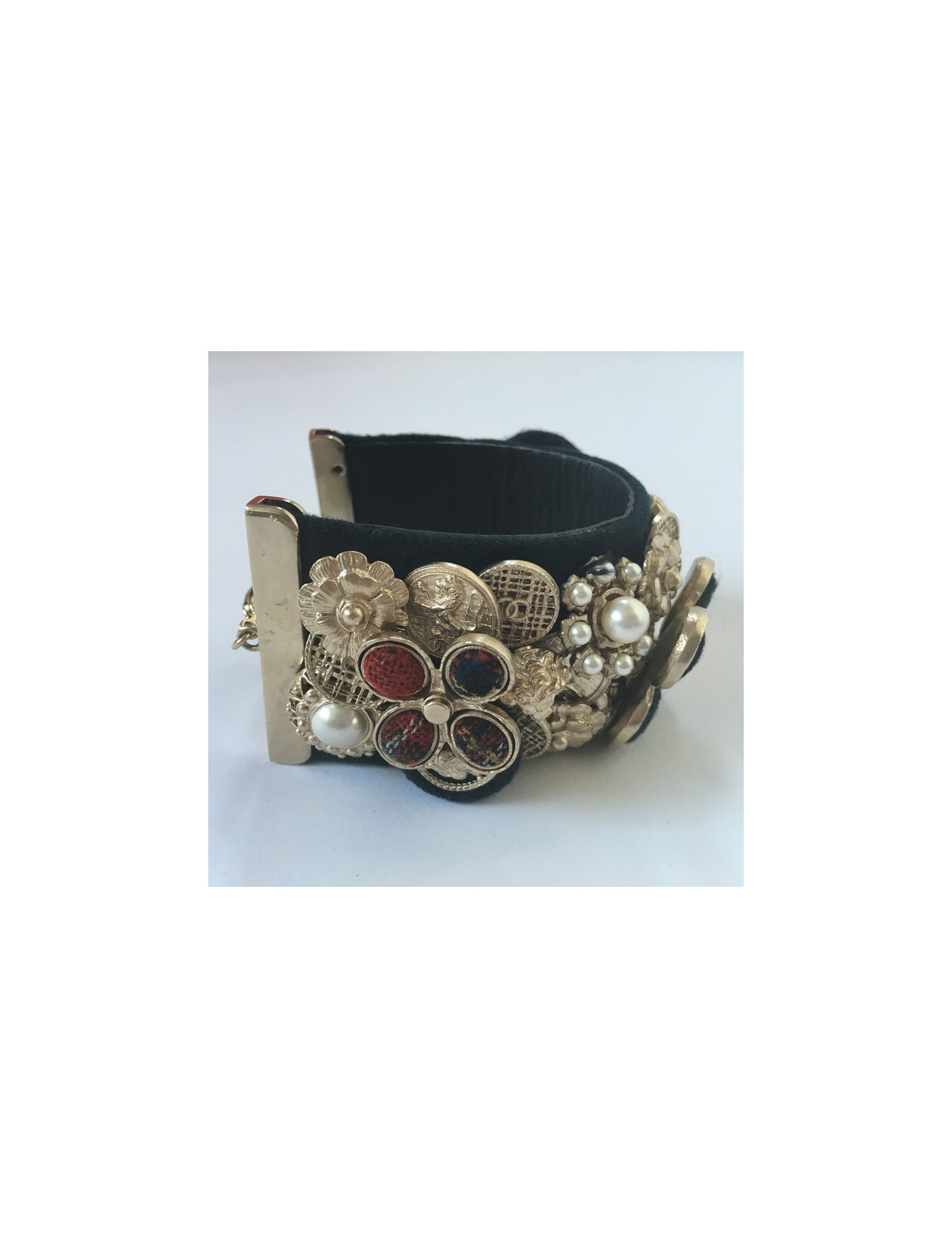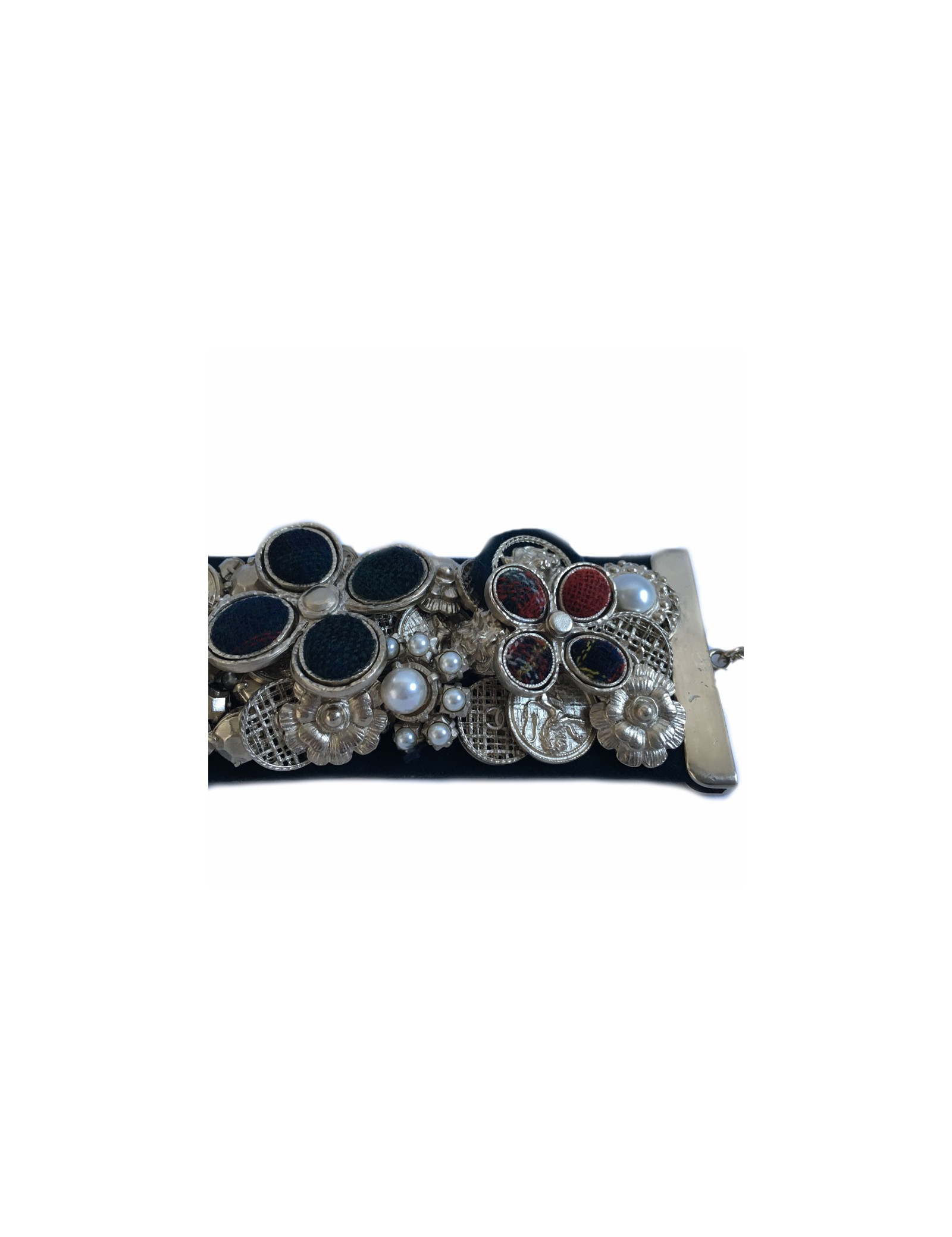 Splendid News CHANEL "Paris-Edinburgh" cruise collection. Cuff in leather and blue velvet failure marine. Panels of flowers, buttons, golden metal parts, covered with Pearly beads, Velvet the plaid failure. On a flower in the middle of the cuff is missing the Central Pearl.