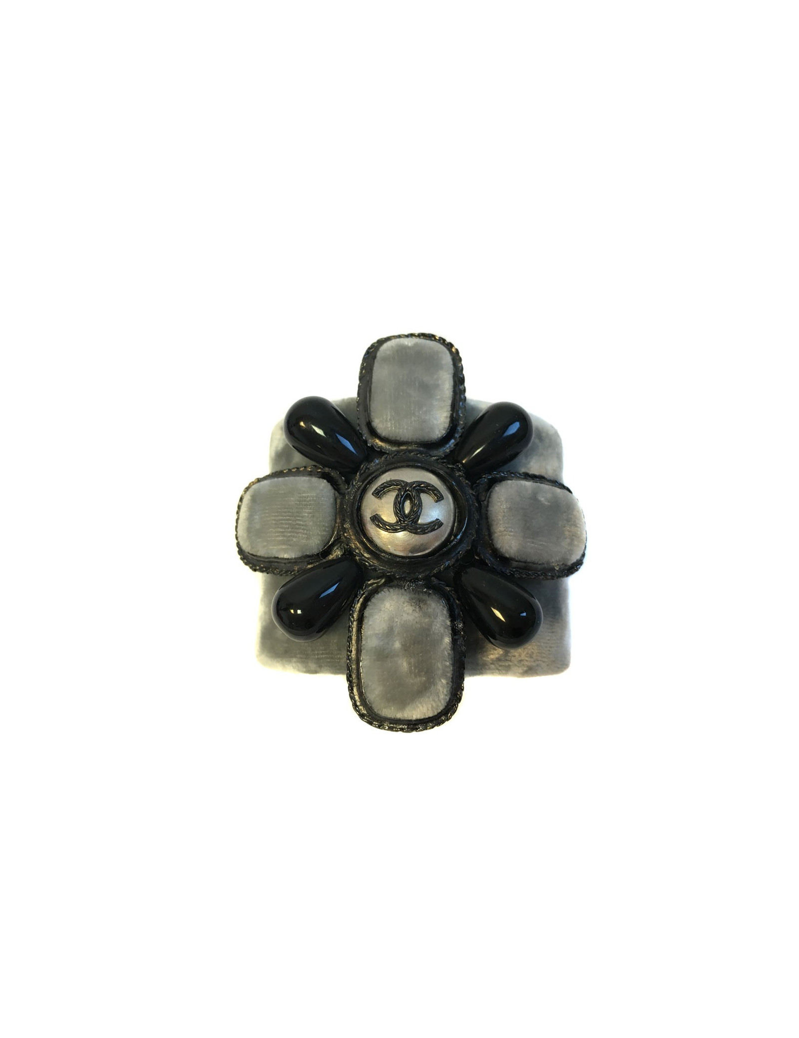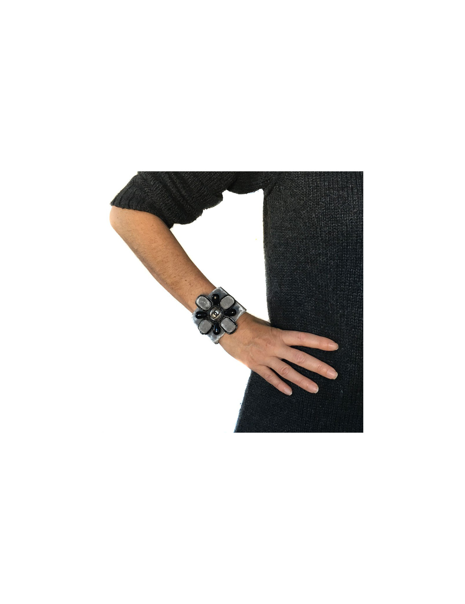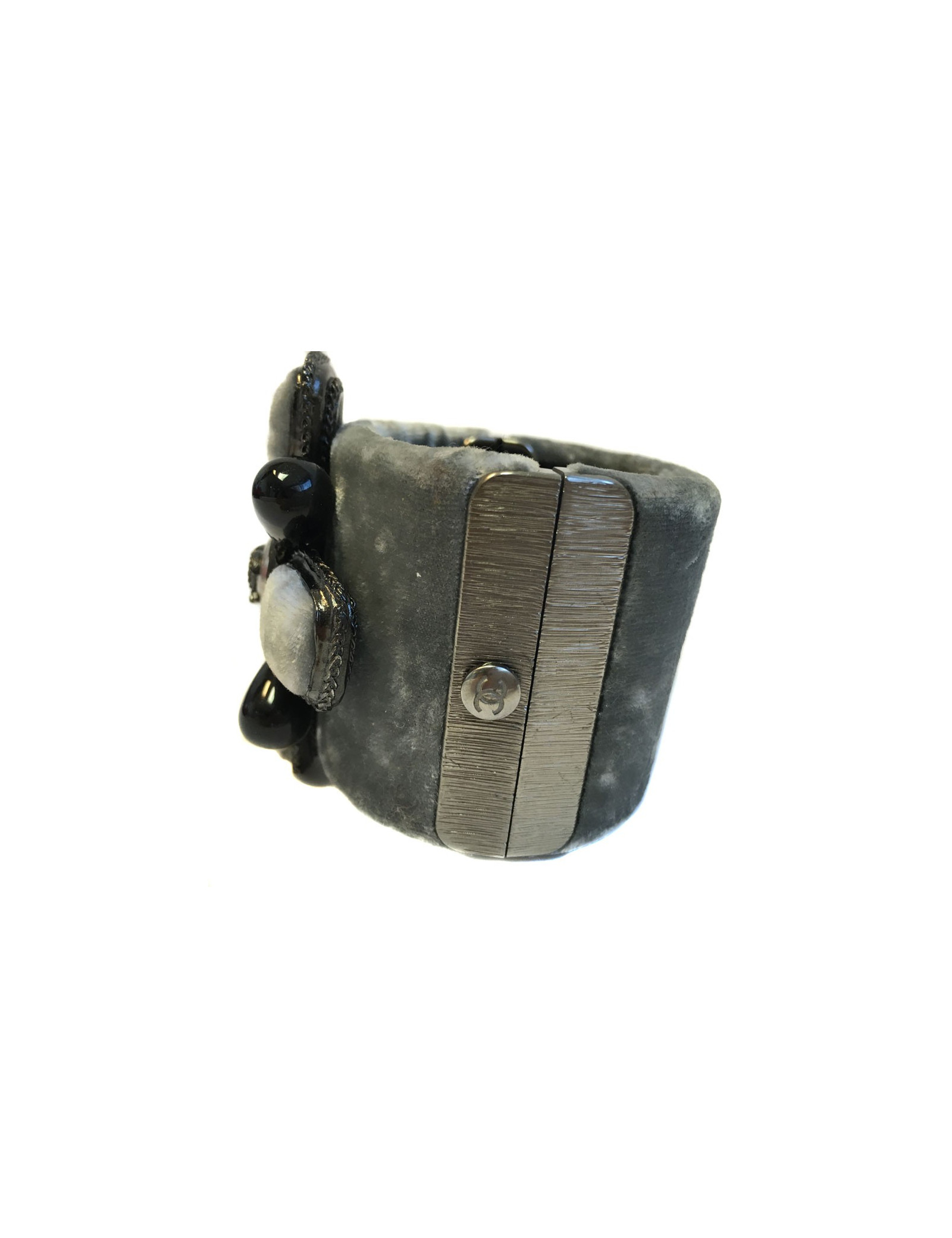 Beautiful CHANEL cuff down velvet gray and black glass paste. Cuff in ruthenium. The joint is brushed silver metal. A CC in braided ruthenium is located in the center of the bracelet affixed to a round piece silver metal. The clasp is a decorated slipper of a CC.