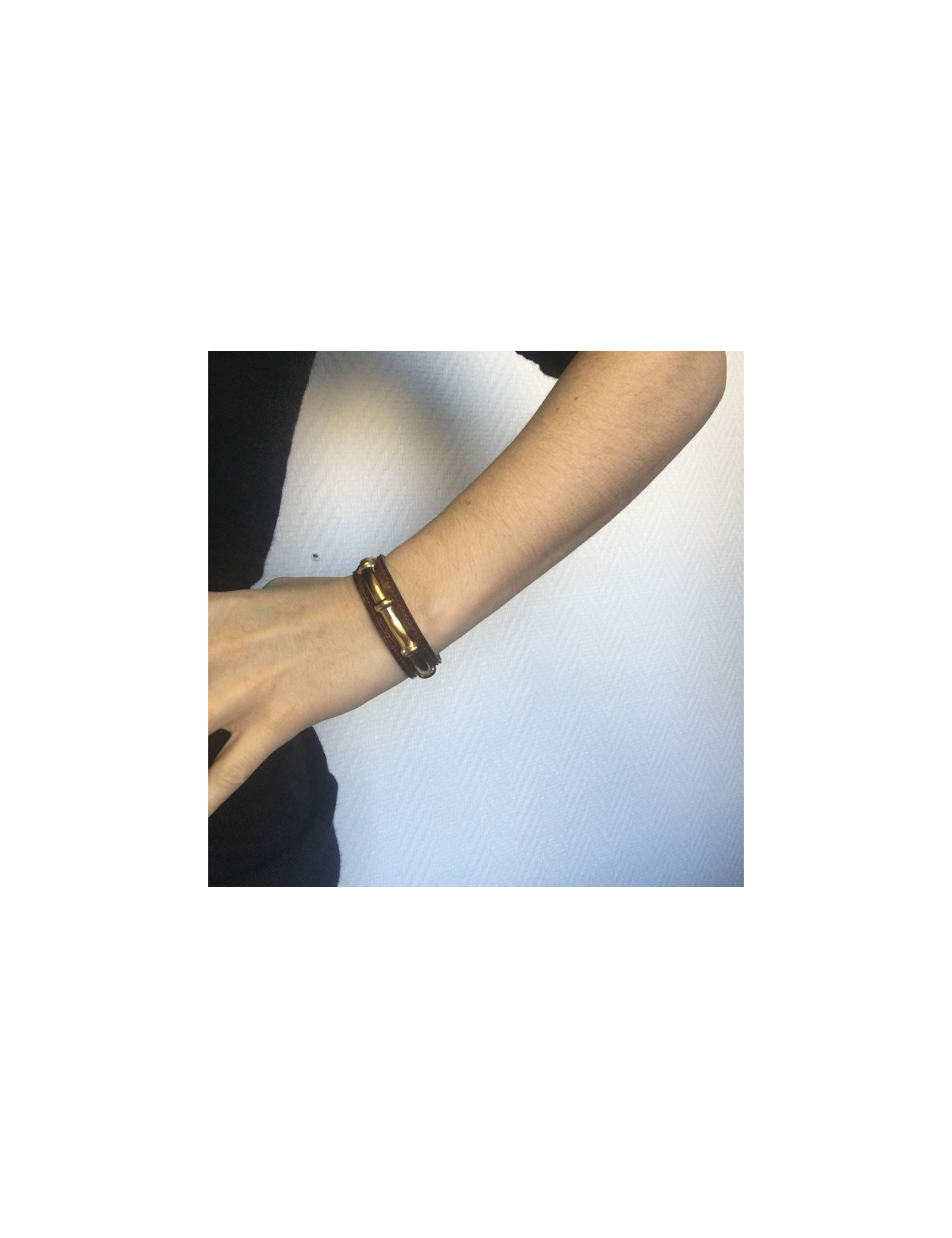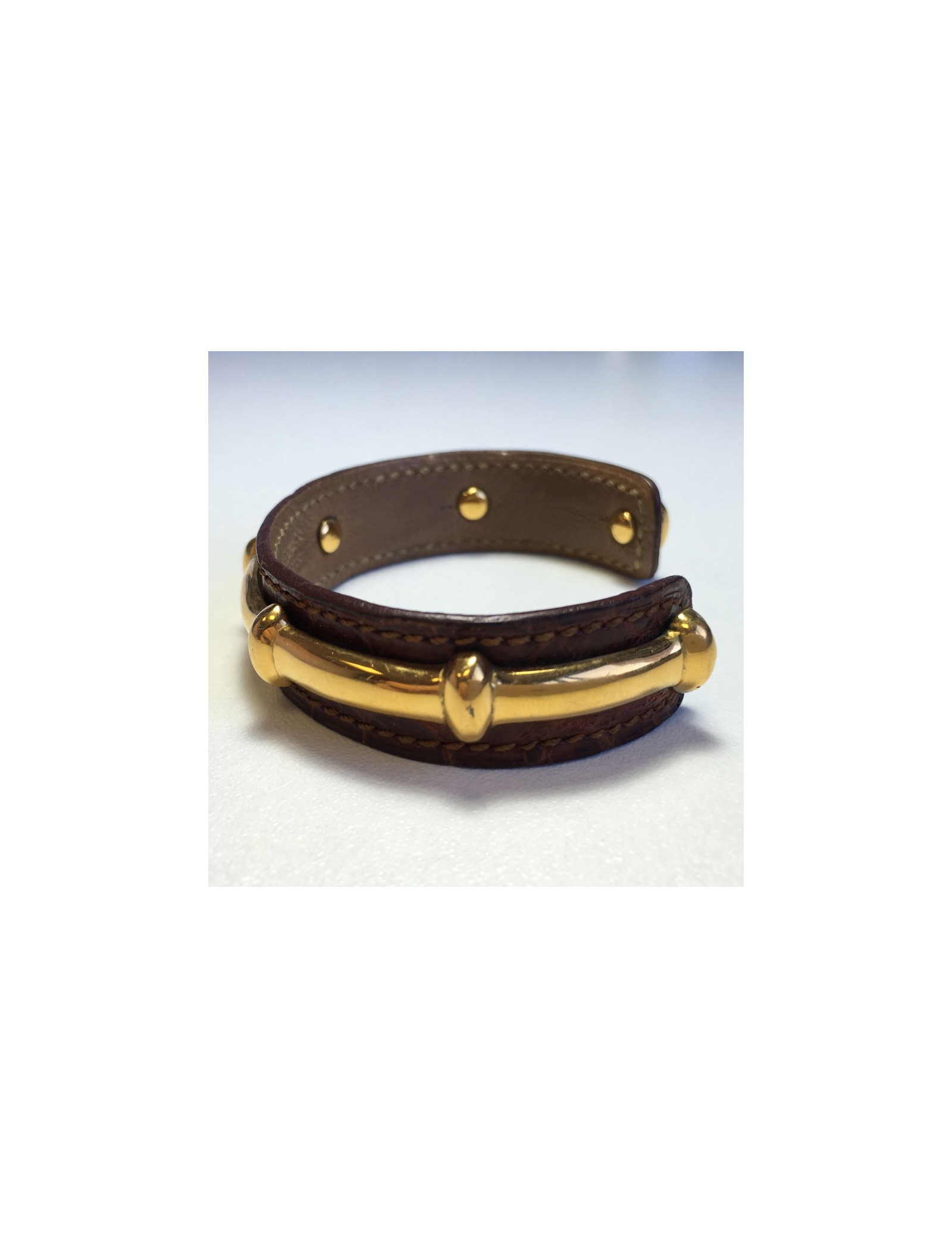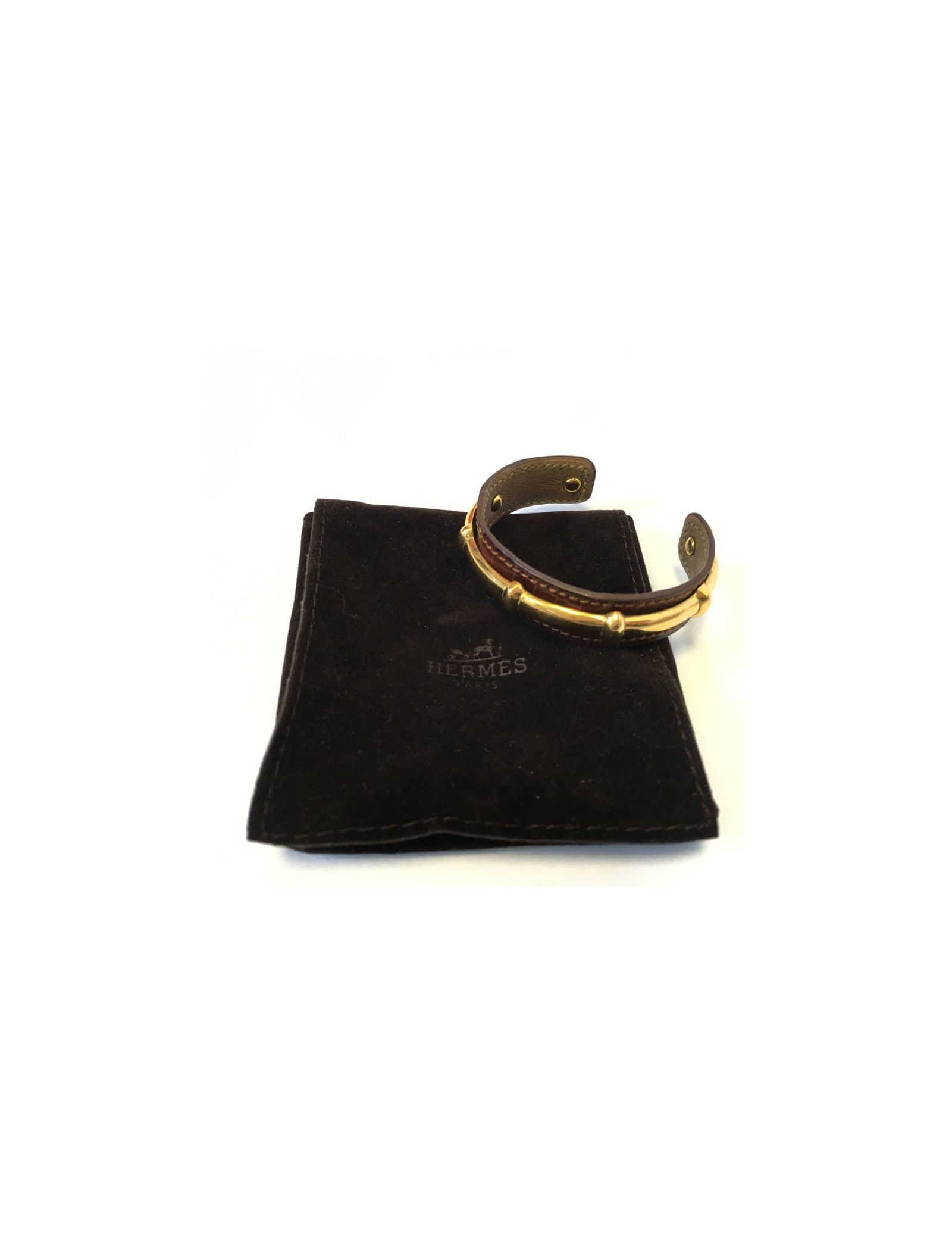 HERMES bracelet in brown leather and gold form metal bamboo. Rigid bracelet. In very good condition. Of small micro scratches on the jewelry. Name of the trade mark engraved on one end.