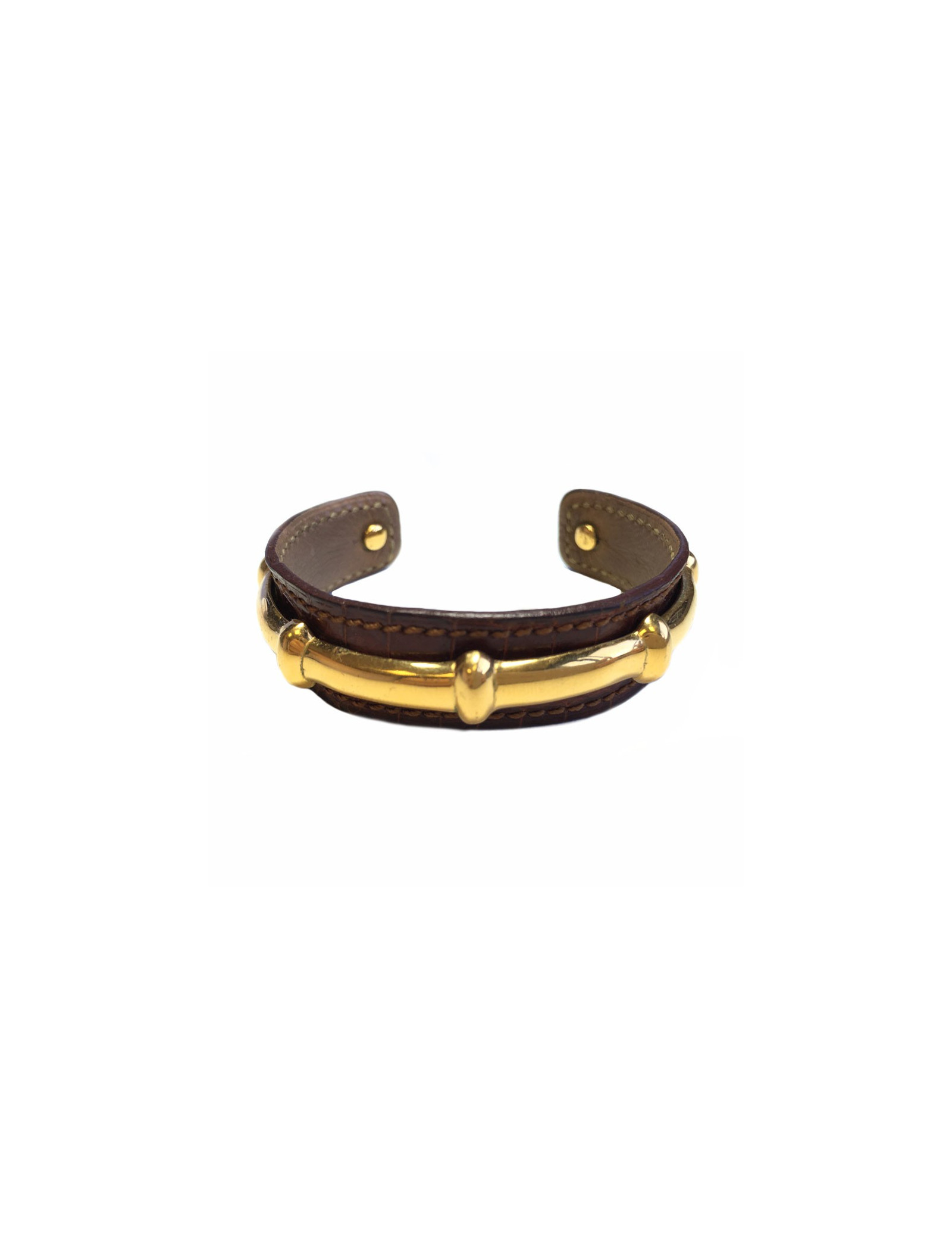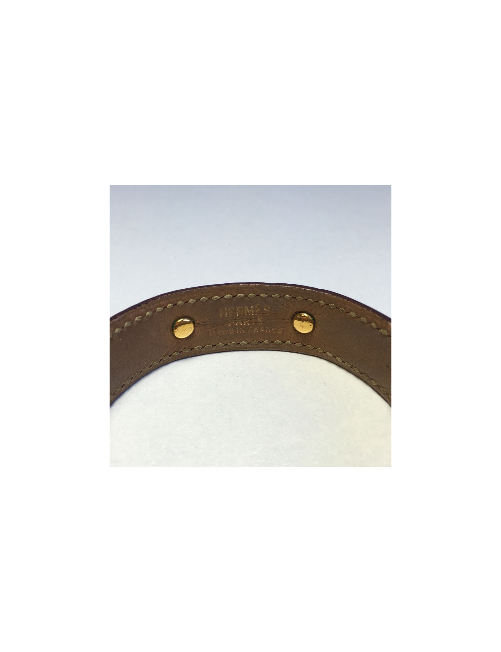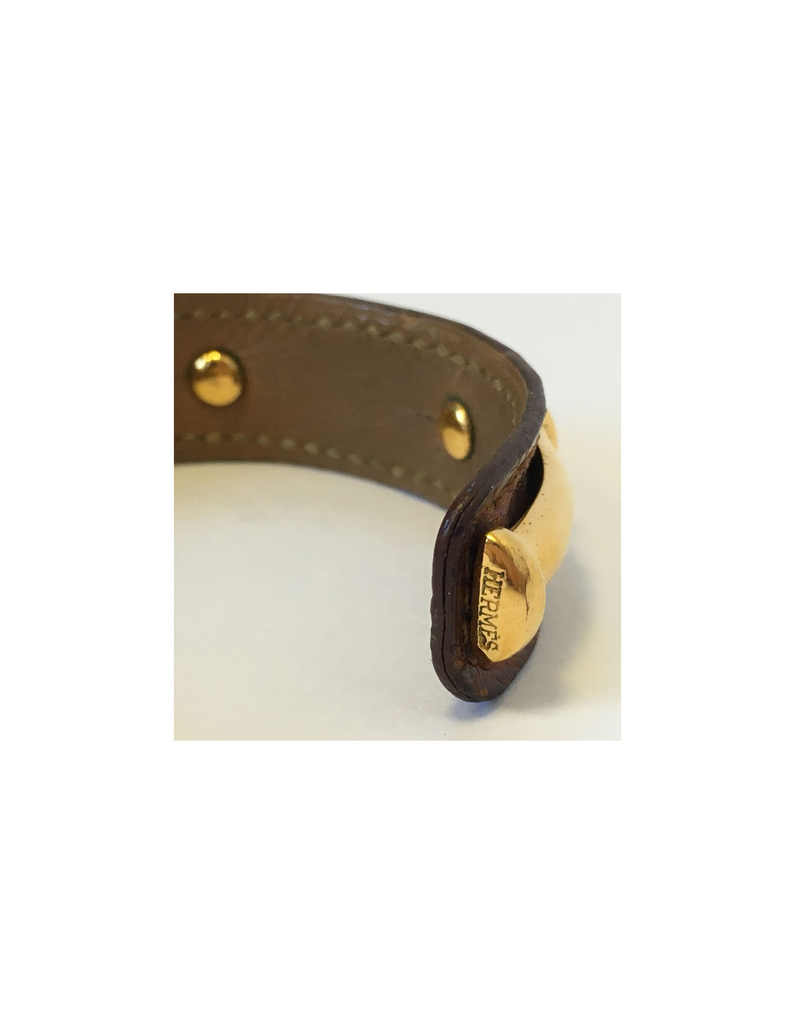 HERMES bracelet in brown leather and gold form metal bamboo. Rigid bracelet. In very good condition. Of small micro scratches on the jewelry. Name of the trade mark engraved on one end.