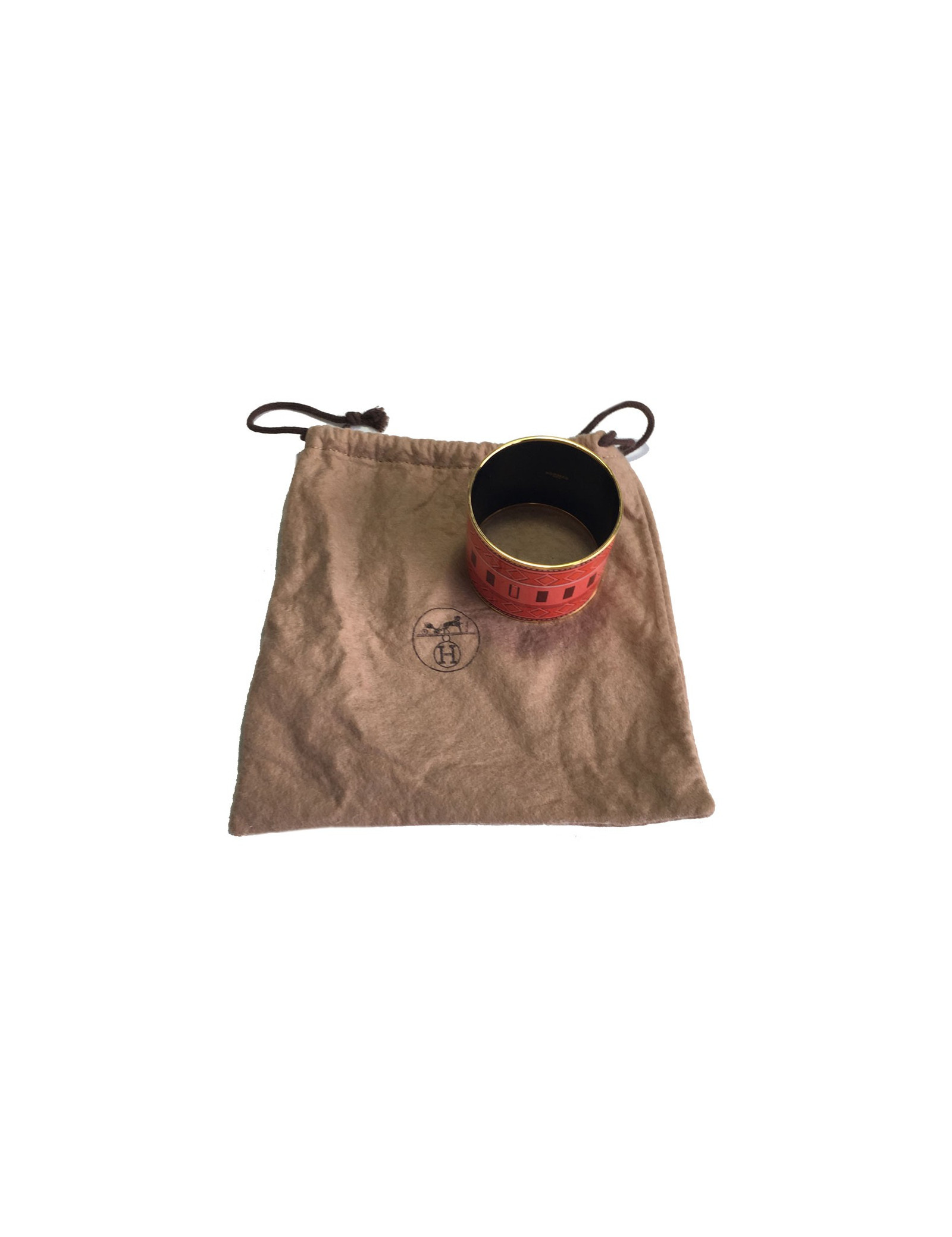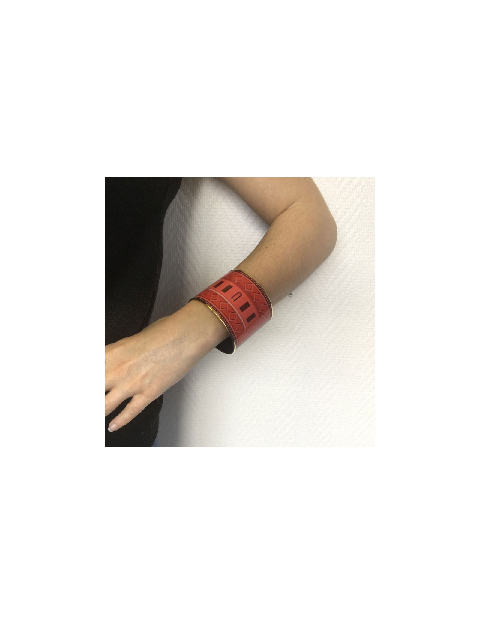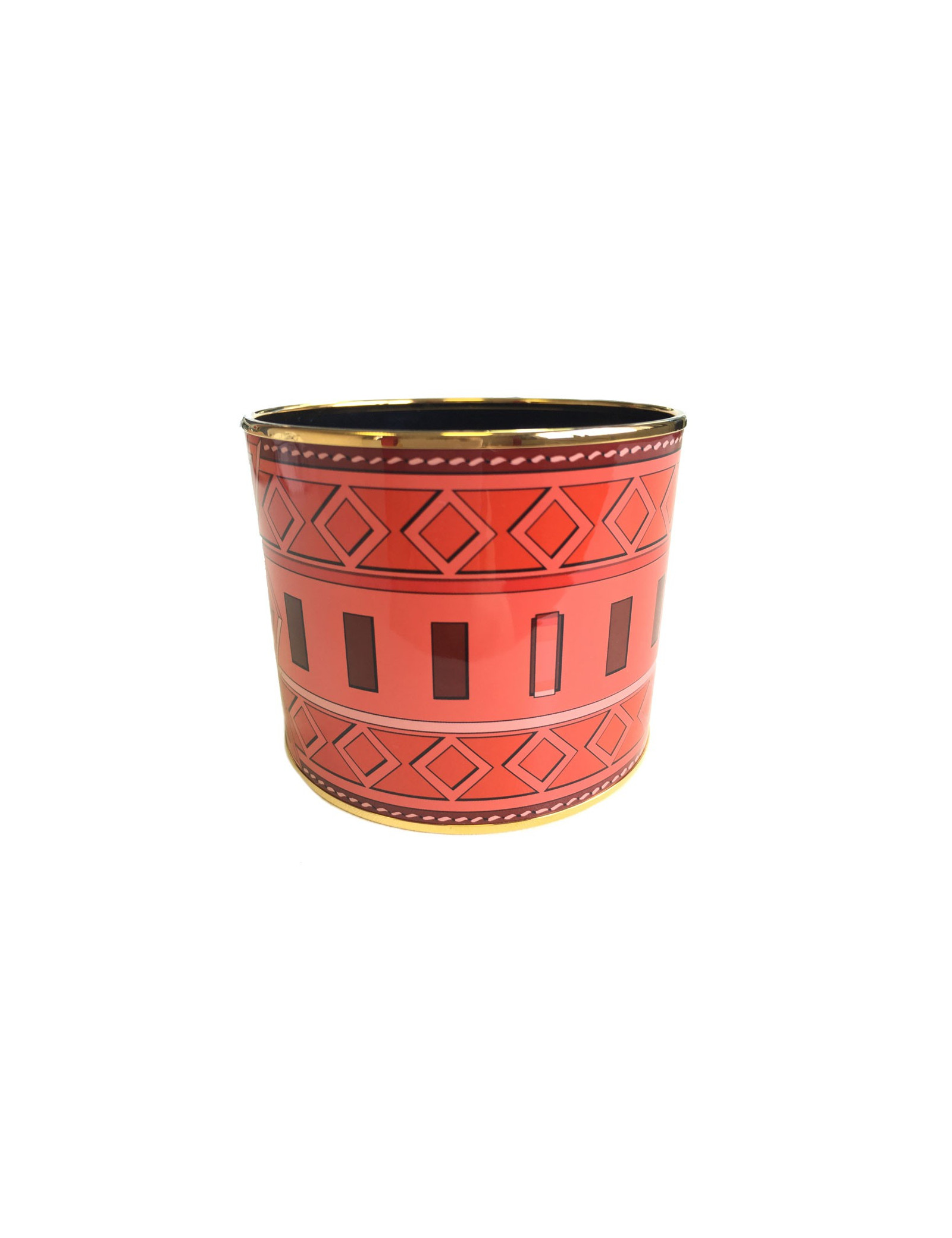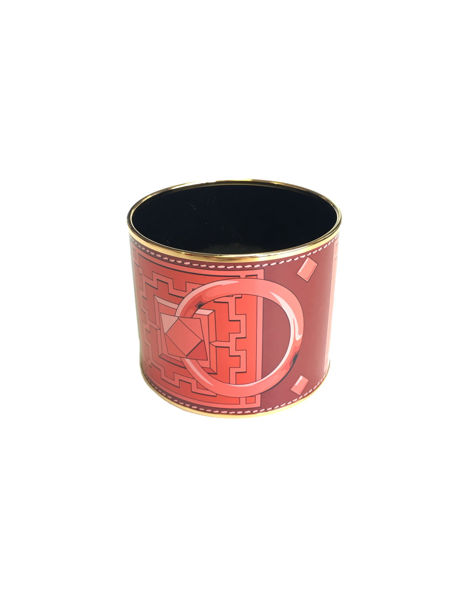 Mega wide bracelet in red and pink HERMÈS enamel. The drawings are fine in red tones, dregs of wine and pink. The strapping is plated gold. Scratched 'Made in France + P'.