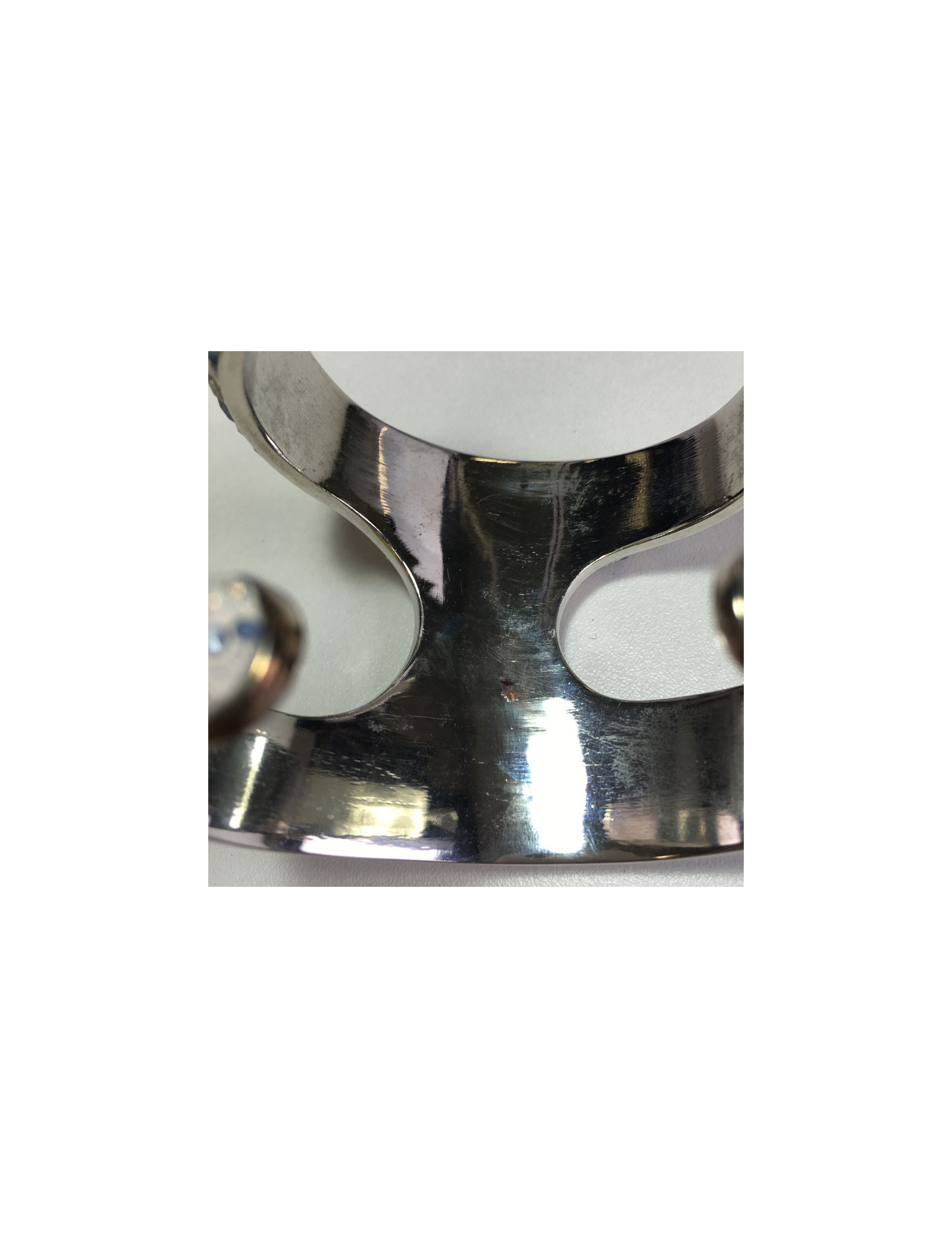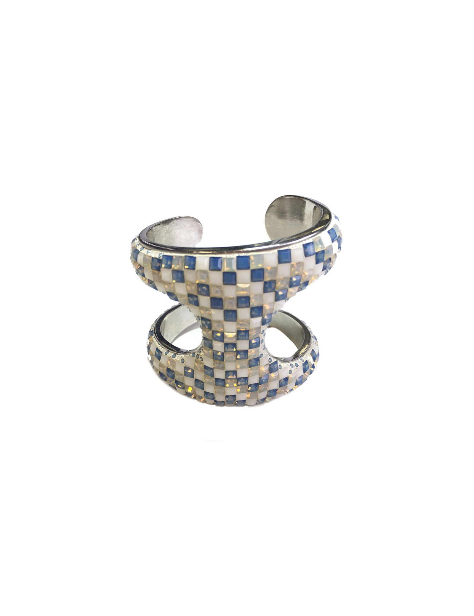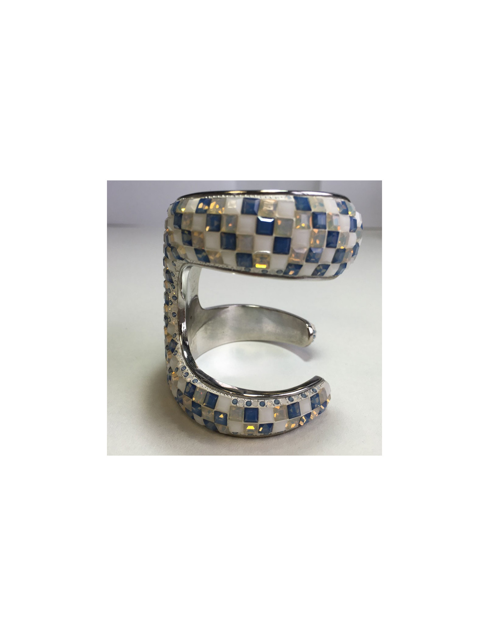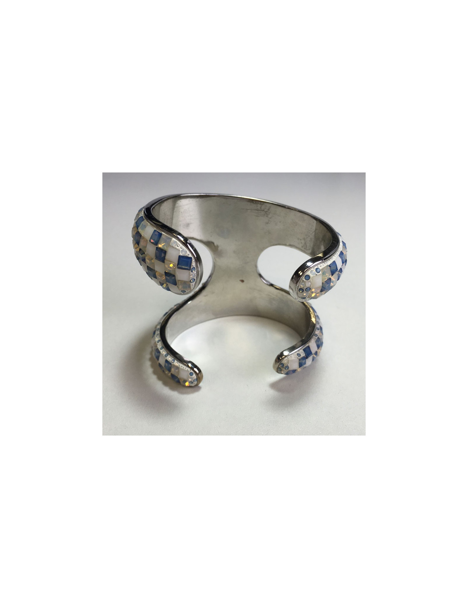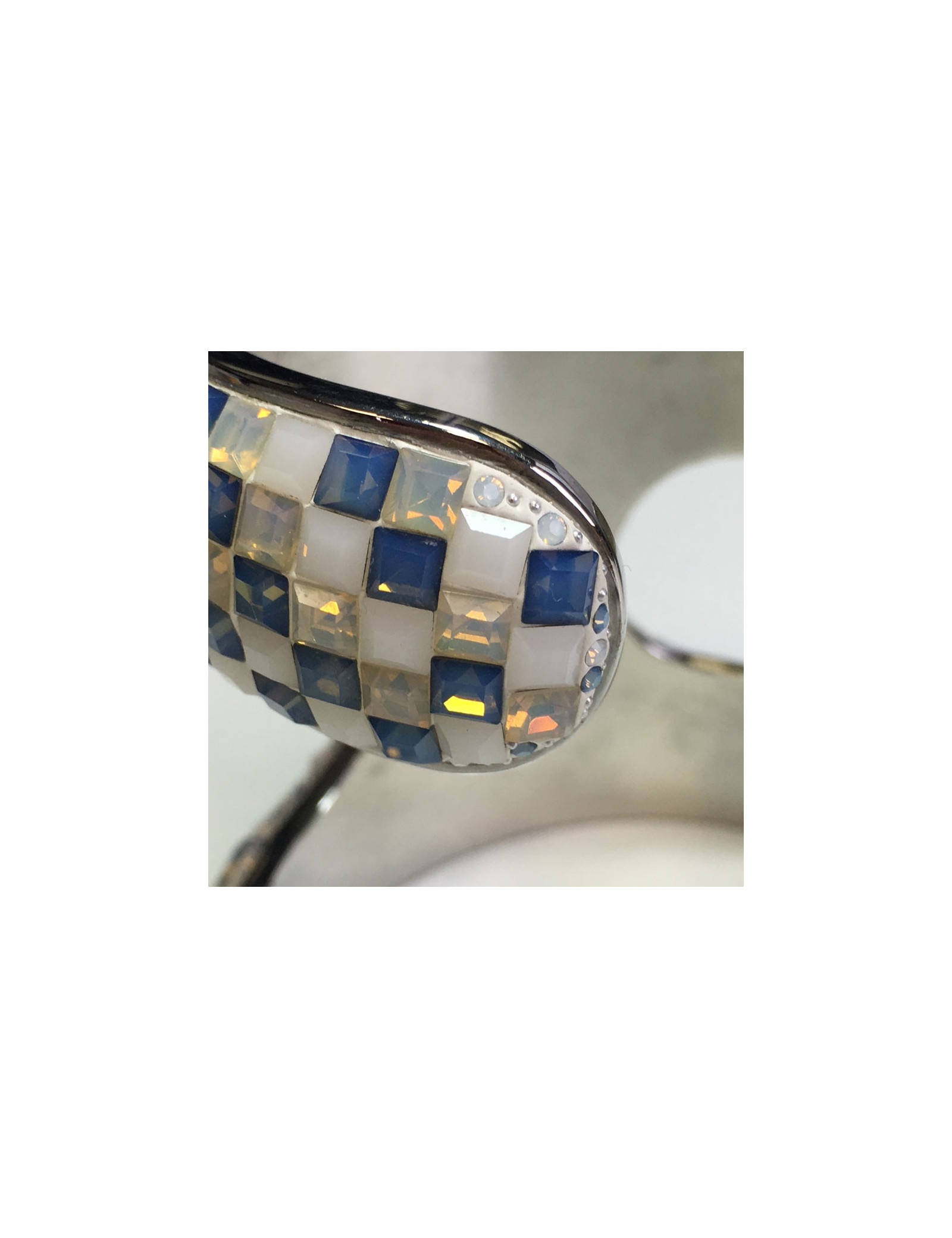 Manchette double en céramique et cristaux swarovski bleu, blanc et transparent, finition en métal argenté. Effet très estival.